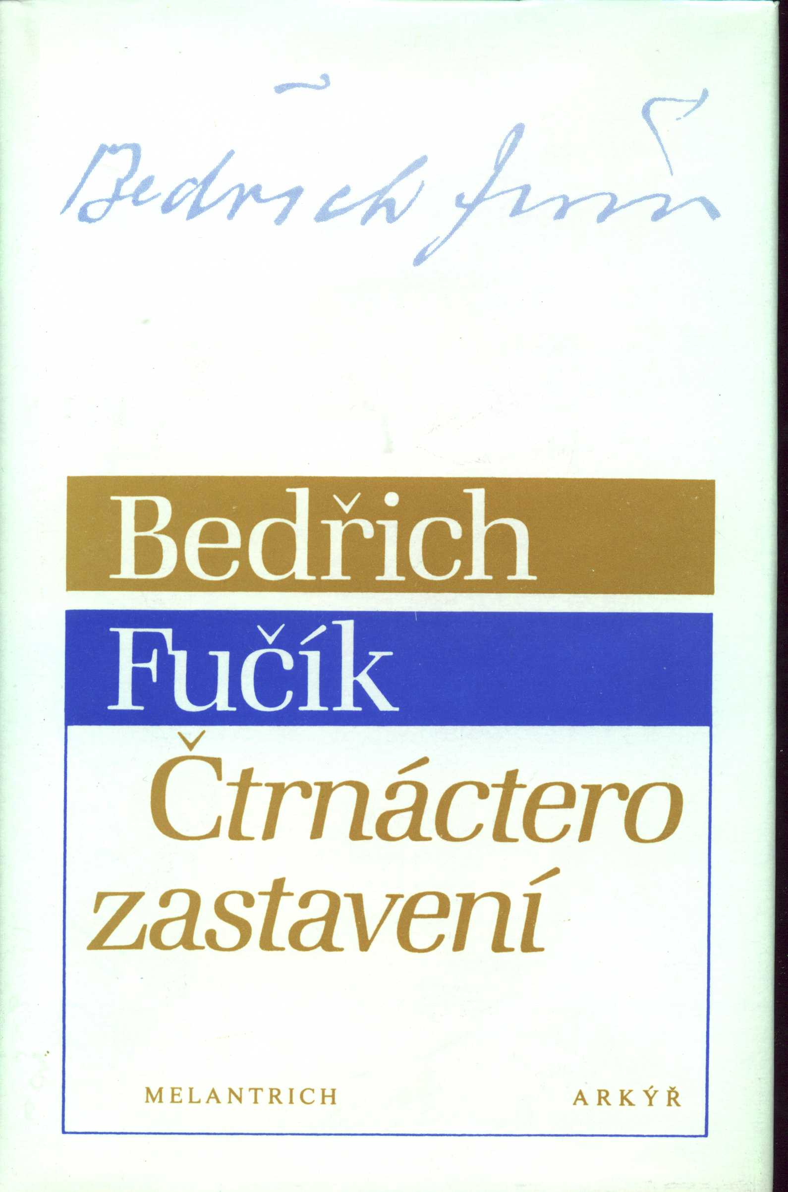 Názvové údaje Čtrnáctero zastavení / Bedřich Fučík ; edičně zpracovali Vladimír Binar a Mojmír Trávníček ; typografickou úpravu navrhl a k tisku připravil Karel Jadrný ; přebal a vazba Zdeněk Stejskal Osobní jméno Fučík, Bedřich, 1900-1984 (Autor) Další autoři Binar, Vladimír, 1941-2016 (Editor) Trávníček, Mojmír, 1931-2011 (Editor) Jadrný, Karel, 1946- (Typograf) Stejskal, Zdeněk, 1945- (Autor obálky) Korp. Melantrich (nakladatelství) (Nakladatel, vydavatel) Nakladatelství a vydavatelství Arkýř (Nakladatel, vydavatel) Severografia Ústí nad Labem (tiskárna) (Tiskař) Údaje o vydání 1. knižní vydání Nakladatel Praha : Melantrich : Arkýř, 1992 Výrobce Ústí nad Labem : Severografia Rozsah 357 stran : ilustrace ; 21 cm ISBN 80-7023-109-2 (vázáno) Edice Dílo Bedřicha Fučíka svazek pátý