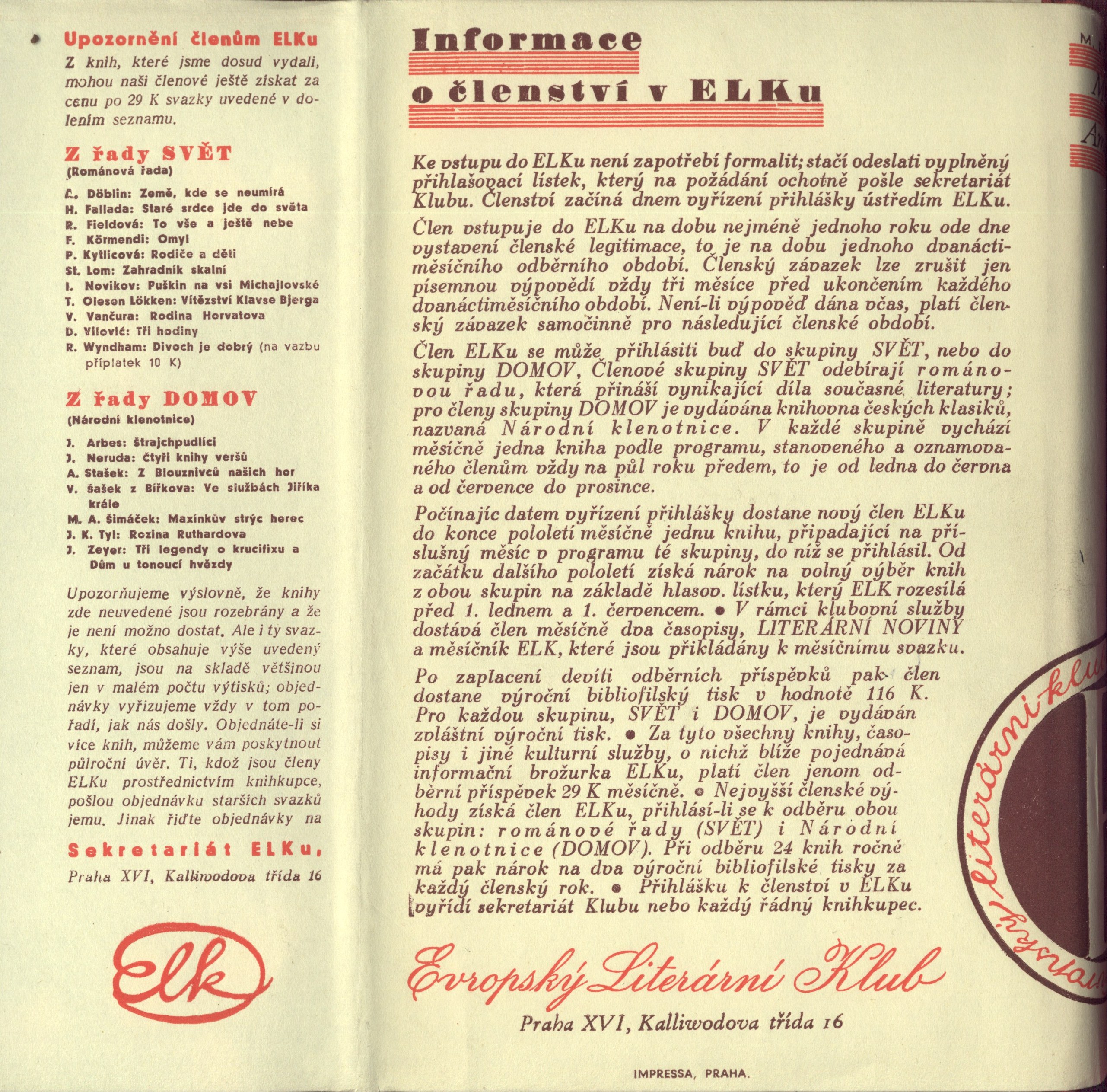 Názvové údaje Matka Amerika : [román] / Max Dickmann ; [z amerického originálu ... přeložil Jaroslav Dlouhý ; podle typografické úpravy Stanislava Kohouta ... ; obálku navrhl Karel Svolinský ; vazbu provedl Jindřich Štyrský s použitím kresby Karla Svolinského] Osobní jméno Dickmann, Max, 1902- (Autor) Další autoři Dlouhý, Jaroslav (Překladatel) Kohout, Stanislav, -1965 (Typograf) Svolinský, Karel, 1896-1986 (Autor obálky) (Ilustrátor) Štyrský, Jindřich, 1899-1942 (Výtvarník vazby) Korp. Evropský literární klub (nakladatelství) (Nakladatel, vydavatel) Impressa (tiskárna) (Tiskař) (Tiskař obrazu) Korp. knihtiskárna Jiřího Jelena na Mělníce (Mělník (Česko)) (Tiskař) Nakladatel Praha : Evropský literární klub, 1940 Výrobce knihtiskárna Jiřího Jelena) Rozsah 271 s. ; 22 cm ISBN (váz.) Země vyd. Česko Jazyk dok. čeština Jazyk orig. angličtina * španělština Poznámky Zdob. barev. vazba s tiskem na hřbetě. -- Ilustr. na vazbě. -- Nakl. značka na vakátě. -- Doslov "Kdo je autor Matky Ameriky" od J. P.