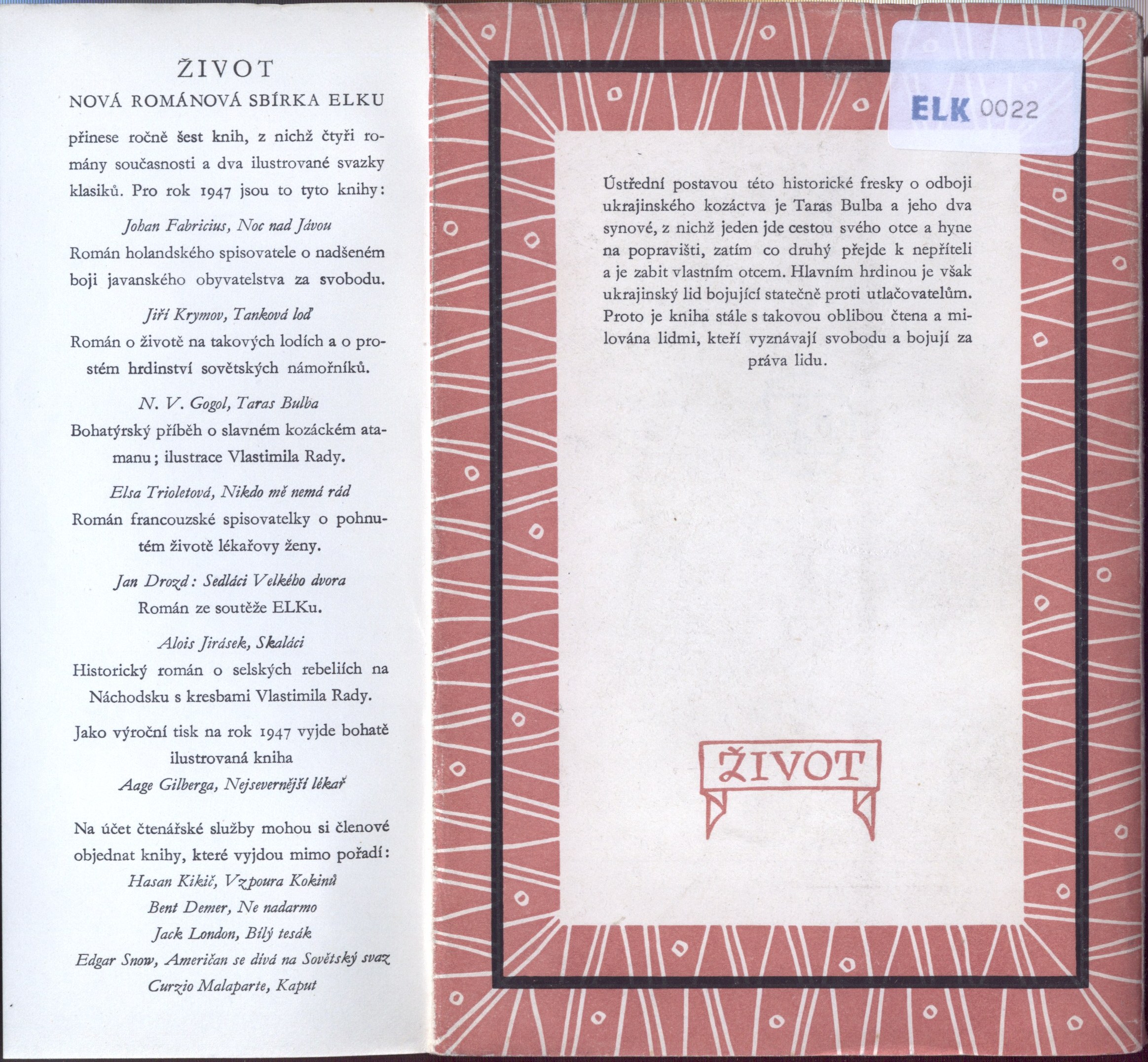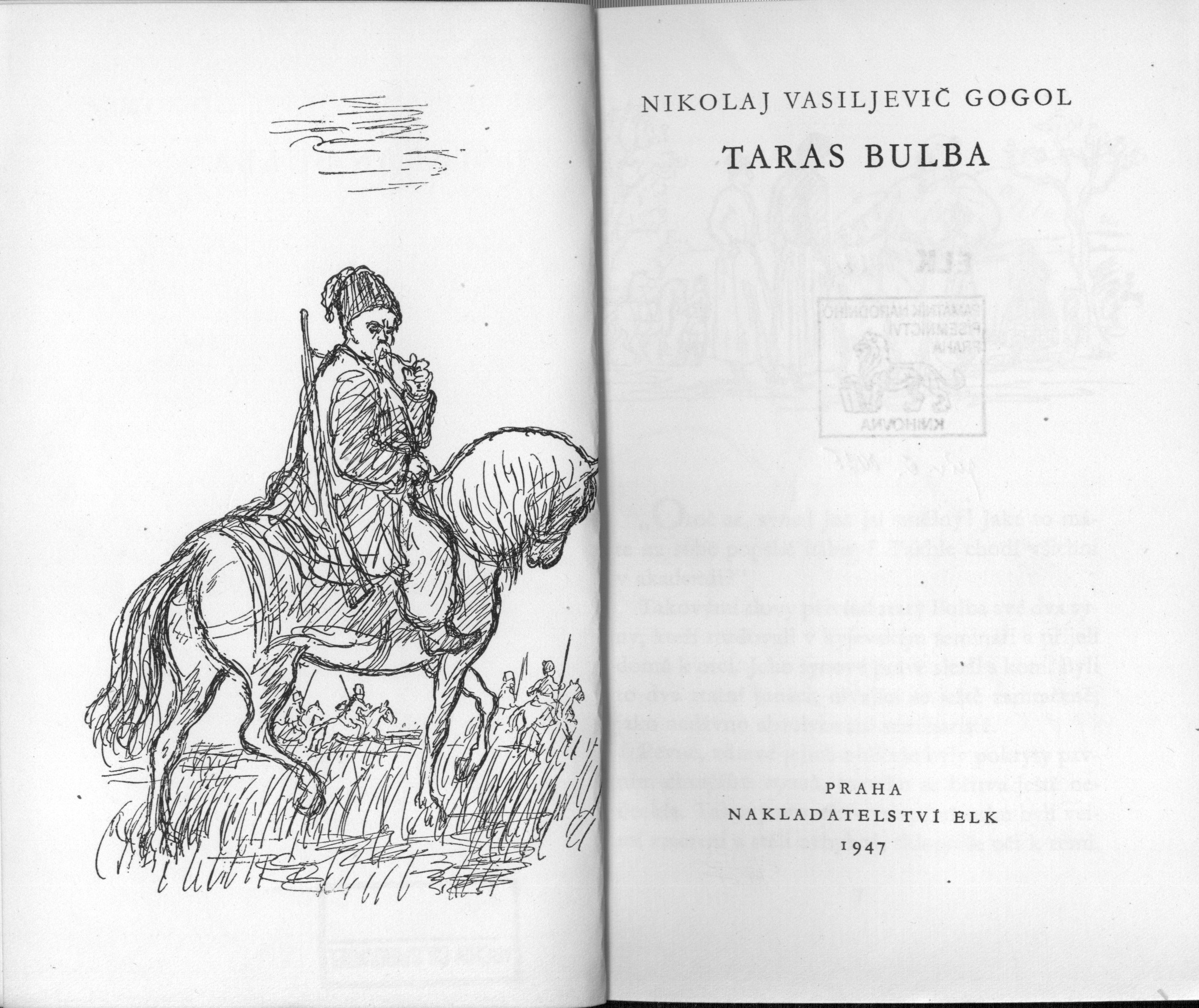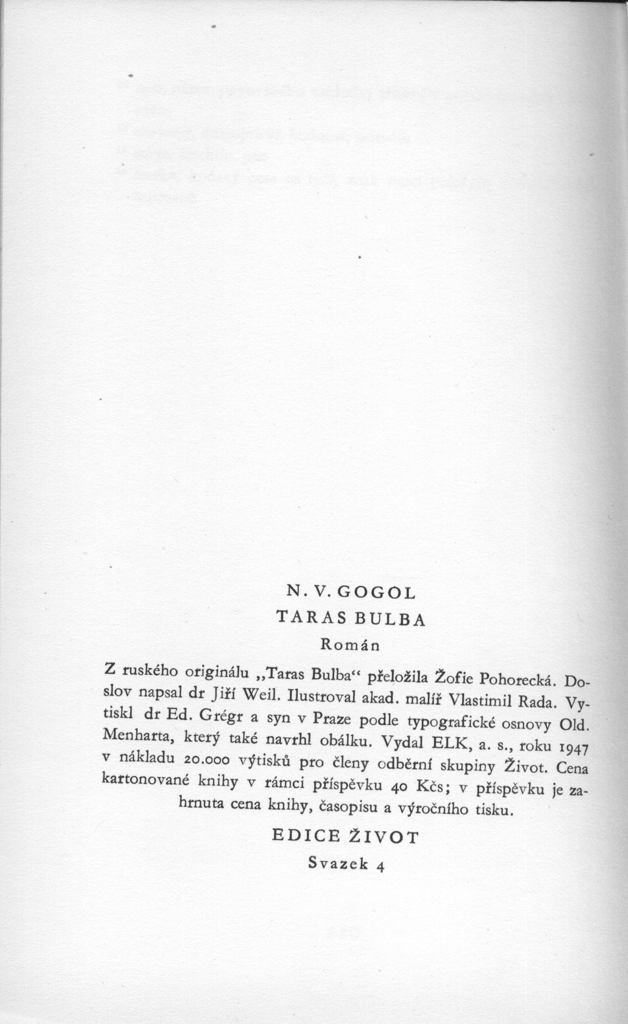Anotace Příběh Tarase Bulby, kozáka, a jeho synů Ostapa a Andrije se odehrává v době, kdy byl ukrajinský lid nucen bránit svou svobodu nejen proti polské šlechtě, ale i krutým Turkům Tarasovi se synové vrátí ze studií a on se rozhodne, že je vezme do města kozáků, do Síče. Taras Bulba je přesvědčen, že pro mladé lidi je nejlepší válka a boj, aby se zocelili a stali se z nich statní kozáci. Vůdce kozáků je však proti jakýmkoliv válkám. Přesto se Tarasovi podaří vyvolat vzpouru a svrhnou vůdce kozáků. Novým vůdcem se stane Tarasův přítel a spolu začínají plánovat alternativní boje. Do Síče přijede posel se zprávou o situaci v Polsku, kde prý dochází k utlačování pravoslavných křesťanů. Kozákům se to nelíbí a jsou zprávou velmi popuzeni a začnou se připravovat na cestu. Po vpádu do Polska devastují města, zapalují louky. Při obléhání města přijde za Tarasovým synem Andrijem služka krásné paní, do které se Andrij již dříve zadíval. Tajnou chodbou Andrij přinese dívce jídlo, do dívky se zamiluje, přejde na polskou stranu a zradí kozáky. Ten večer kozáky napadne polská armáda, avšak kozáci mají stále dost sil. Ke kozákům se dostane zpráva, že Síč byl přepaden Turky. Kozáci řeší dilema, zda pokračovat v obléhání města nebo bránit Síč před Turky. Kozáci se rozdělí a část jede na pomoc Síči. Při jedné bitvě je zabit vůdce kozáků a za nového vůdce je zvolen Tarasův druhý syn Ostapa Druh dok. monografie Název originálu Taras Bul'ba Osobní hesla Gogol‘, Nikolaj Vasil‘jevič, 1809-1852 - ruský prozaik, dramatik Klíčová slova ruská literatura * próza * povídka * překlad * historická freska * Ukrajinci * odboj * polská šlechta Žánr/forma ruské povídky MDT 821.161.1 * (0:82-3) * =030 * 82-32 * 94(477) Uživatelské pole PNP U sign. ELK 0022 typizovaná, barevná, ilustrací zdobená obálka (O. Menhart) se značkou edice a nakladatelství. - Obálka brože se značkou edice a nakladatelství (O. Menhart - neuvedeno). - Na přední záložce upoutávka na novou edici - U patitulu razítko Archiv Čs. spisovatel, č. P 857, ediční a nakladatelská značka. - Frontispis. - Titulní list. - Černobílé ilustrace (kresby - některé celostránkové). - Doslov: "O autorovi." - Vysvětlivky. - Tiráž s edicí. - Na zadní záložce ediční upoutávka. - Na zadní straně brože značka Kmene. - Na zadní straně obálky upoutávka na knihu a ediční značka. Tiráž: "N. V. Gogol Taras Bulba. Román. Z ruského originálu "Taras Bulba" přeložila Žofie Pohorecká. Doslov napsal dr Jiří Weil. Ilustroval akad. malíř Vlastimil Rada. Vytiskl dr Ed. Grégr a syn v Praze podle typografické osnovy Old. Menharta, který také navrhl obálku. Vydal ELK, a. s., roku 1947 v nákladu 20.000 výtisků pro členy odběrní skupiny Život. Cena kartonované knihy v rámci příspěvku 40 Kčs; v příspěvku je zahrnuta cena knihy, časopisu a výročního tisku. Edice Život. Svazek 4." Rozsah: 220, [4] s. Rozměr: 19,1 cm Sign. VMartínek 102 - Knihovna Vojtěcha Martínka. Signatura Přír.číslo Lokace Info ELK 0022 1618/2012 Sbírka VMartínek 0102 1028/2013 Sbírka