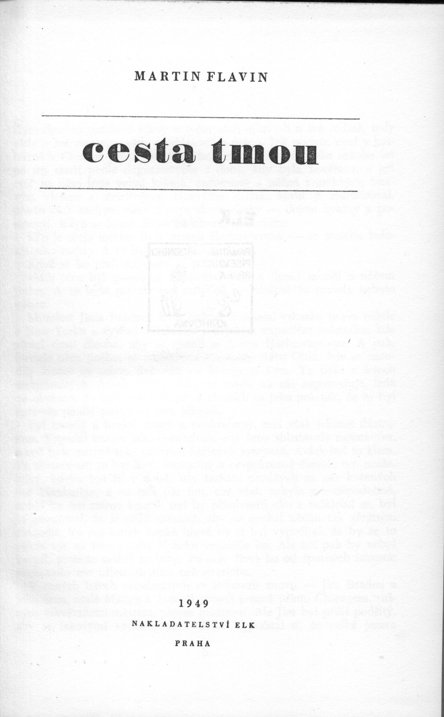 $a Cesta tmou / $c Martin Flavin ; [z anglického originálu ... přeložila Zdeňka Hofmanová ; doslov napsal František Resl ; obálku a vazbu navrhl Zdeněk Sklenář ; podle typografické osnovy Josefa Hanzla] 250 $a První vydání 264 -1