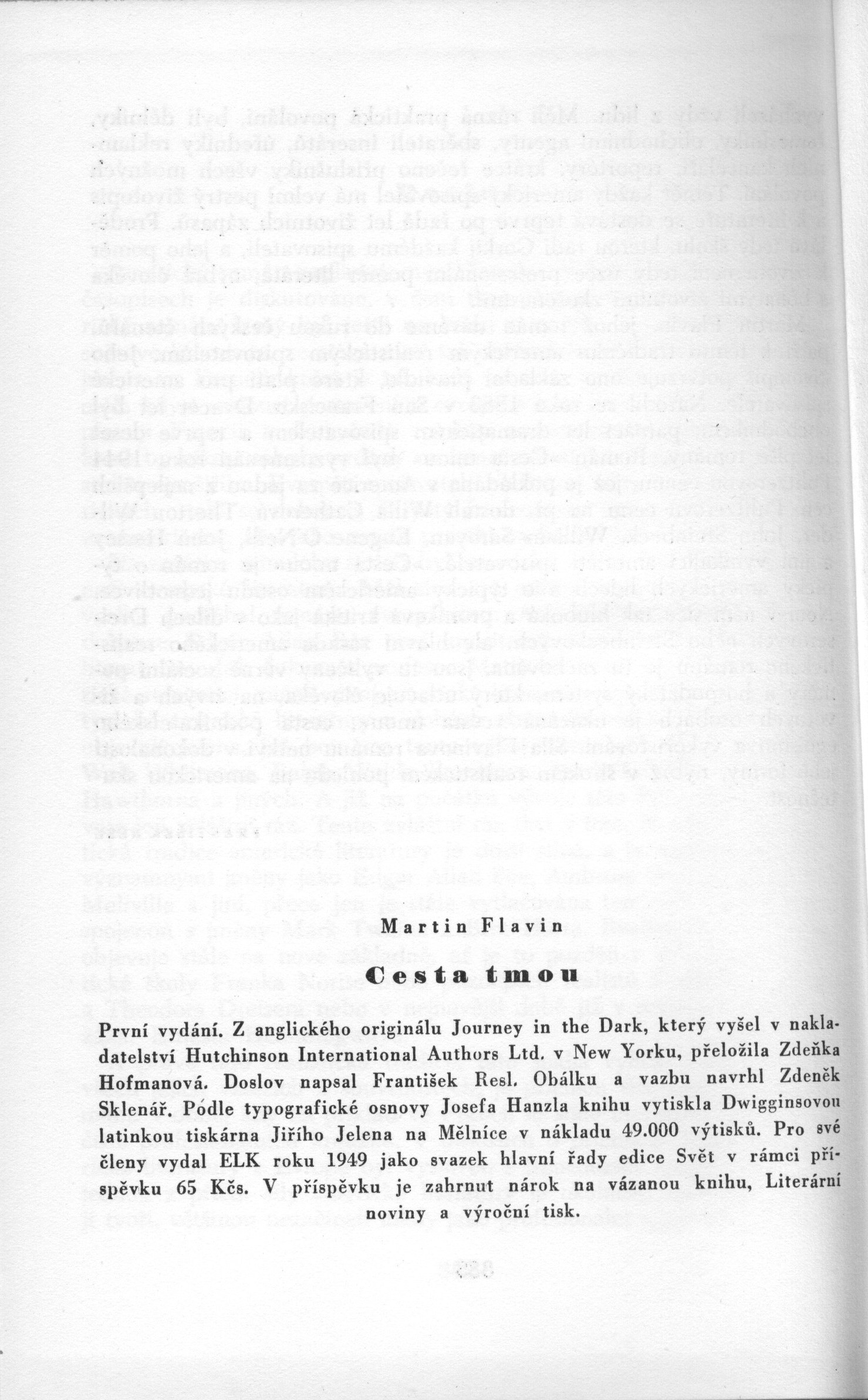 $7 pnp_us_auth*0035179 $a Svět, (Evropský literární klub) T85 $x existuji fulltexy UUU $a U sign. ELK 0054 a ELK 0054a (stejné vázané výtisky) barevná, ilustrací zdobená obálka (Z. Sklenář). - Poloplátěná vazba s papírovým polepem a zdobenou barevnou ražbou (Z. Sklenář). - Na přední záložce čtenářský průzkum ELKu. - Na přední předsádce razítko Archiv Čs. spisovatel, č. P 905. - Nakladatelská značka (O. Menhart - neuvedeno) u patitulu. - Titulní list. - Doslov (F. Resl). - Tiráž s edicí. - Na zadní záložce upoutávka na knihu. - Na zadní straně obálky nakladatelské upoutávky. UUU $a Tiráž: "Martin Flavin Cesta tmou. První vydání. Z anglického originálu Journey in the Dark, který vyšel v nakladatelství Hutchinson International Authors Ltd. v New Yorku, přeložila Zdeňka Hofmanová. Doslov napsal František Resl. Obálku a vazbu navrhl Zdeněk Sklenář. Podle typografické osnovy Josefa Hanzla knihu vytiskla Dwigginsovou latinkou tiskárna Jiřího Jelena na Mělníce v nákladu 49.000 výtisků. Pro své členy vydal ELK roku 1949 jako svazek hlavní řady edice Svět v rámci příspěvku 65 Kčs. V příspěvku je zahrnut nárok na vázanou knihu, Literární noviny a výroční tisk." UUU $a Rozsah: 383, [1] s.