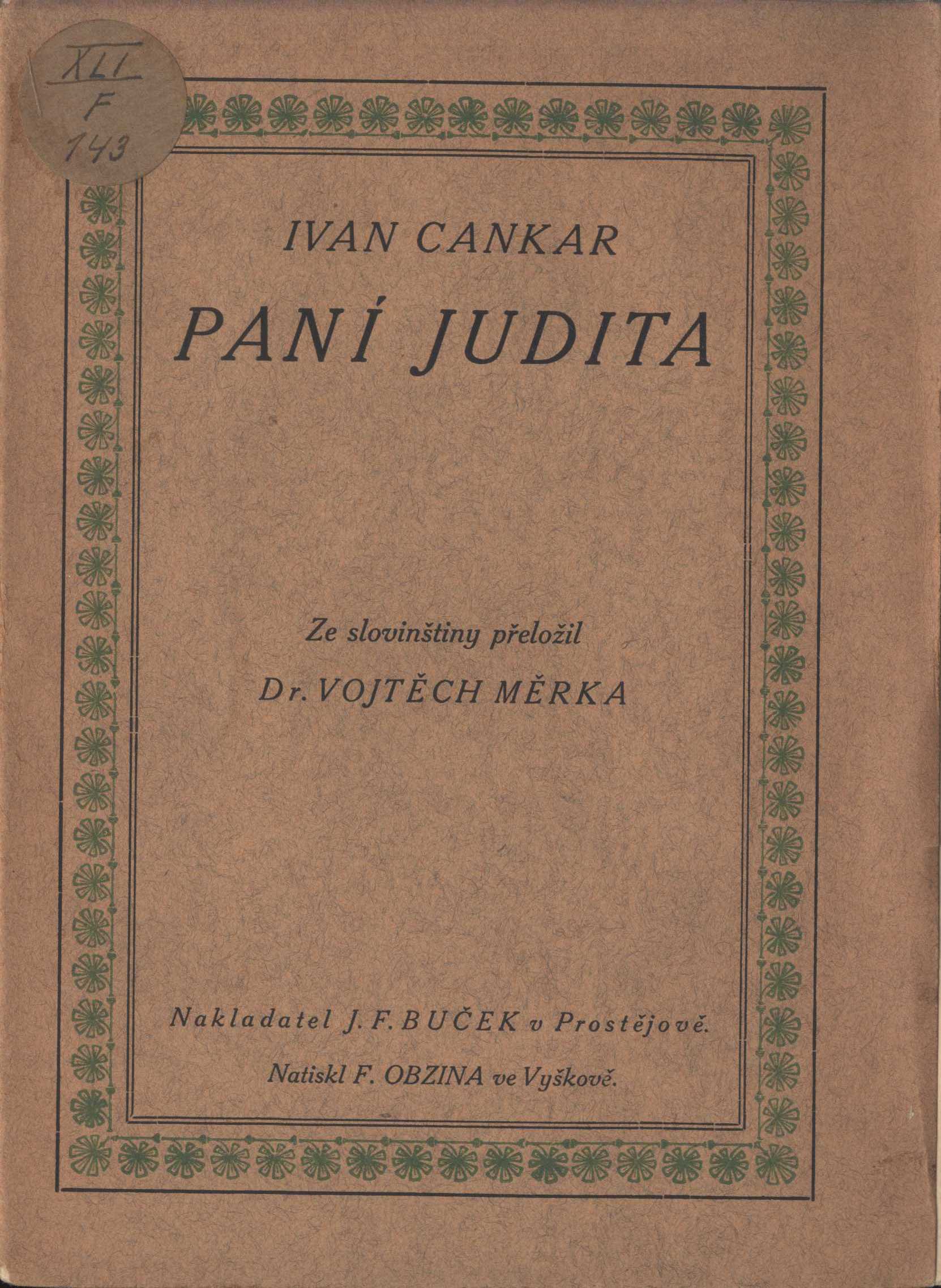 Názvové údaje Paní Judita / Ivan Cankar ; ze slovinštiny přeložil Vojtěch Měrka Osobní jméno Cankar, Ivan, 1876-1918 (Autor) Další autoři Měrka, Vojtěch, 1888-1974 (Překladatel) Korp. J.F. Buček (nakladatelství) (Nakladatel, vydavatel) František Obzina (tiskárna, nakladatelství) (Tiskař) Nakladatel V Prostějově : J. F. Buček, [1918] Výrobce František Obzina) Rozsah 99 s. ISBN brož. Země vyd. Česko Jazyk dok. čeština Jazyk orig. slovinština Poznámky Rok vydání podle záznamu v katalogu NKP. - Přední strana obálky zdobena dekorativním rámcem. - Koncová viněta
