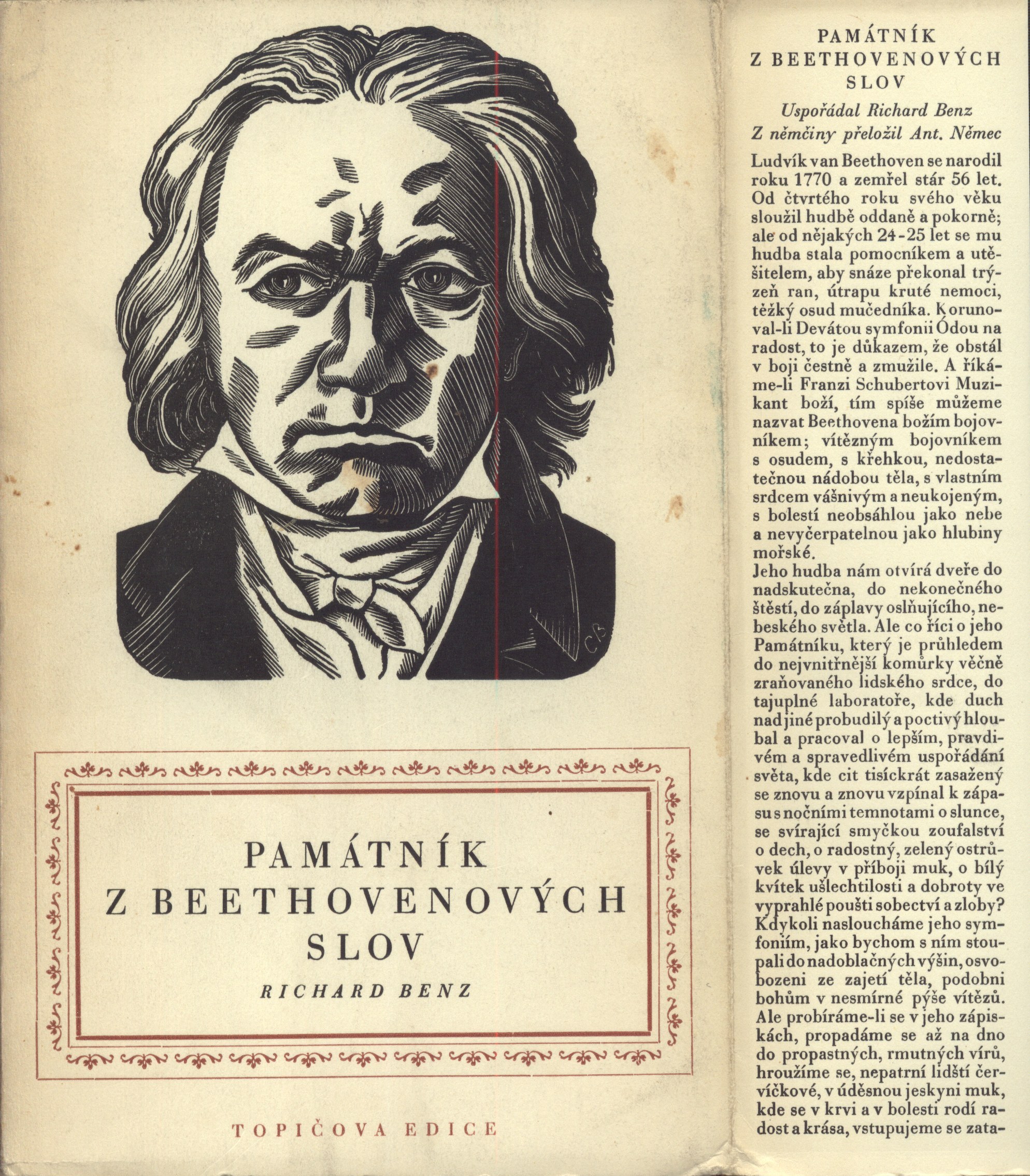 Title information Památník z Beethovenových slov / [uspořádal] Richard Benz ; [z němčiny] přeložil Antonín Němec ; obálka a grafická úprava Cyrila Boudy] Personal name Beethoven, Ludwig van, 1770-1827 (Artist) Další autoři Benz, Richard, 1884-1966 (Compiler) Němec, Antonín, 1894-1958 (Translator) Bouda, Cyril, 1901-1984 (Bookjacket designer) (Book designer) Corporation Topičova edice (nakladatelství) (Publisher) Müller a spol. (tiskárna) (Printer) Publication V Praze : Topičova edice, 1941 Manufacture knihtiskárna Müller a spol.) Scope 80 s. ; 20 cm ISBN brož. Country Czech Republic Language Czech Language of the original German Note Ilustrovaná obálka. - Titulní list. - Tiráž. - Na záložkách upoutávky.