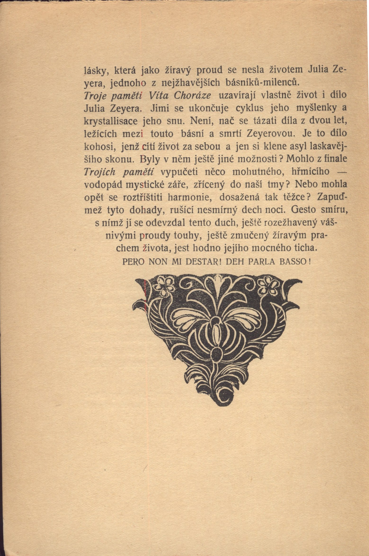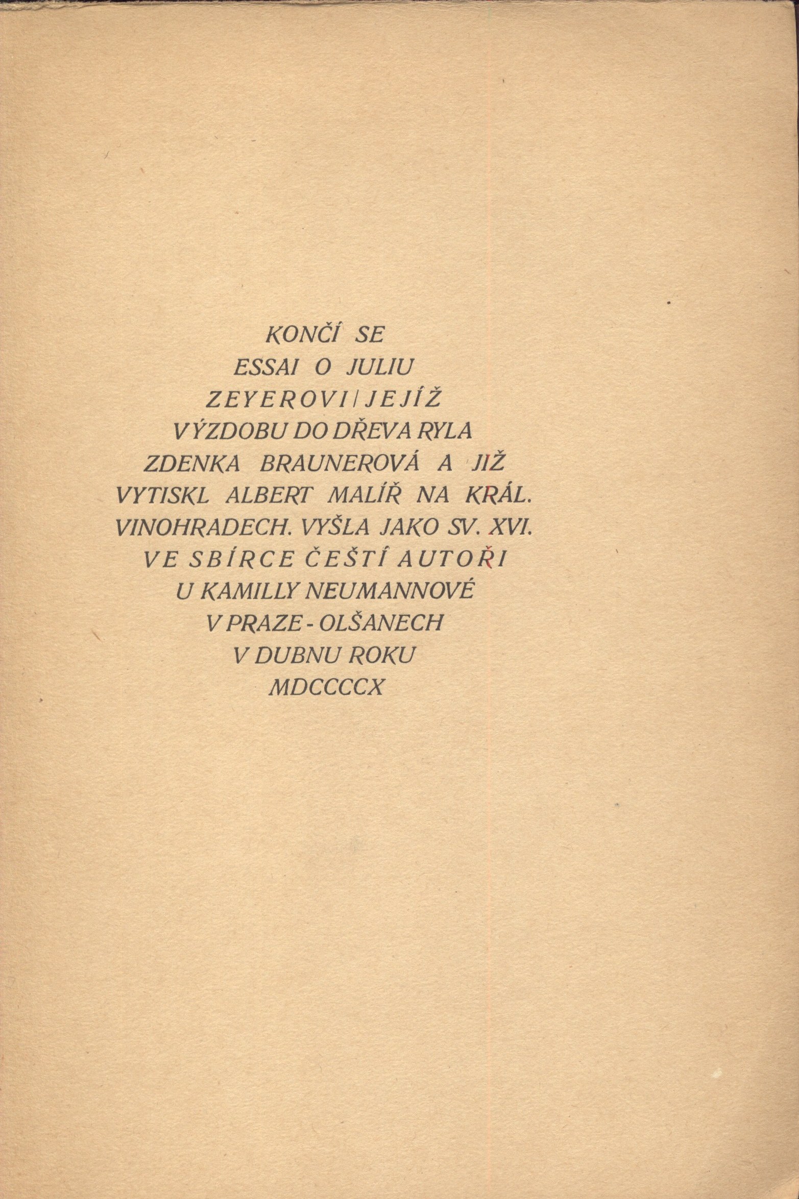 $a Čeští autoři $v sv. XVI. $v roč. IV., čís. 3 500 $a Ilustrovaná obálka. - Viněta. - Vydané knihy autora. - Titulní list ve zdobném rámci. - Zdobné vstupní záhlaví. - Zdobné iniciály a koncové viněty. - Tiráž s edicí. - Na zadní straně obálky edice a cena. 500 $a Tiráž: „Končí se essai o Juliu Zeyerovi / jejíž výzdobu do dřeva ryla Zdenka Braunerová a již vytiskl Albert Malíř na Král. Vinohradech. Vyšla jako sv. XVI. ve sbírce Čeští autoři u Kamilly Neumannové v Praze – Olšanech v dubnu roku MDCCCCX“ 500 $a Sáňka 253 600 17