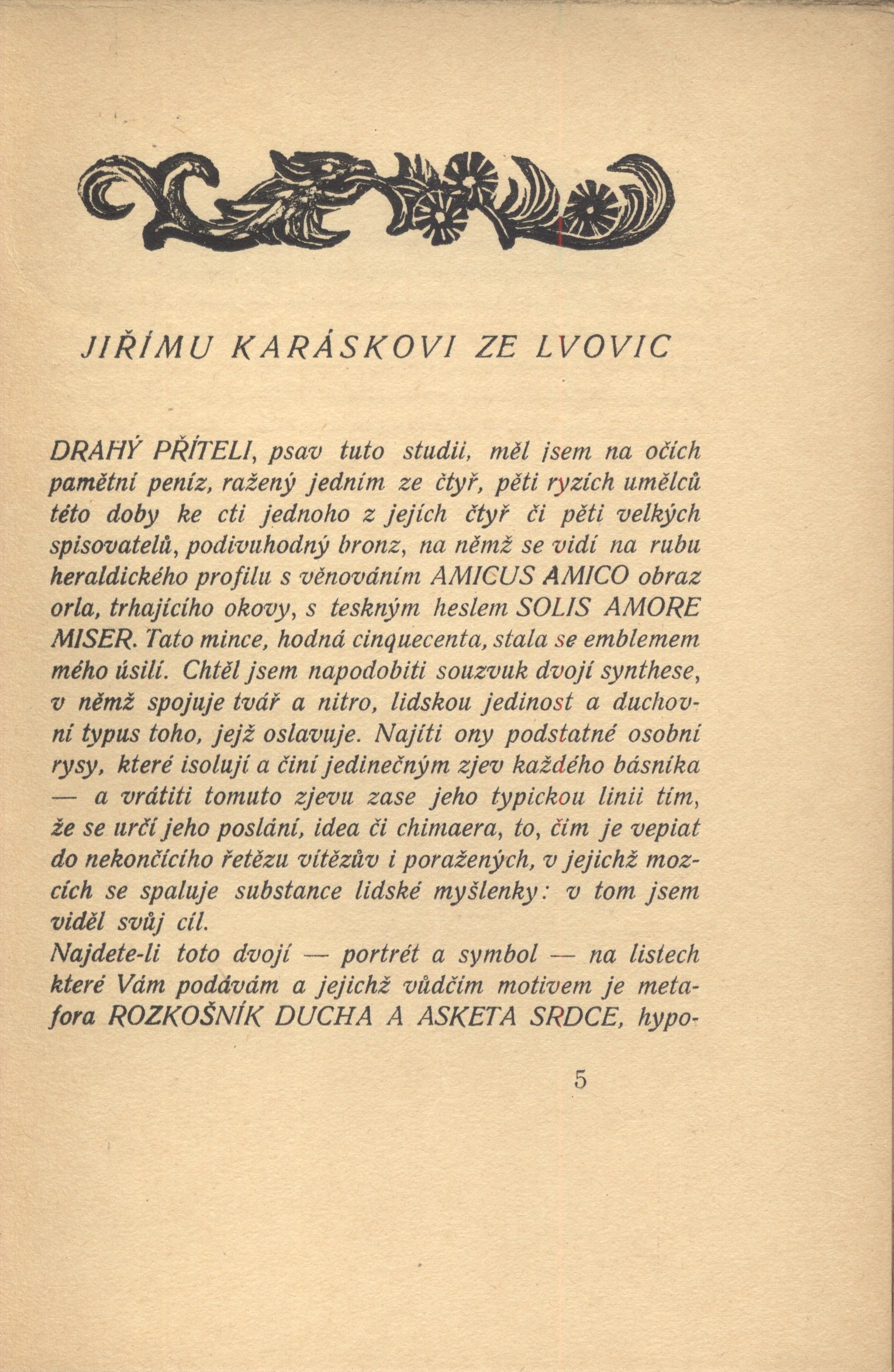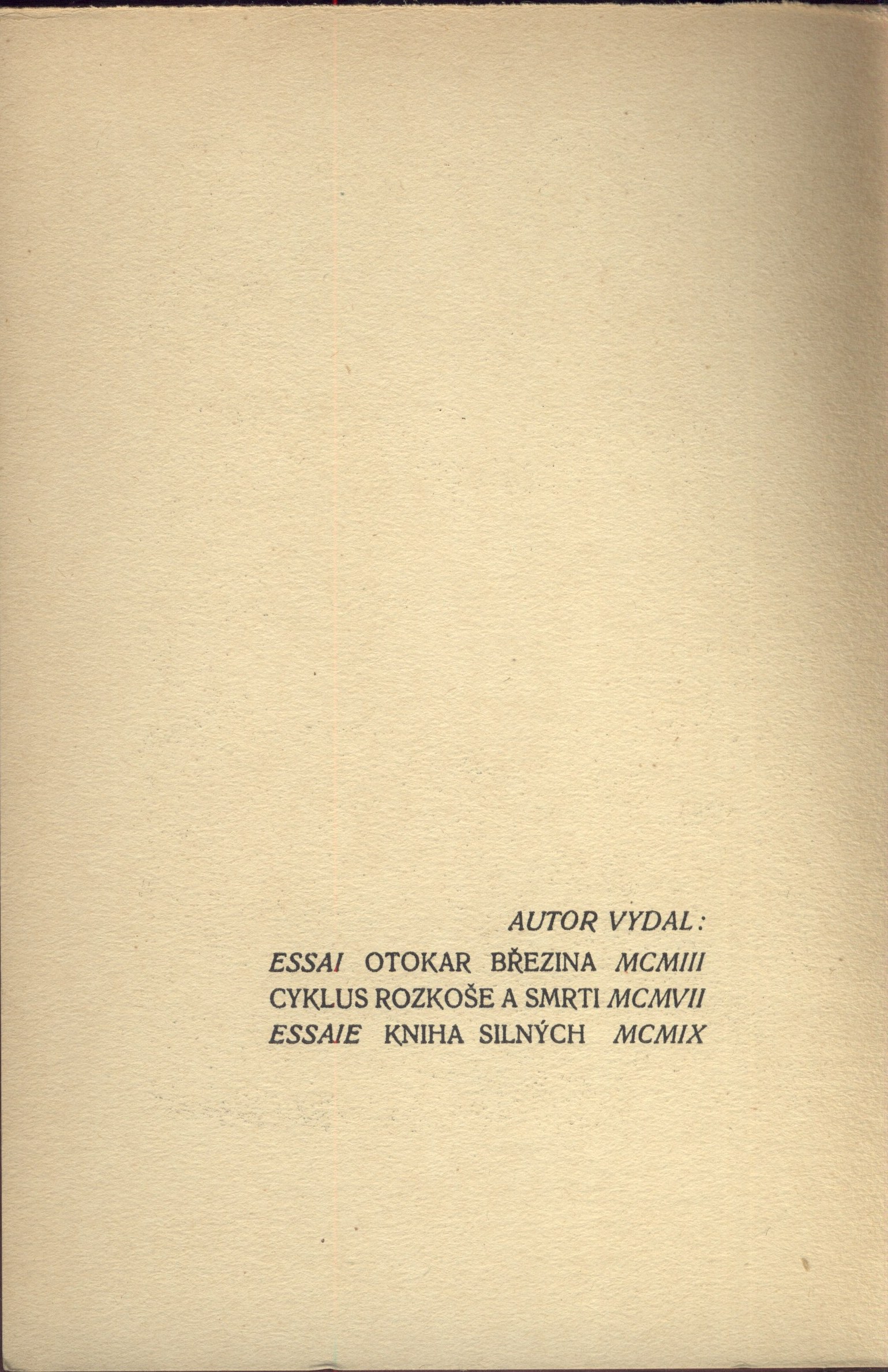 $7 pnp_us_auth*0039705 $a Čeští autoři, (Kamilla Neumannová) T85 $x existuji fulltexy UUU $a U sign. Topič osobní knihovna Topiče a Milady Blekastad. UUU $a U sign. Topič 0665 (brožovaný výtisk) obálka ze silnějšího fialového papíru s černým zdobným rámcem (stejný i v titulu) (Z. Braunerová) se zlaceným názvem. - Vinětka (Z. Braunerová), pod ní vepsaná dedikace autora. - Vydané knihy autora proti titulu. - Titulní list ve zdobném rámci, text červeně. - Zdobné vstupní záhlaví (Z. Braunerová). - Zdobné iniciály a koncové viněty (Z. Braunerová). - Tiráž s edicí. - Tištěno typy Romana. - Na zadní straně obálky jiné značení edice a uvedena cena. - Vloženo do ochranných desek s tkanicemi. UUU $a U sign. Topič 0665 dedikace: „Panu Jaroslavu Topičovi s přátelským pozdravem Miloš Marten“ UUU $a U sign. Topič 0665 vyšisovaná barva obálky, zejména na hřbetu, obálka ve hřbetu prasklá, kraje zohýbané; listy sešity nitkou, většinou nerozřezané složky. UUU $a Tiráž: „Končí se essai o Juliu Zeyerovi / jejíž výzdobu do dřeva ryla Zdenka Braunerová a již vytiskl Albert Malíř na Král. Vinohradech. Vyšla jako sv. XVI. ve sbírce Čeští autoři u Kamilly Neumannové v Praze – Olšanech v dubnu roku MDCCCCX“ UUU $a Rozsah: 69, [3] s. UUU $a Rozměr: 20,2 cm UUU $a Sáňka 253 uvádí, že část nákladu vytištěna na hollandu s ručně kolorovanými iniciálami