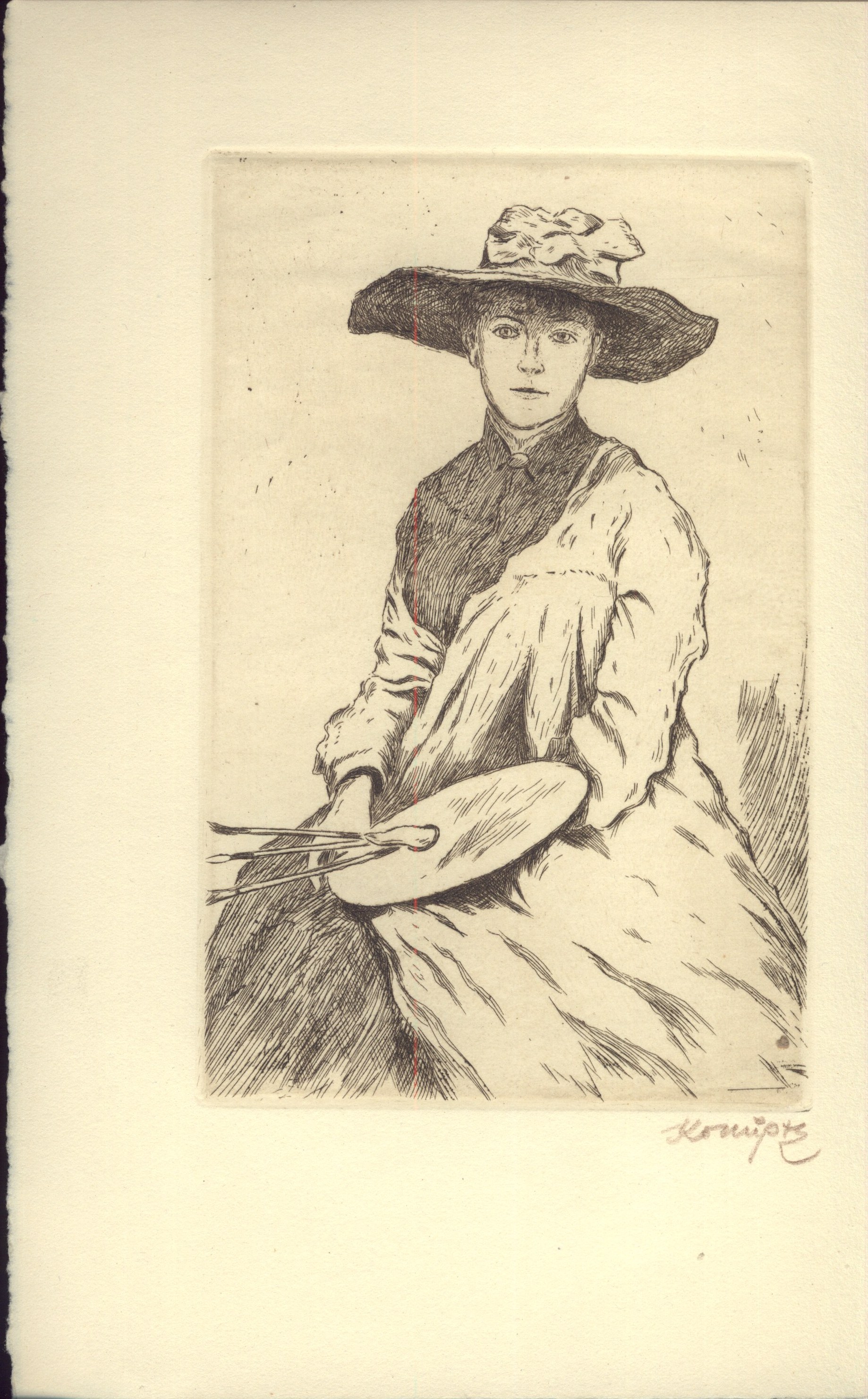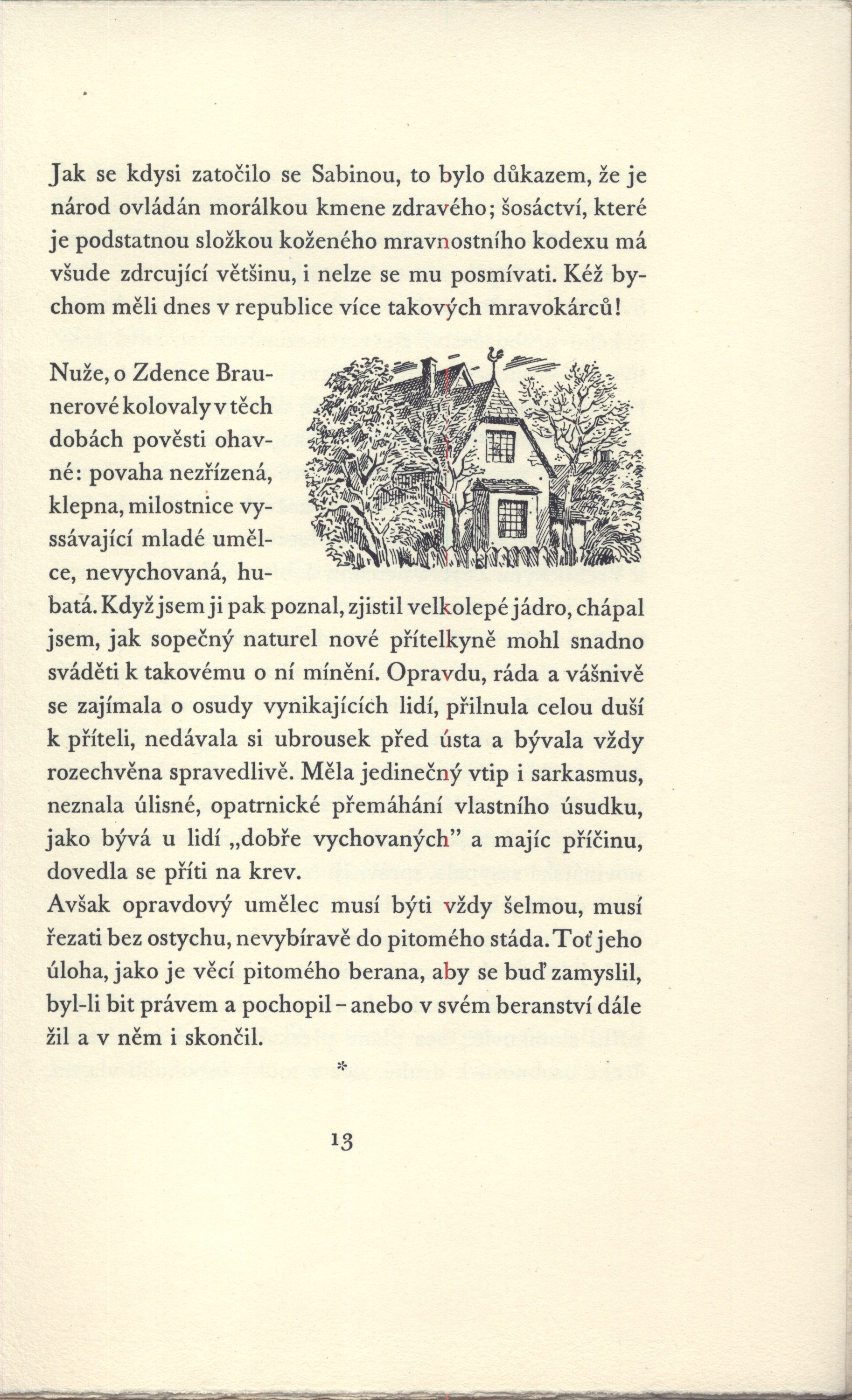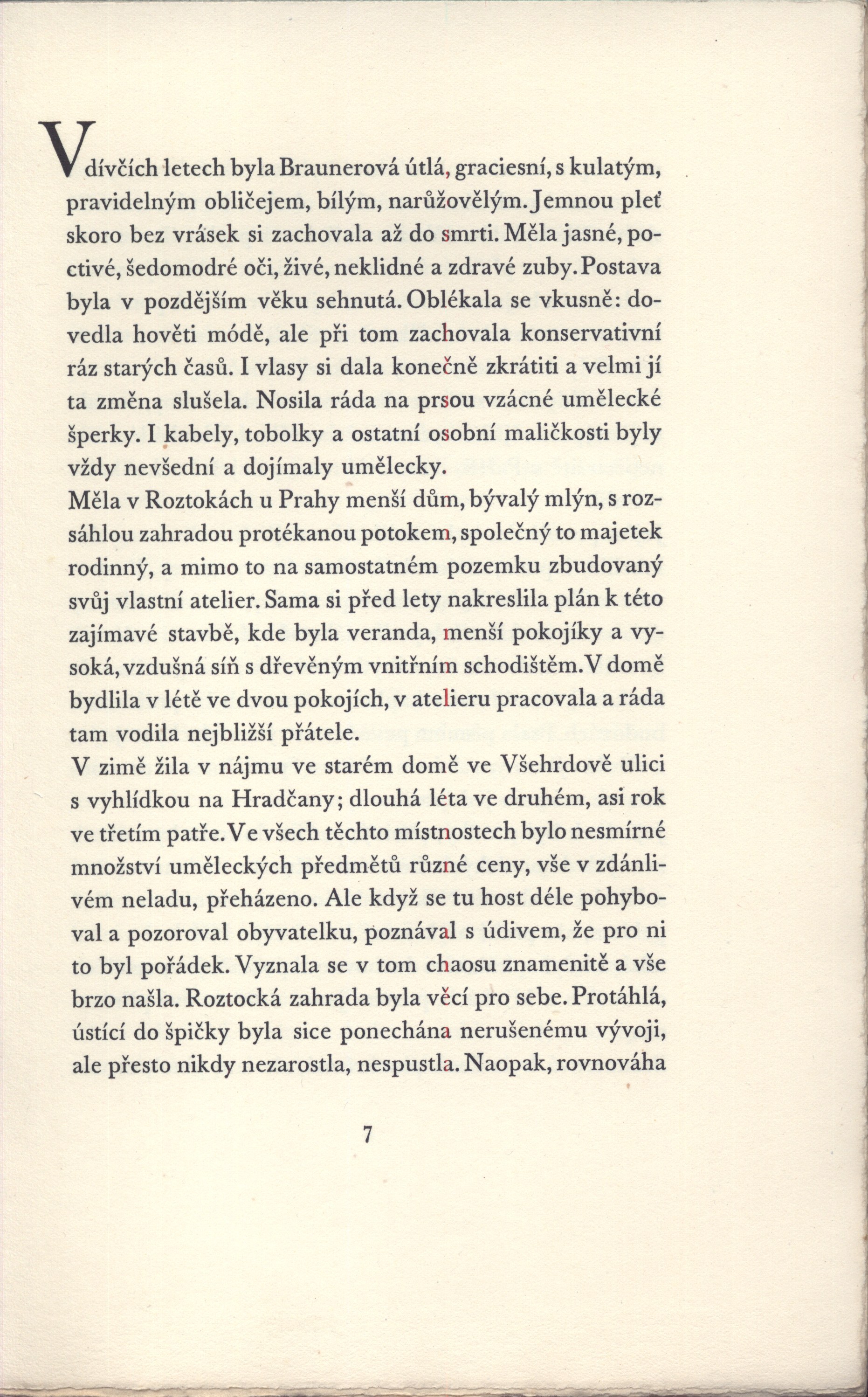 Anotace Bibliofilské vydání životopisného příběhu Zdenky Braunerové popisuje prostředí a dobu, které ovlivňovaly tvorbu této významné malířky z přelomu 19. a 20. stol Na front. rytina od J. Konůpka zobrazující Zdenku Braunerovou podle fot. z let 1890. Repr. kreseb z atelieru a zahrady v Roztokách načrtnuty po úmrtí Zd. Braunerové. Vytisklo Družstvo knihtiskárny v Hranicích. Typograficky upravil Vladimír Stejskal. Na ručním holandském papíru Pannekoek (filigrány). V tiráži suchá pečeť vydavatele. Frontispice s podpisem (tužkou): Konůpek. V tiráži s podpisem (perem) Jaroslav Maria. Náklad 100. Vazba papírová měkká, lehce šitá Druh dok. monografie Osobní hesla Braunerová, Zdenka, 1858-1934 - malířka a grafička Klíčová slova česká literatura * studie * české osobnosti * české umělkyně * Braunerová Z. * životopisná studie * ilustrace * Kobliha F. * ilustrované knihy * číslovaný výtisk * bibliofilská vydání * bibliofilské tisky MDT 821.162.3 * 929Braunerová, Z. * 72/76(437.3) * (437.3)-051 * (084.1) * (0.027.6) Uživatelské pole PNP U sign. Topič osobní knihovna Topiče a Milady Blekastad. U sign. Topič 0733 (brožovaný výtisk) ve světle hnědé papírové obálce, typograficky řešené, vloženy svázané archy nitkou. - Vakát. - Frontispis (suchá jehla, J. Konůpek, podpis tužkou: "Konůpek"). - Titulní list s barevnou vinětou. - Tištěná dedikace. - Vstupní iniciála. - Černobílé kresby v textu (J. Konůpek). - Tiráž s číslem výtisku a slepotiskovou nakladatelskou značkou (J. Konůpek - neuvedeno). U sign. Topič 0733 číslo výtisku (perem, hnědě): "29", podpis (taktéž): "Jaroslav Maria" U sign. Topič 0733 obálka mírně zašpiněná a v horní části (přesahující blok listů) zohýbaná, listy s nerovnými kraji. Rozsah: [2], 62, [4] s. Rozměr: 26,4 cm Sáňka 4033 Signatura Přír.číslo Lokace Info Topič 0733 1553/2015 Sbírka