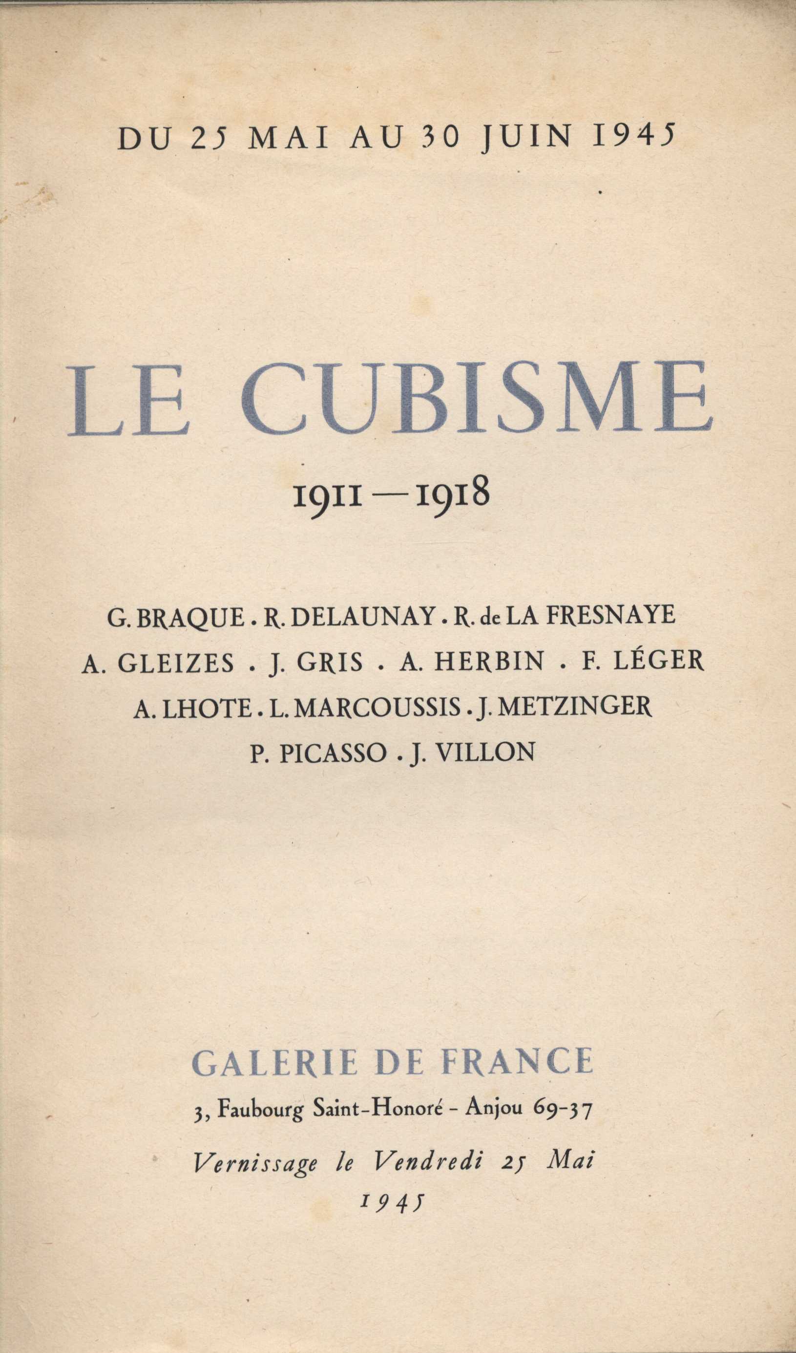 1. Názvové údajeLe cubisme 1911-1918 : G. Braqwue, R. Delaunay, R. de La Fresnaye, A. Gleizes, J. Gris, A. Herbin, F. Léger, A. Lhote, L. Marcoussis, J. Metzinger, P. Picasso, J. Villon : du 25 mai au 30 jin 1945, Galerie de France