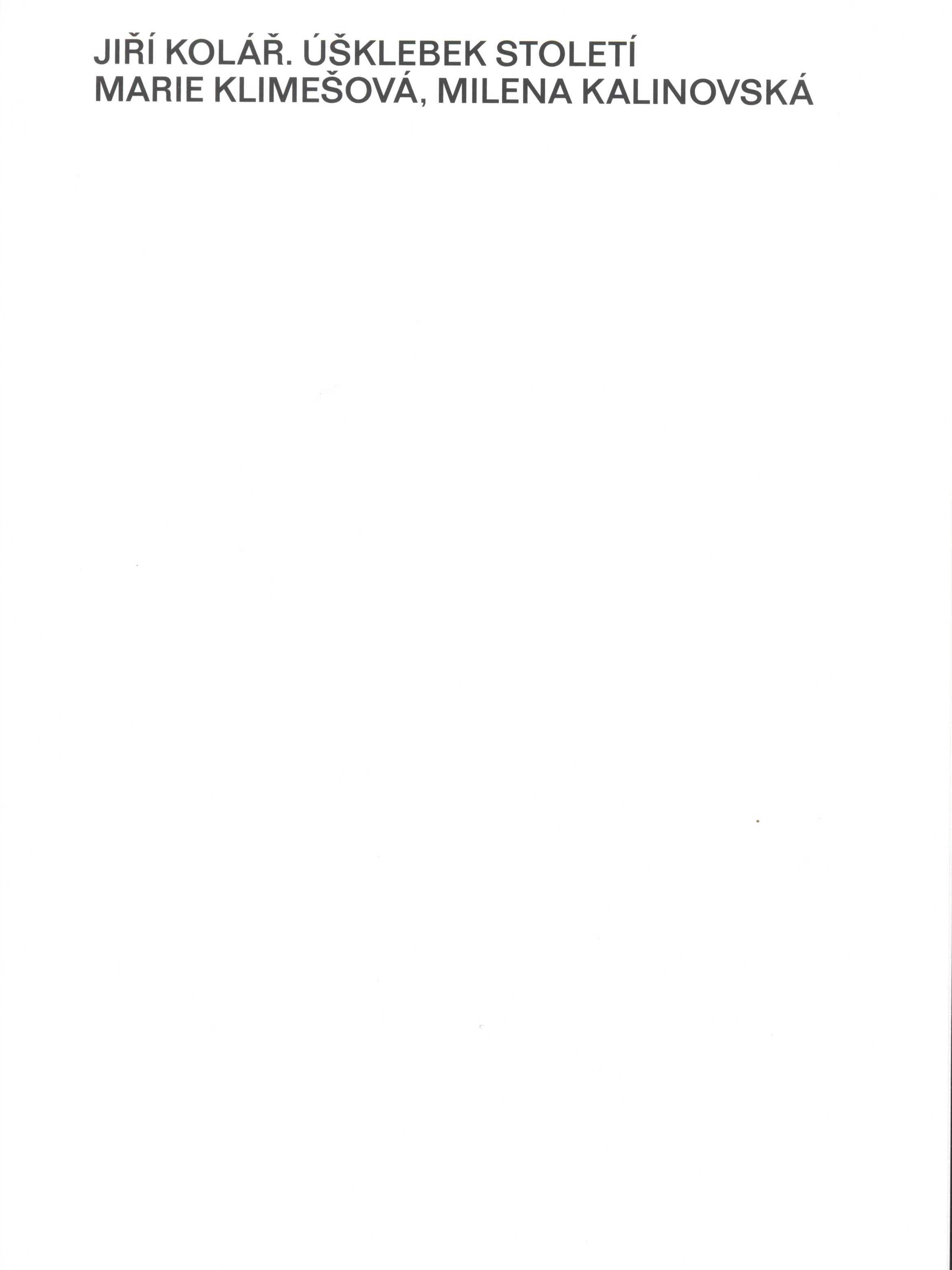 Názvové údaje Jiří Kolář : Úšklebek století = Grimace of the Century / [koncepce výstavy a katalogu, texty] Marie Klimešová, Milena Kalinovská ; překlad do angličtiny Linda Jeffová, Stephen Delbos; překlad z angličtiny Martina Neradová; grafická úprava Petr Bosák, Robert Jansa, Adam Macháček (20YY Designers) Osobní jméno Klimešová, Marie, 1952- (Autor) (Autor koncepce) Další autoři Kalinovská, Milena, 1948- (Autor) (Autor koncepce) Bosák, Petr, 1985- (Knižní grafik) Jansa, Robert, 1985- (Knižní grafik) Macháček, Adam, 1980- (Knižní grafik) Leffová, Linda, 1956- (Překladatel) Delbos, Stephan, 1982- (Překladatel) Neradová, Martina, 1974- (Překladatel) Korp. Národní galerie (Praha, Česko) (Nakladatel, vydavatel) Indigoprint (tiskárna) (Tiskař) Nakladatel V Praze : Národní galerie v Praze, 2018 Výrobce Praha : Indigoprint Rozsah 195 stran : ilustrace (převážně barevné) ; 27 cm ISBN 978-80-7035-686-9 (brožováno) Země vyd. Česko Jazyk dok. čeština * angličtina Jazyk orig. čeština Poznámky Bílá obálka s průřezy, černý text. - Na přední záložce obsah katalogu, na zadní seznam vyobrazených fotografií a tiráž. - Na rubu přední záložky báseň (souběžný český a anglický text). - Přiznaný šitý hřbet. - Básně, texty J. Koláře (souběžný český a anglický text). - Černobílé a barevné koláže. - Úvod a poděkování ředitele NG J. Fajta. - Titulní list. - Texty. - Biografie J. Koláře. - Seznam vystavených děl. - Černobílé, tónované a barevné koláže s popisky na obrazové příloze. - Faksimile dokumentů. - Černobílé fotografie J. Koláře (i na rubu zadní záložky a na předsádkách). - Barevná celostránková reprodukce koláže na zadní straně obálky.