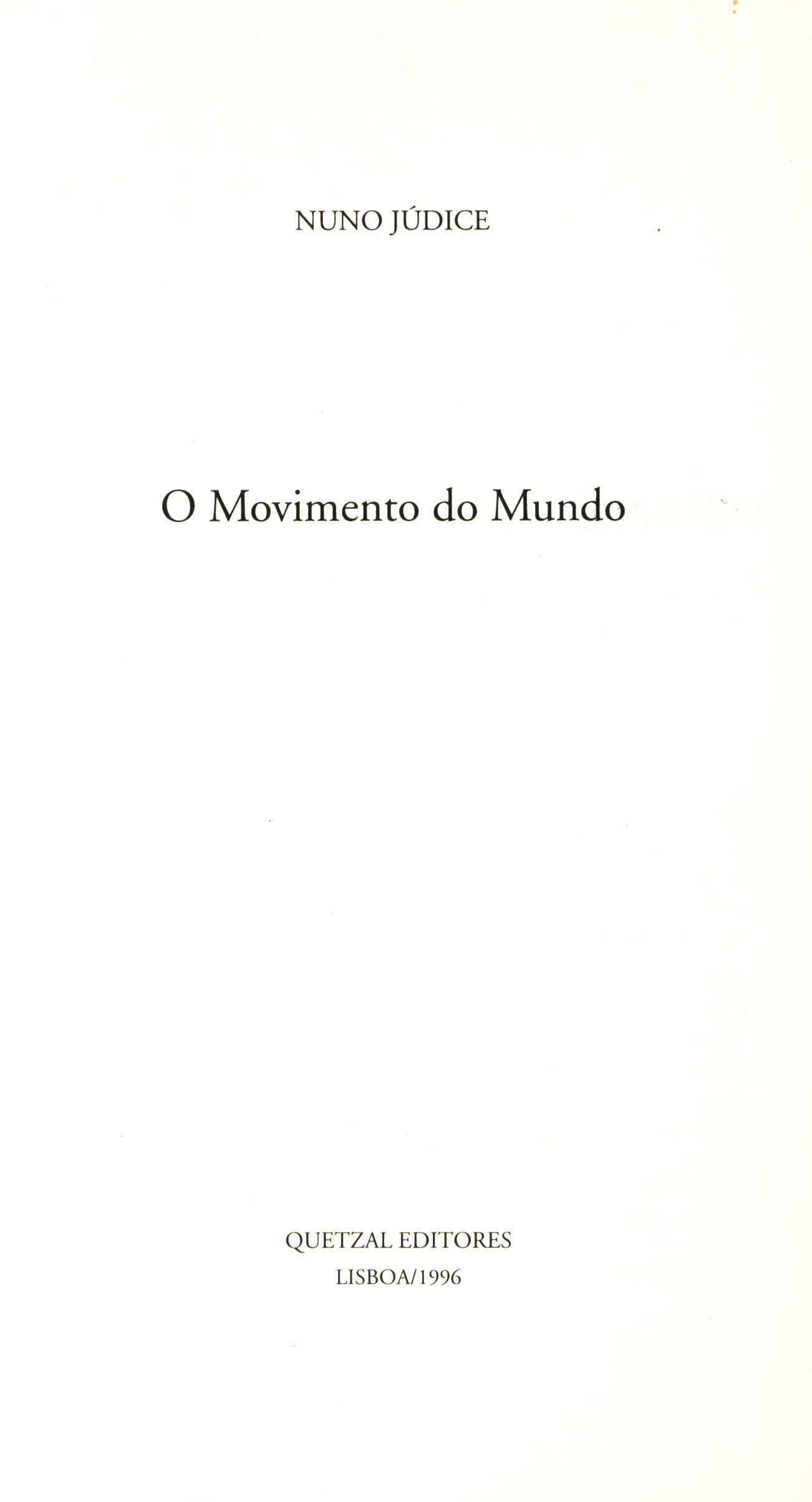 Názvové údaje O movimento do mundo / Nuno Júdice Osobní jméno Júdice, Nuno, 1949-2024 (Autor) Další autoři Quetzal Editores (Nakladatel, vydavatel) Nakladatel Lisboa : Quetzal Editores, 1996 Výrobce Visue : Tipografia Guerra Rozsah 124 stran ; 21 cm ISBN 972-564-256-2 (brožováno) Edice Poesia