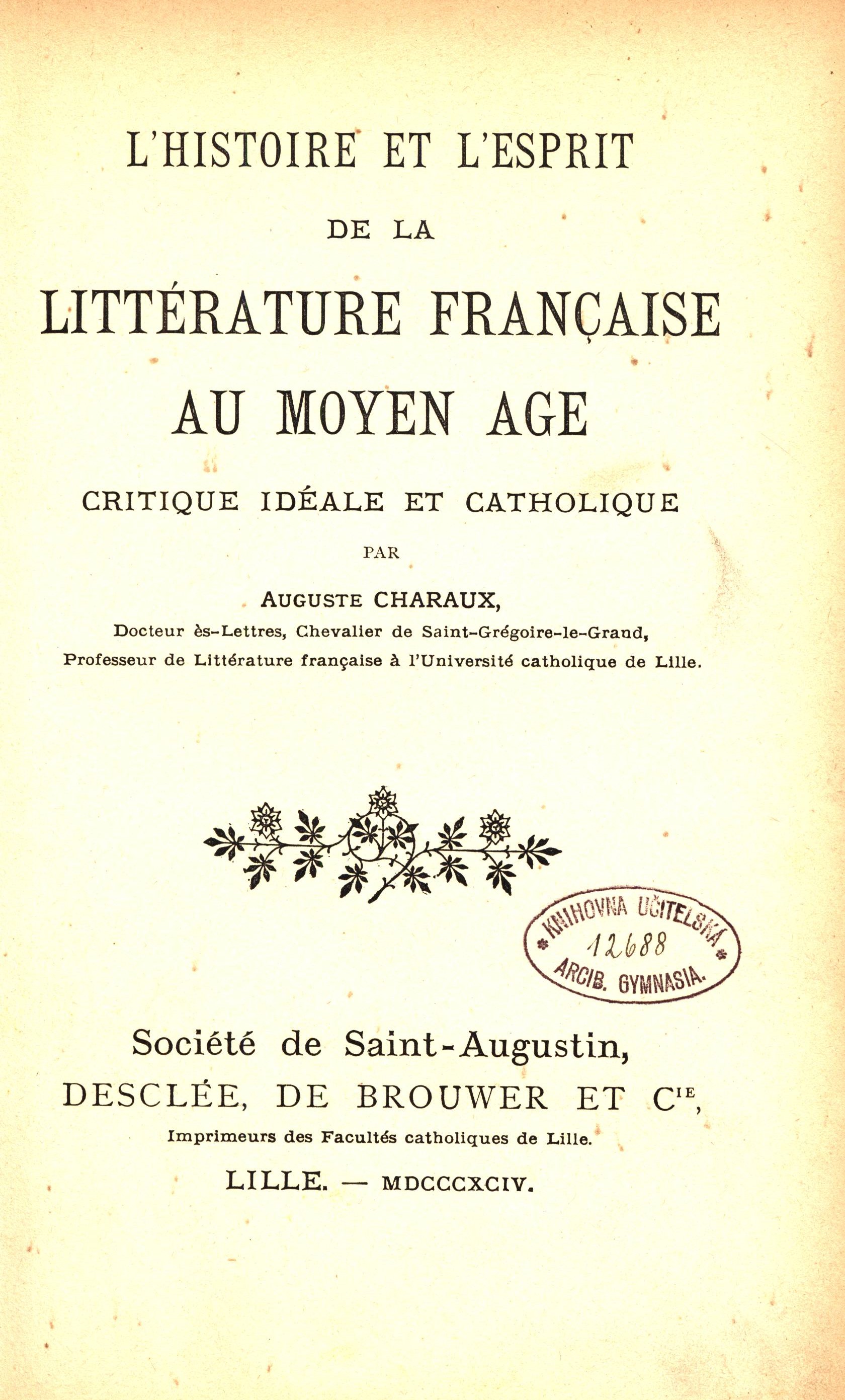 Názvové údaje L´Histoire et l´Esprit de la Littérature française au Moyen Age : critique idéale et catholique / Auguste Charaux Osobní jméno Charaux, Auguste, 1832-1912 (Autor) Další autoři Société de Saint-Augustin - Desclée de Brouwer & C-ie (nakladatelství a vydavatelství) (Nakladatel, vydavatel) Université catholique de Lille (univerzita, nakladatelství, tiskárna) (Tiskař) Nakladatel Lille: Société de Saint-Augustin, Desclée de Brouwer et c-ie, 1894 Výrobce Imprimeurs des Facultés catholiques de Lille Rozsah 412 stran ; 26 cm ISBN (Vázáno) Země vyd. Francie Jazyk dok. francouzština Poznámky Poloplátěná vazba s mramorovaným papírem a zlacením. - Úvod. - Poznámky