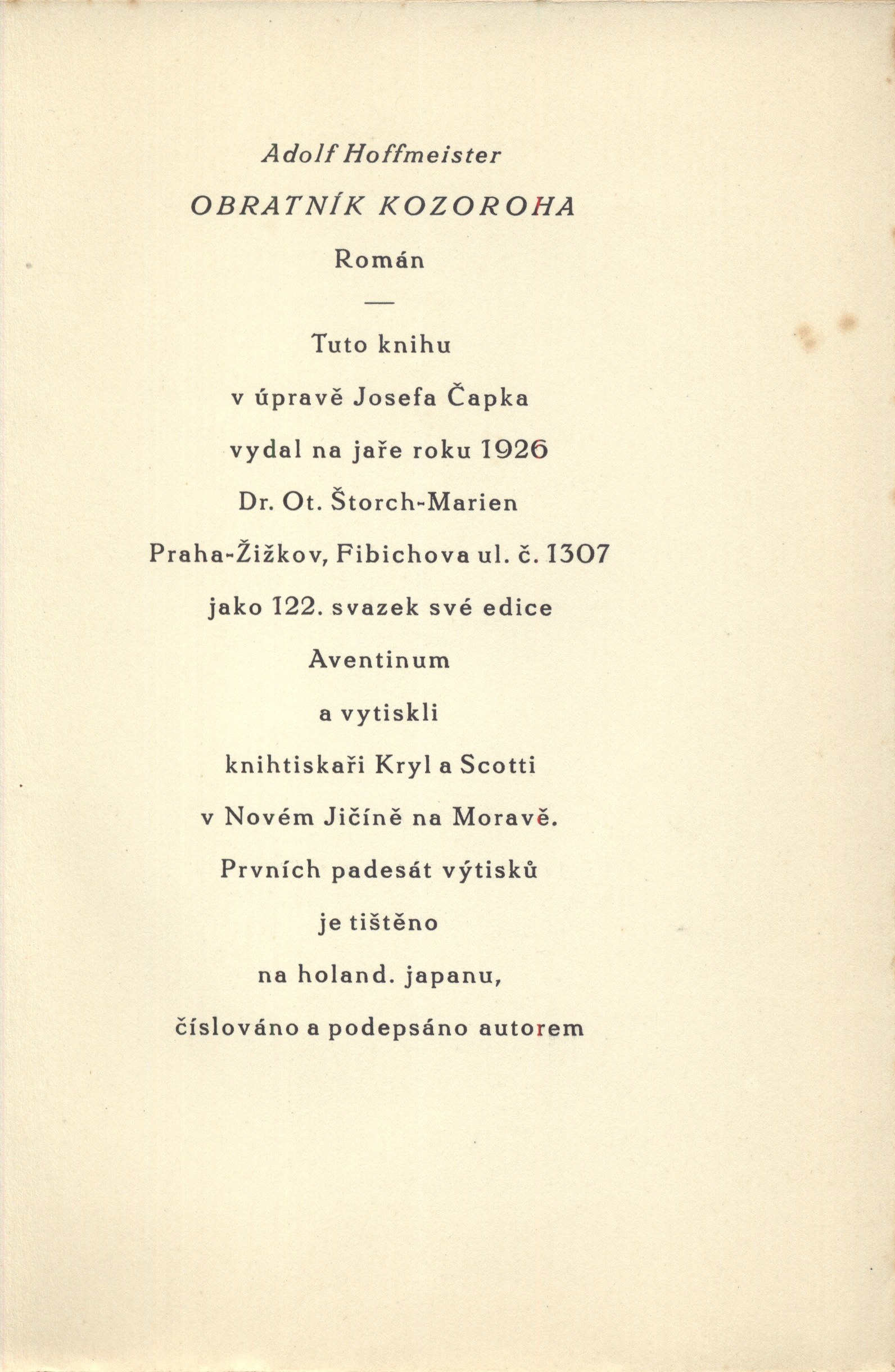 "Prvních padesát výtisků je tištěno na holand. japanu, číslováno a podepsáno autorem" -- Tiráž