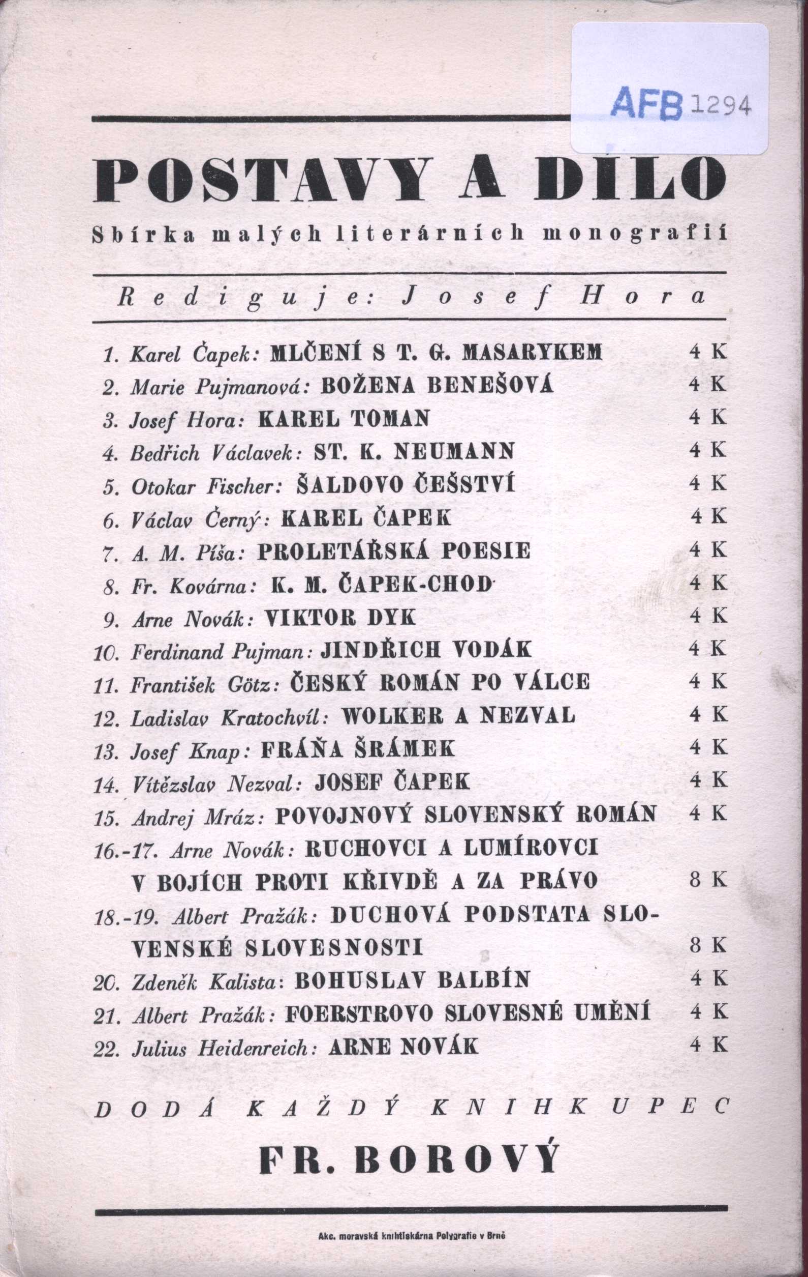 Postavy a dílo, (Fr. Borový)Země vyd. -cs Jazyk dok. čeština Poznámky Obálka. - Na zadní straně obálky nakladatelská upoutávka na vydané tituly v edici Postavy a dílo.