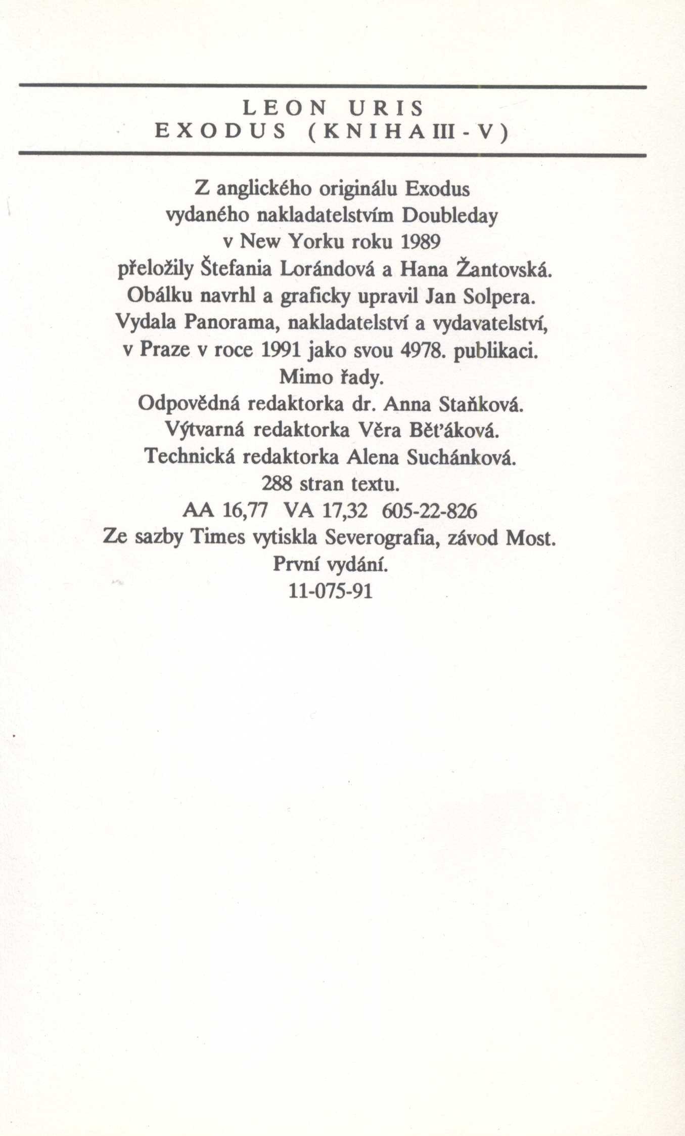 Názvové údaje Exodus. Kniha III. - V. / Leon Uris ; z anglického originálu Exodus přeložily Štefania Lorándová a Hana Žantovská Osobní jméno Uris, Leon, 1924-2003 (Autor) Další autoři Lorándová, Štefania (Překladatel) Žantovská, Hana, 1921-2004 (Překladatel) Solpera, Jan, 1939- (Autor obálky) (Knižní grafik) Korp. Panorama (nakladatelství a vydavatelství) (Nakladatel, vydavatel) Severografia (tiskárna, Most) (Tiskař) Další var.názvy Kniha III - V Exodus : svazek 2 Údaje o vydání První vydání Nakladatel Praha : Panorama, 1991 Výrobce Most : Severografia, závod Most Rozsah 280 stran : ilustrace, mapy ; 20 cm ISBN 80-7038-181-7 (svazek 2 ; brožováno) Země vyd. Česko Jazyk dok. čeština Jazyk orig. angličtina Poznámky Obálku navrhl a graficky upravil Jan Solpera
