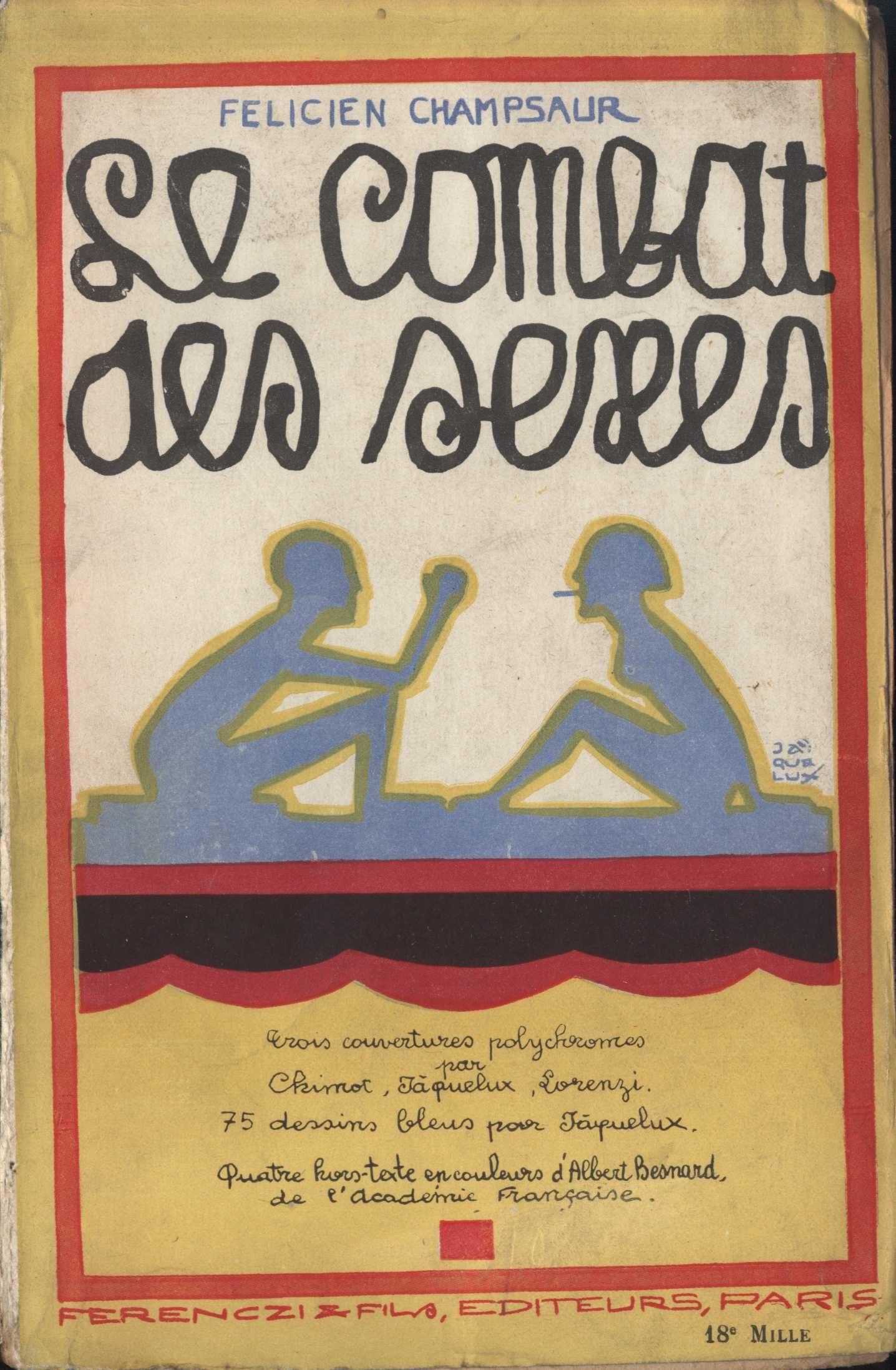 Názvové údaje Le combat des sexes / Félicien Champsaur ; Interlude: Les noces du rêve ; couvertures polychromes, par Chimot et Lorenzi ; 75 dessins bleus par Jaquelux ; quatre hors-texte en couleurs d'Albert Besnard Osobní jméno Champsaur, Félicien, 1859-1934 (Autor) Další autoři Besnard, Paul-Albert, 1849-1934 (Ilustrátor) Jaquelux, Lucien (Autor obálky) Chimot, Édouard, 1880-1959 (Ilustrátor) (Autor obálky) Lorenzi, Fabius (Ilustrátor) (Autor obálky) Korp. J. Ferenczi et fils (Paris (Francie)) (Nakladatel, vydavatel) Imprimerie Ramlot et Cie (tiskárna) (Tiskař) Údaje o vydání 18e mille Nakladatel Paris : J. Ferenczi et fils, 1927 Výrobce (Imprimerie Ramlot et Cie) Rozsah 246 s., [76] s. příl. : il. ISBN brož. Země vyd. Francie Jazyk dok. francouzština Poznámky Barevná zdobená obálka (Jaquelux). - Informace o dalších dílech autora. - V rámci nákladu tři přednostní výtisky ("papier pur fil" z papíren Lafuma). - Ilustrovaný titulní list (motivem z obálky). - Mezi stranami 96 a 97 je vbrožováno "interlude" odtéhož autora "Les noces du rêve: baller en deux actes", opatřené vlastní barevnou obálkou (zdobenou kresbami Chimota a Lorenziho) a tištěné na křídovém papíře, o rozsahu sedmdesáti šesti stran (včetně obálky a vlepovaných příloh). - Příloha tištěná modře a ilustrovaná množstvím ilustrací v textu od Jaqueluxe a rovněž čtyřmi vlepenými barevnými obrazovými přílohami Alberta Besnarda.