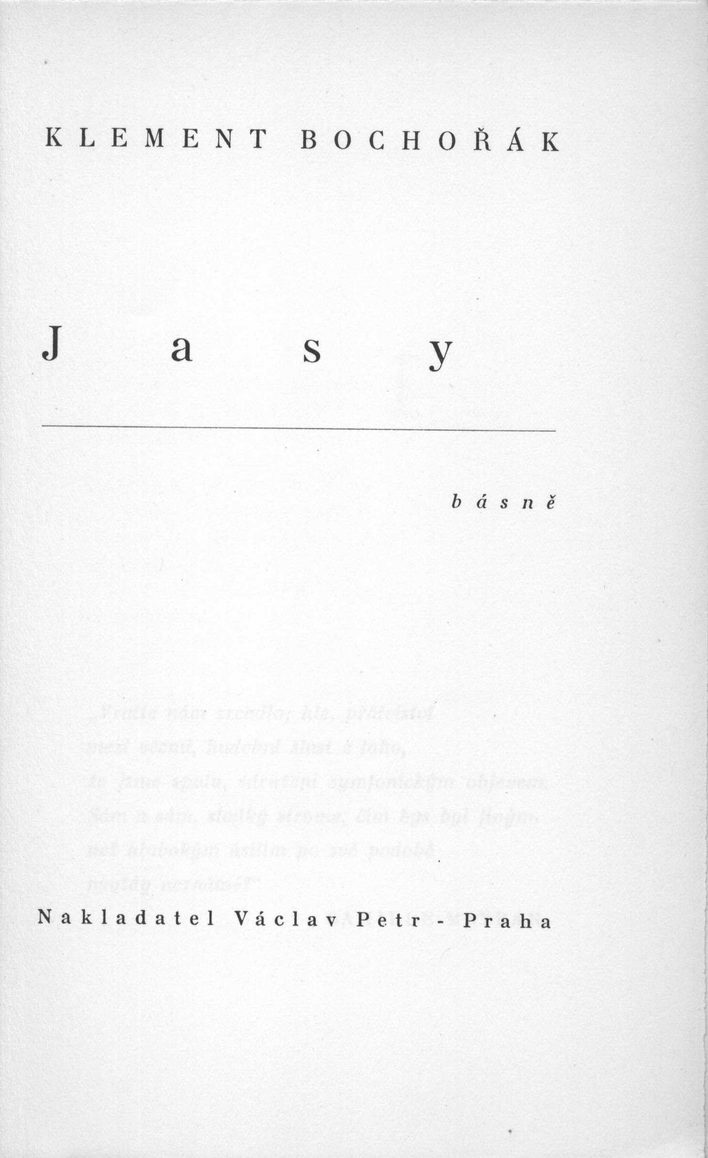 Názvové údaje Jasy : básně / Klement Bochořák ; [obálka a úprava Jaroslava Švába] Osobní jméno Bochořák, Klement, 1910-1981 (Autor) Další autoři Šváb, Jaroslav, 1906-1999 (Autor obálky) (Knižní grafik) Korp. Václav Petr (nakladatelství) (Nakladatel, vydavatel) Osvěta (tiskárna) (Tiskař) Nakladatel Praha : Václav Petr, 1940 Výrobce vytiskla „Osvěta“, společnost s o. r.) Rozsah 47 s. ; 21 cm ISBN brož. Edice Erb : sbírka poesie ; svazek 4