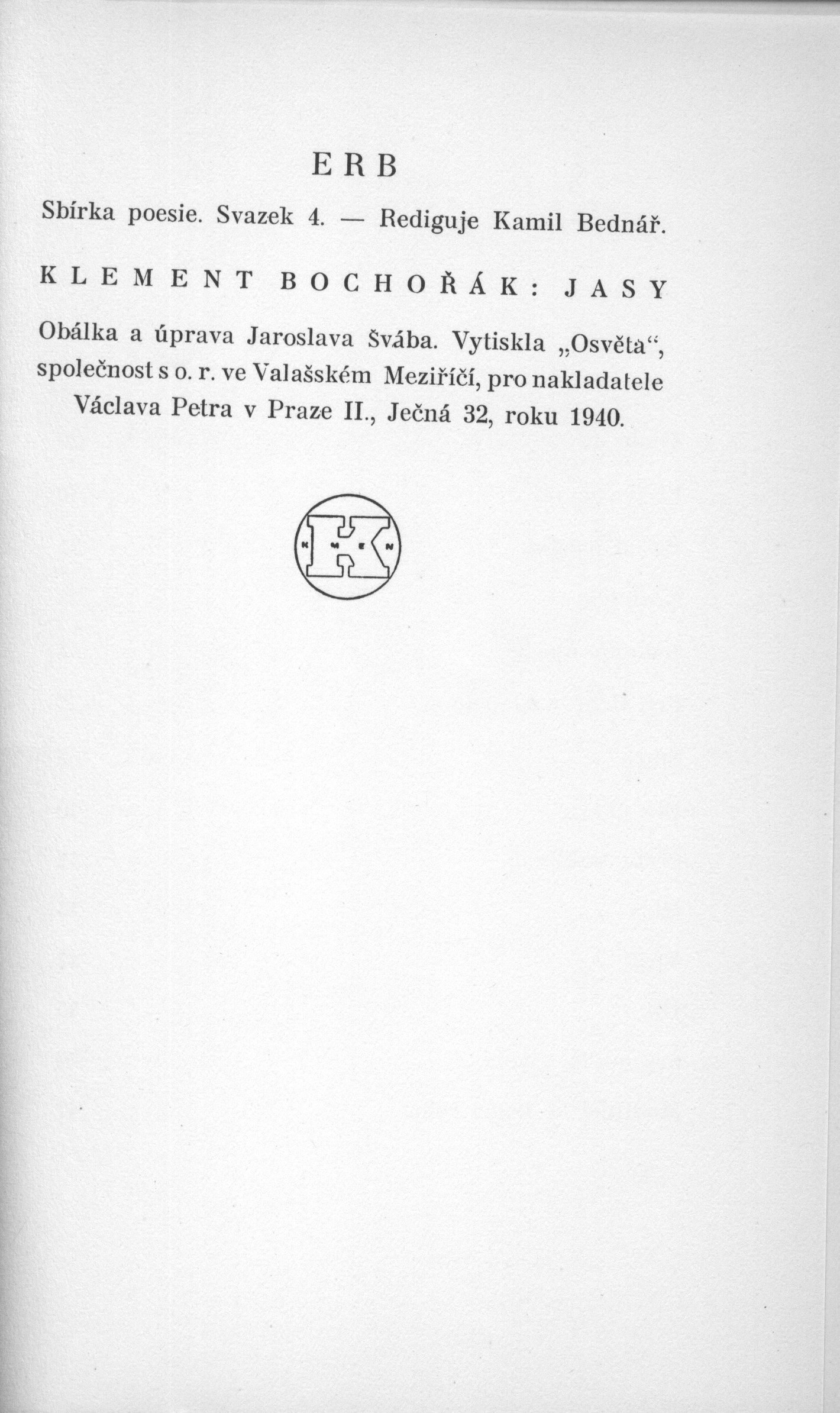 Druh dok. monografie Klíčová slova česká literatura * poezie * básně MDT 821.162.3 * 82-1 Uživatelské pole PNP U sign. C12b 14958 (brožovaný výtisk) typizovaná obálka (J. Šváb) se značkou edice. - Patitul a ediční značka. - Titulní list. - Obsah. - Edice nad tiráží se značkou Kmene (J. Kaplický - neuvedeno), která se opakuje i na zadní straně obálky. - Ochranná papírová obálka z průsvitky. Sign. C12b 14958 dar Sokol Liboc. Tiráž: "Erb. Sbírka poesie. Svazek 4. Rediguje Kamil Bednář. Klement Bochořák: Jasy. Obálka a úprava Jaroslava Švába. Vytiskla „Osvěta“, společnost s o. r. ve Valašském Meziříčí, pro nakladatele Václava Petra v Praze II., Ječná 32, roku 1940." Rozsah: 47, [5] s. Rozměr: 20,4 cm Signatura Přír.číslo Lokace Info C12b 14958 1917/2013 Sbírka