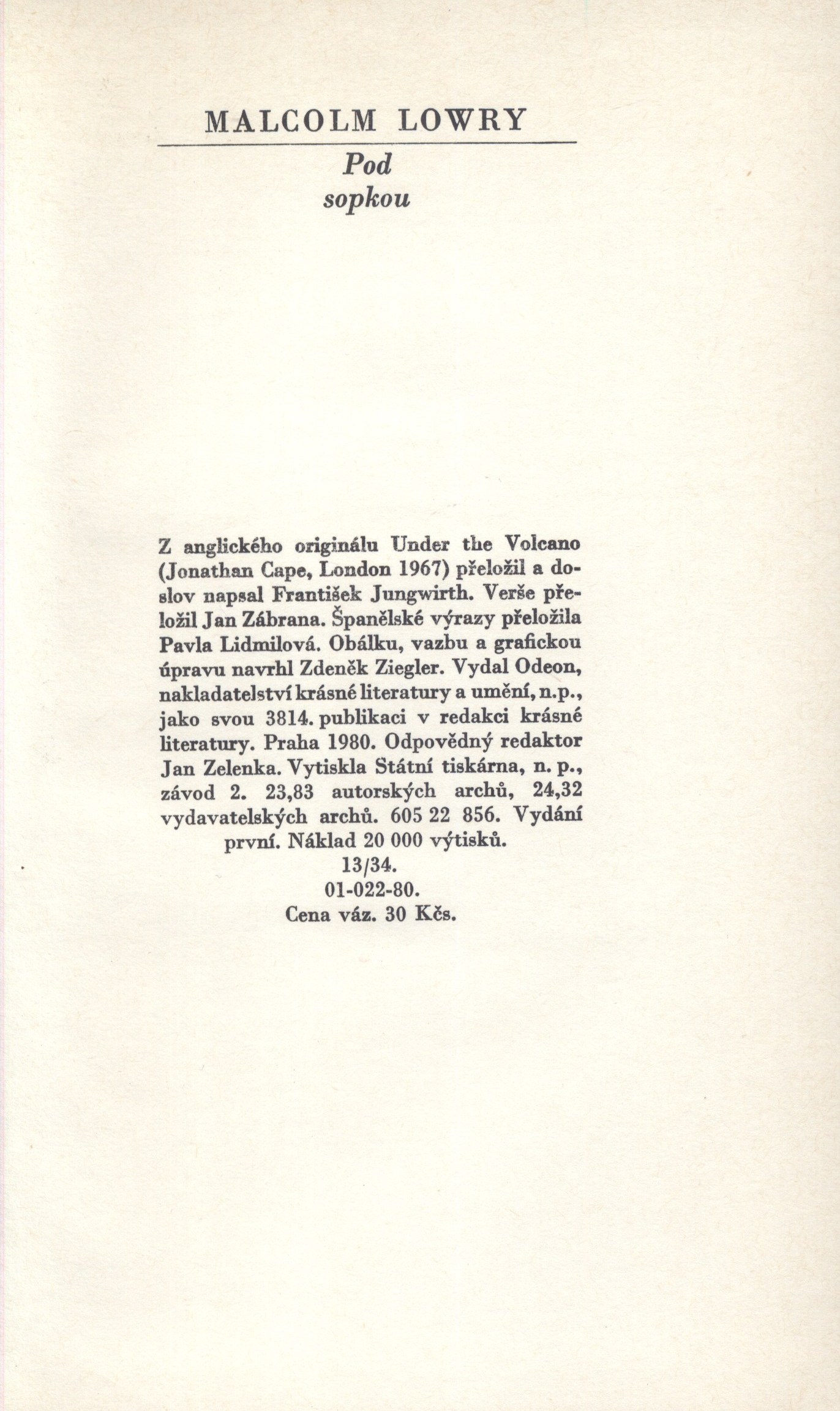 Názvové údaje Pod sopkou / Malcolm Lowry ; z anglického originálu Under the Volcano ... přeložil František Jungwirth, verše přeložil Jan Zábrana, španělské výrazy přeložila Pavla Lidmilová Osobní jméno Lowry, Malcolm, (Autor) 1909-1957 Další autoři Zábrana, Jan, 1931-1984 (Překladatel) Jungwirth, František, 1920-1997 (Překladatel) (Autor doslovu, tiráže atd.) Lidmilová, Pavla, 1932-2019 (Překladatel) Ziegler, Zdeněk, 1932-2023 (Autor obálky) Korp. Odeon (nakladatelství) (Nakladatel, vydavatel) Státní tiskárna v Praze (Tiskař) Nakladatel Praha : Odeon, 1980 Výrobce [Praha] : Státní tiskárna, n. p., závod 2 Rozsah 501 stran ; 21 cm Osobní hesla Lowry, Malcolm, 1909-1957 - anglický básník a spisovatel Klíčová slova skotská literatura * anglicky psaná literatura * Lowry M. * próza * román * překlad * Jungwirth F. Počet ex. 1, z toho volných 1 Druh dok. monografie Signatura VZinková 0202