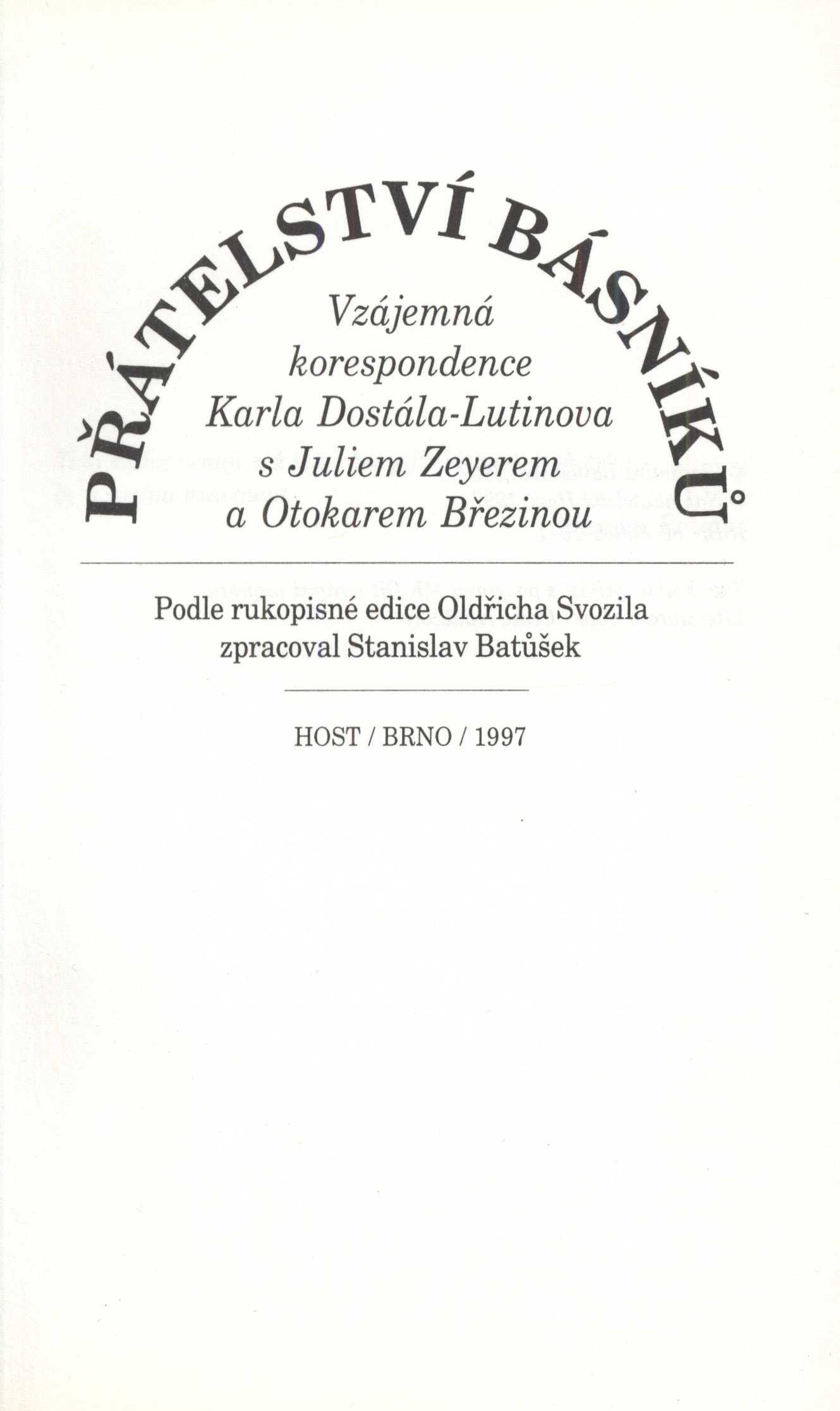 1. Názvové údajePřátelství básníků : vzájemná korespondence Karla Dostála-Lutinova s Juliem Zeyerem a Otokarem Březinou / podle rukopisné edice Oldřicha Svozila zpracoval Stanislav Batůšek ; typografie Boris Mysliveček ; editor Petr Cekota