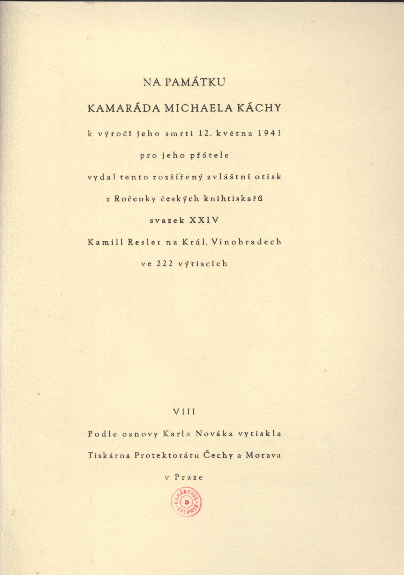 U sign. KaG XXVIII A2 20: "Na památku kamaráda Michaela Káchy k výročí jeho smrti 12. května 1941 pro jeho přátele vydal tento rozšířený zvláštní otisk z Ročenky českých knihtiskařů svazek XXIV Kamill Resler na Král. Vinohradech ve 222 výtiscích. Podle osnovy Karla Nováka vytiskla Tiskárna Protektorátu Čechy a Morava v Praze." - Na předposlední straně knihy dedikace perem: "Panu Jiřímu Karáskovi ze Lvovic v létě 1941 Dr. Resler."