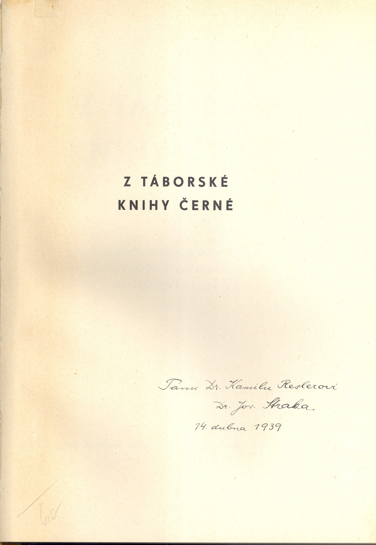 Sign. Resler 84: na s. [1] autorova rukopisná dedikace Kamilu Reslerovi: "Panu Dr. Kamilu Reslerovi Dr. Jos. Straka. 14. dubna 1939"