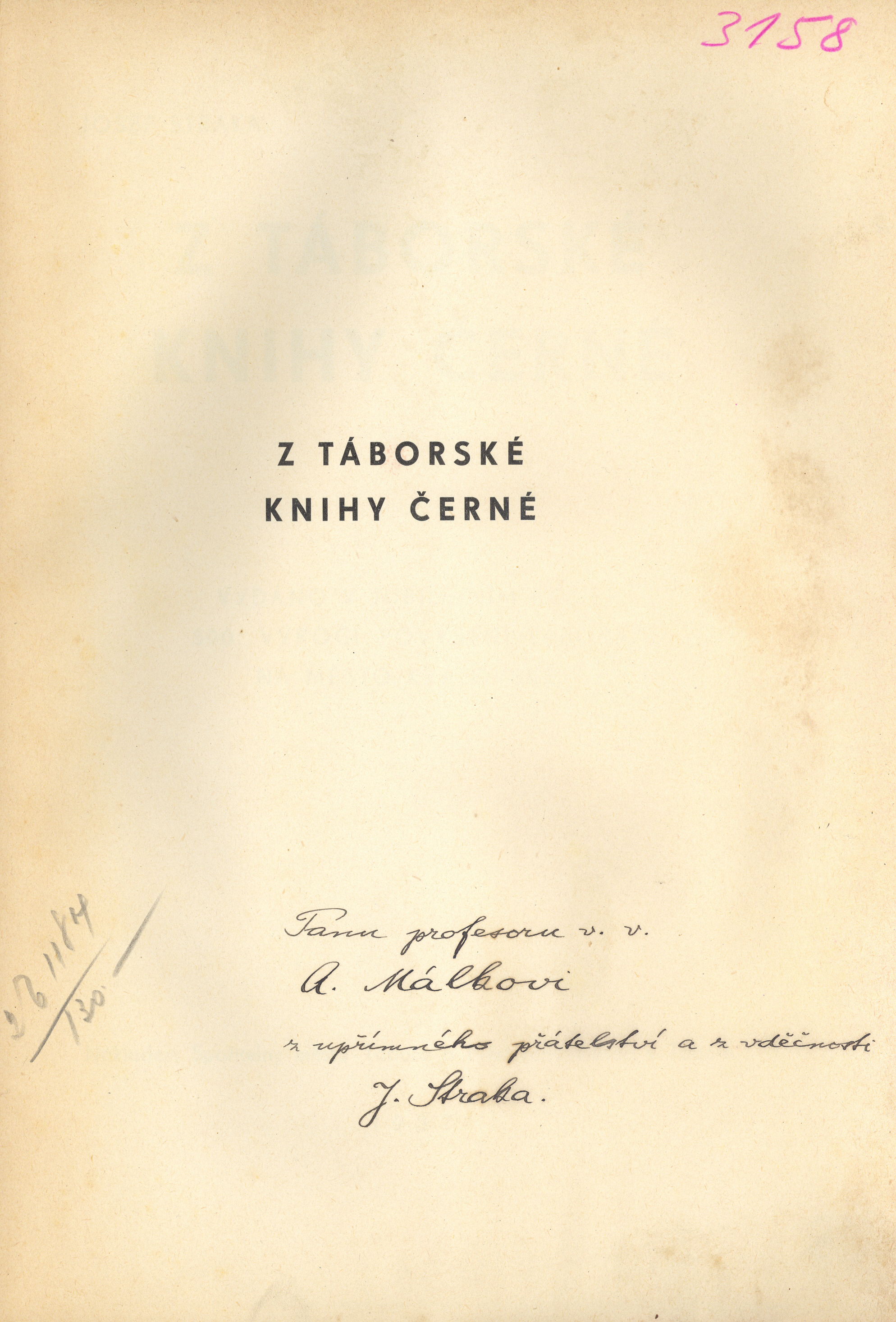 Sign. J M VIII 12: na s. [1] autorova rukopisná dedikace Antonínu Málkovi: "Panu profesoru v. v. A. Málkovi z upřímného přátelství a z vděčnosti věnuje J. Straka".