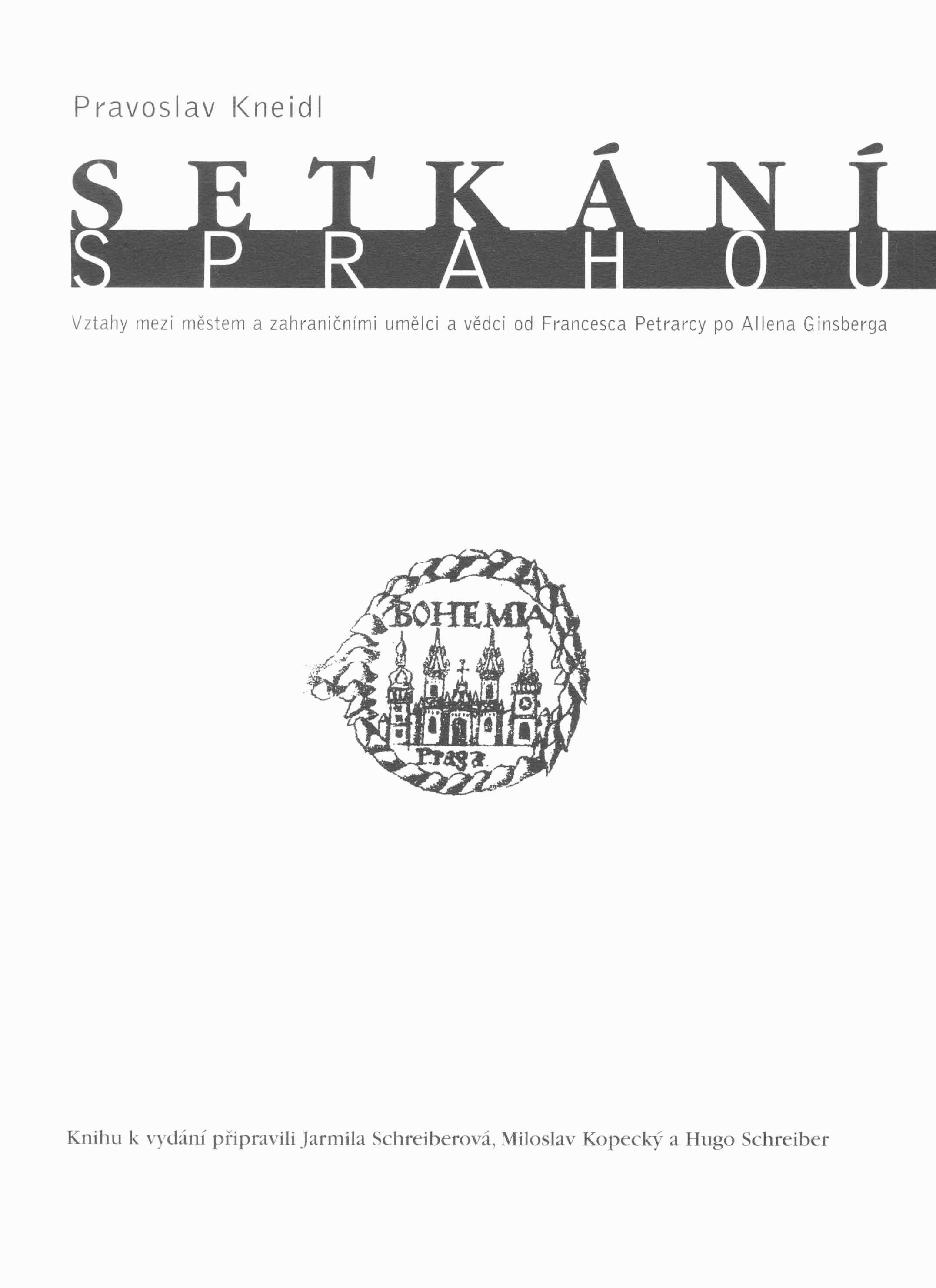 Setkání s Prahou : vztahy mezi městem a zahraničními umělci a vědci od Francesca Petrarcy po Allena Ginsberga / Pravoslav Kneidl ; knihu k vydání připravili Jarmila Schreiberová, Miloslav Kopecký a Hugo Schreiber ; [předmluva Jiří T. Kotalík ; návrh obálky a vazby, grafická úprava Jan Kneidl]. -- 1. vyd. -- Praha : Perseus, 2005. -- 435 s. : il., portréty, faksim. -- Zdobený barevný přebal a vazba. - Nakladatelská značka na vakátě. - Zdobený patitul a titulní list. - Slovo primátora hl. m. Prahy. - Předmluva. - Úvod. - Osobnosti. - Černobílé fotografie, ilustrace a faksimile. - Ediční poznámka. - Anglické, francouzské a německé resumé. - Obsahuje bibliografii, bibliografické odkazy a rejstřík. - Obsah. -- Resumé: Kniha podává přehled významných zahraničních osobností, zejména literátů, kteří navštívili Prahu v období od 14. století do druhé poloviny 20. století.. -- Resumé: edle spisovatelů jsou v seznamu zahrnuti i významní světoví badatelé a vědci s ohledem na jejich literární působení. Medailony jednotlivých osobností jsou přehledné. Vedle jména a životopisných dat je připojena stručná charakteristika, dále autobiografické údaje, přehled hlavních děl a okolnosti návštěvy Prahy, včetně případných ukázek literární tvorby nebo korespondence, vztahující se k tomuto městu. -- ISBN : 80-239-5506-3 (váz.).