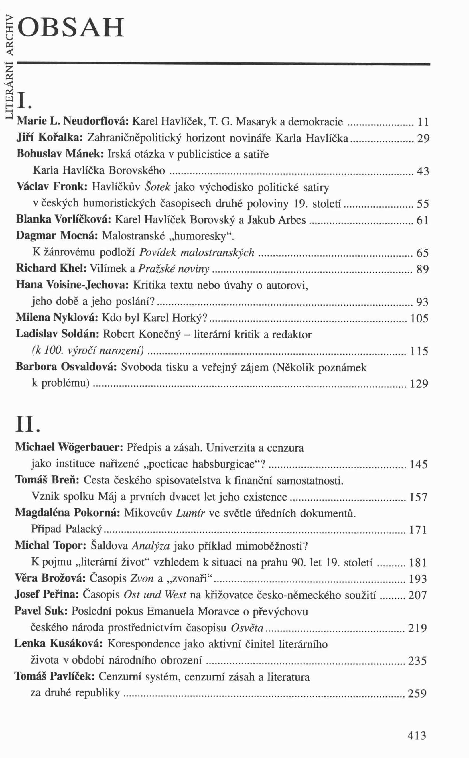 Title information Literární archiv : sborník Památníku národního písemnictví = Jahrbuch des Museums des tschechischen Schrifttums = Annual of the Museum of the Czech Literature = Mémoires du Musée de la littérature tchèque. Spisovatelé, společnost a noviny v proměnách doby : k 150. výročí úmrtí Karla Havlíčka / odpovědná redaktorka Jarmila Schreiberová ; grafická úprava David Martinek ; obálka a technická redakce Zdeněk Freisleben Další autoři Schreiberová, Jarmila, 1949- (Publishing director) Martinek, David, 1972- (Book designer) Freisleben, Zdeněk, 1947- (Bookjacket designer) Corporation Památník národního písemnictví (muzeum literatury) (Publisher) Tiskárna GLOS Semily, s. r. o. (Printer) Roč., číslo 38, 2006 Další var.názvy Spisovatelé, společnost a noviny v proměnách doby : k 150. výročí úmrtí Karla Havlíčka Edition statement Vydání první Publication Praha : Památník národního písemnictví, 2006 Manufacture Semily : Tiskárna Glos Semily, s. r. o. Scope 414 stran : ilustrace, portréty, faksimile ; 23 cm ISBN 80-85085-75-5 (brožováno) Country Czech Republic Language Czech Note V příloze čb. fotografie a faksimile. - Obsahuje bibliografie a bibliografické odkazy. - Anglická resumé. - 400 výtisků
