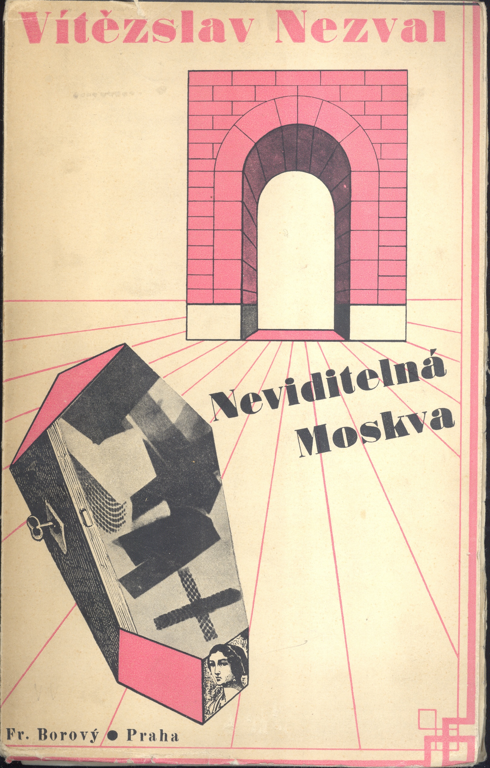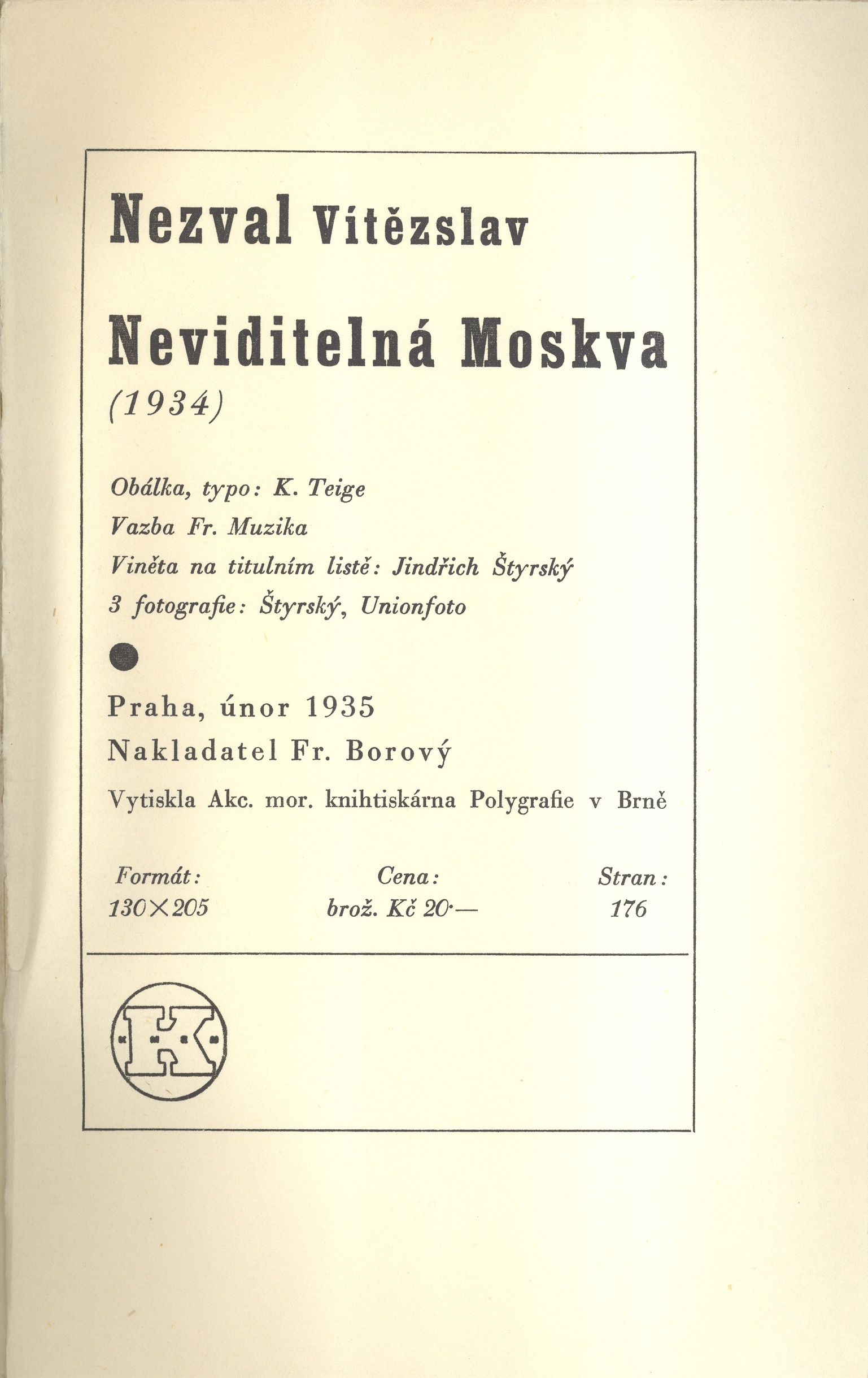 Neviditelná Moskva : [1934] / Vítězslav Nezval ; [obálka, typo K. Teige ; vazba Fr. Muzika ; viněta na titulním listě Jindřich Štyrský ; 3 fotografie Štyrský, Unionfoto]. -- Praha : Fr. Borový, 1935 (v Brně :. -- vytiskla Akc. mor. knihtiskárna Polygrafie). -- 171, [5] s., [3] listy obr. příl. : il. ; 21,5 cm. -- Zdobená obálka. - Na přední záložce recenze na autora. - Na vakátě nakladatelská značka. - Patitul. - Titulní list s ilustrací (vinětou). - Mimo stránkování vloženy 3 černobílé fotografie. - Obsah. - Tiráž se značkou nakladatelského sdružení Kmen. - Na zadní záložce upoutávky na knihy autora. - Na zadní straně obálky opět značka Kmene.. -- Kniha obsahuje: 1. Surrealistický mlýn, 2. Neviditelná Moskva, 3. Deus ex machina. -- ISBN : brož.