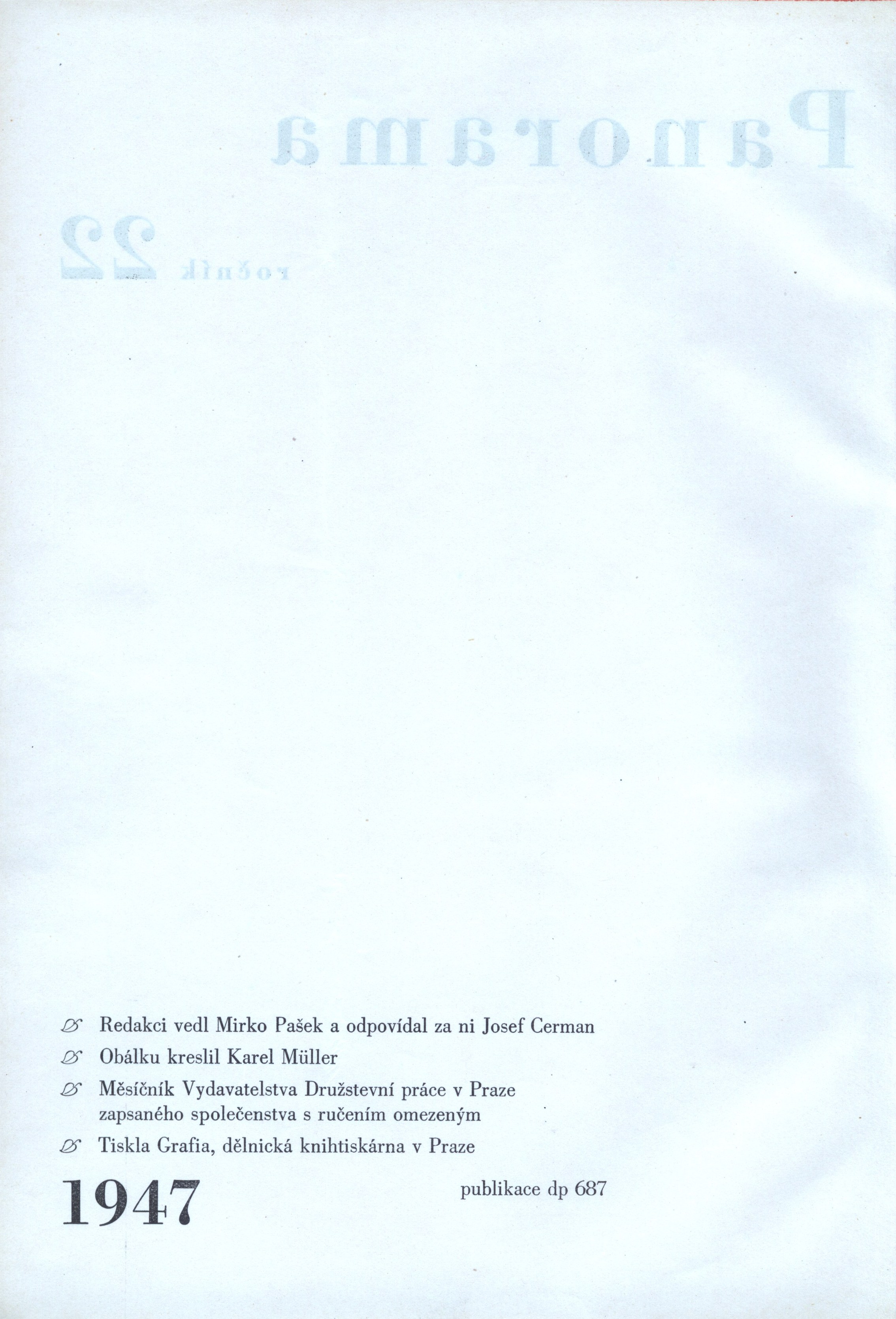 Rub titulního listu: "Redakci vedl Mirko Pašek a odpovídal za ni Josef Cerman. Obálku kreslil Karel Müller. Měsíčník Vydavatelstva Družstevní práce v Praze, zapsaného společenstva s ručením omezeným. Tiskla Grafia, dělnická knihtiskárna v Praze. 1947. Publikace DP 687."