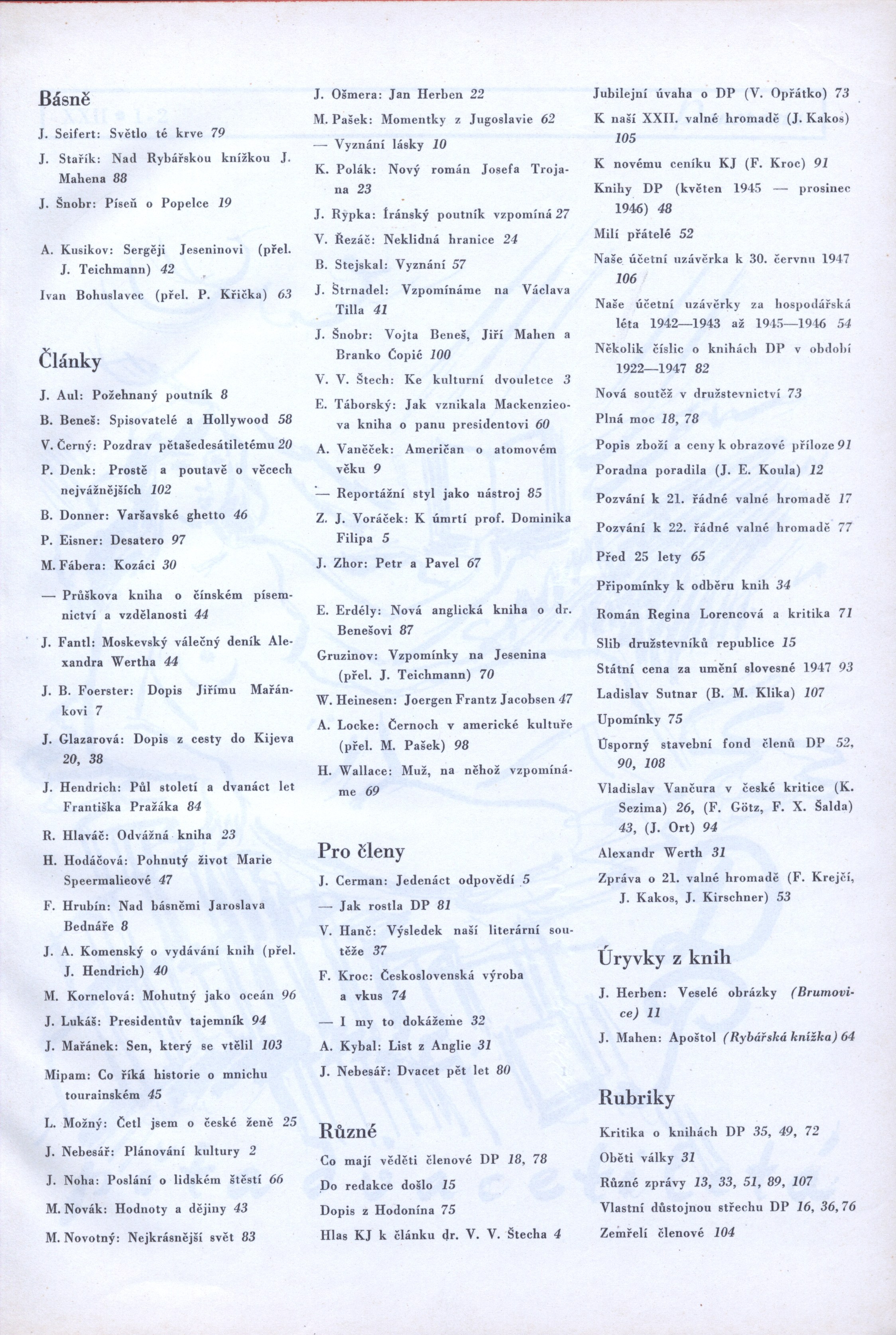 AnotaceVýznamný český nakladatelský časopis vydávaný nakladatelstvím Družstevní práce, v němž vycházely především publicistické příspěvky věnované kmenovým autorům a titulům aktuálně vydávaným. Bohatě ilustrovaný časopis - si v souladu se zaměřením nakladatelství - všímal rovněž soudobého životního stylu, uměleckého průmyslu, architektury a designu. - (kkper)