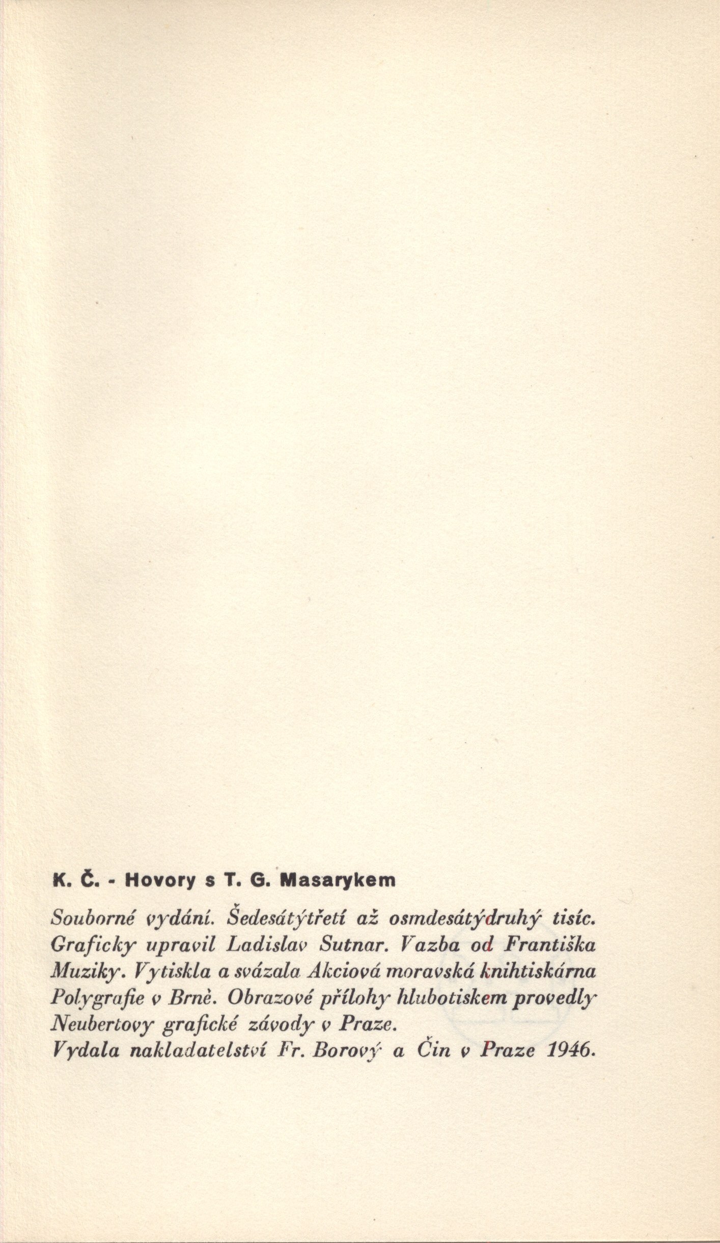 Druh dok. monografie Osobní hesla Masaryk, Tomáš Garrigue, 1850-1937 - politik, první čsl. president, filosof * Čapek, Karel, 1890-1938 - spisovatel, dramatik, novinář Klíčová slova česká literatura * rozhovory * Masaryk T. G. * vzpomínky * život * práce * myšlení * filozofické názory * politické názory * náboženská orientace * stol. 19., léta 50.-stol. 20., léta 30. MDT 821.162.3"19" * 929Masaryk, T. G. * (0:82-83) Uživatelské pole PNP Sign. AFB 1706 na vakátě razítko Archiv Fr. Borový č. N2146. U sign. Topič osobní knihovna Topiče a Milady Blekastad. U sign. Topič 0083 (vázaný výtisk) barevně zdobená obálka (?F. Muzika). - Bílá plátěná vazba (F. Muzika) s béžovým papírovám polepem, černá ražba textu i na červeném podkladu, též na hřbetu. - Na záložkách upoutávka na knihu. - Na přední předsádce razítko původní majitelky. - Patitul. - Jako frontispis 1. obrazová příloha v hnědém tónu. - Dvoubarevný titulní list. - Vloženo dalších 15 listů obrazových příloh v hnědém tónu (fotografické reprodukce). - Rejstřík osob. - Obsah. - Seznam příloh. - Tiráž. - Na rubu tiráže značka Kmene (J. Kaplický - neuvedeno). - Vakát. - Značka Kmene, která se opakuje, na zadní straně obálky a tiskárna. U sign. Topič 0083 razítko (zeleně): "Milada Blekastad, Incognito Terrasse 3, Oslo" U sign. Topič 0083 obálka poškozená, natržená, s chybějícími kousky. Prasklý předsádkový papír u hřbetu; jinak zachovalý výtisk. Rozsah: 351, [4] s., [1+15] l. obr. příl. Rozměr: 21,3 cm Signatura Přír.číslo Lokace Info AFB 1706 1910/AFB Sbírka Topič 0083 1086/2014 Sbírka