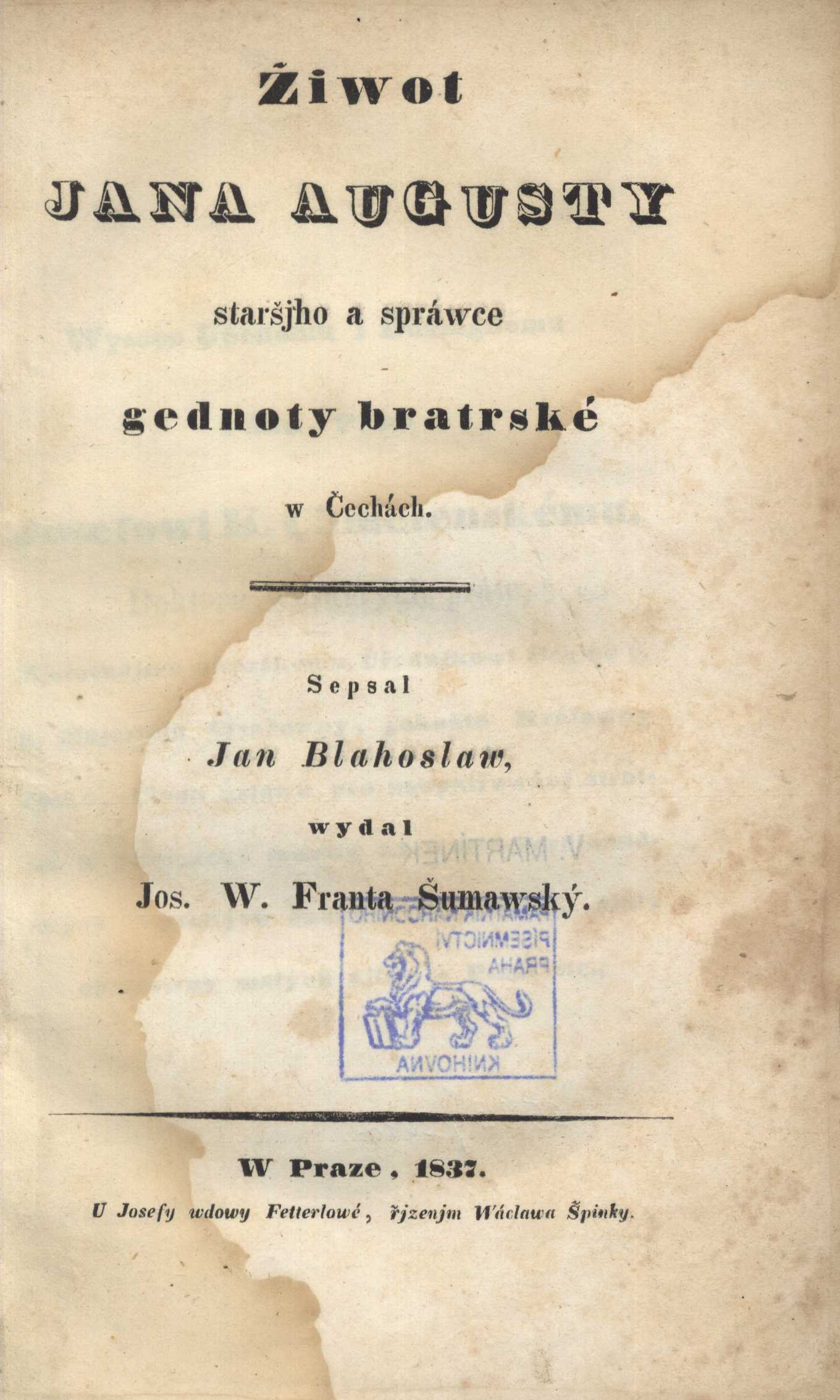 Názvové údaje Žiwot Jana Augusty staršjho a spráwce gednoty bratrské w Čechách / sepsal Jan Blahoslaw ; wydal Jos. W. Franta Šumawský Osobní jméno Blahoslav, Jan, 1523-1571 (Autor) Další autoři Bílek, Jakub, 1516-1581 (Autor) Franta Šumavský, Josef, 1796-1857 (Editor) Vetterlová z Wildenbrunnu, Josefa, činná 1819-1838 (Nakladatel, vydavatel) Špinka, Václav, 1797-1842 (Nakladatel, vydavatel) Další var.názvy Život Jana Augusty staršího a správce jednoty bratrské v Čechách Nakladatel W Praze : U Josefy wdowy Fetterlowé : řjzenjm Wáclawa Špinky, 1837 Rozsah xii, 124 s. ; 8° ISBN (váz.) Země vyd. Česko Jazyk dok. čeština Poznámky Frontispice s Rybičkovou rytinou J. Augusty. - Bibliografie Jana Augusty.