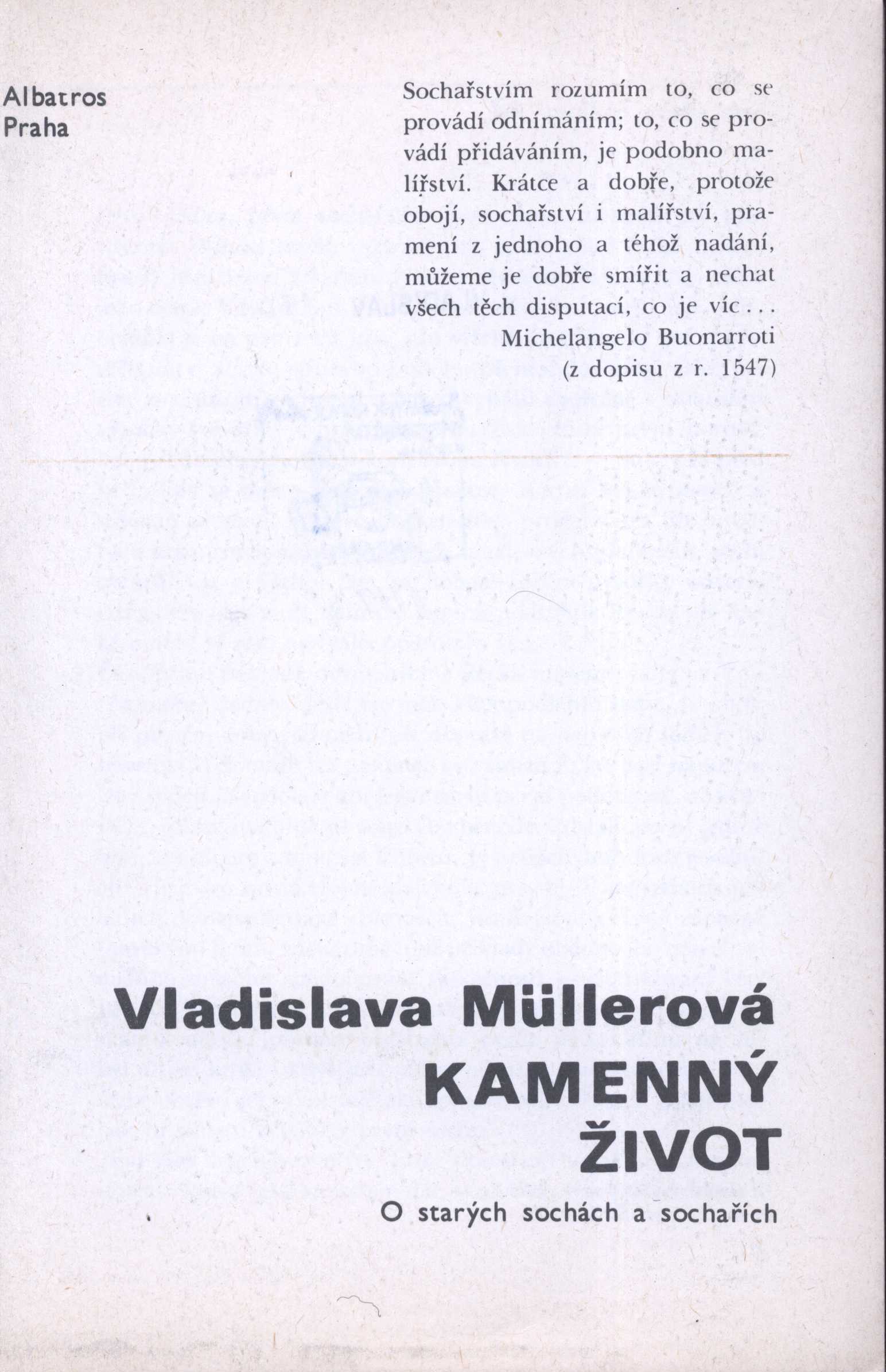$a Kamenný život : $b o starých sochách a sochařích / $c Vladislava Müllerová ; fotografie Pavel Štecha ; fotografie na frontispisu Jaroslav Krejčí ; graficky upravil, ilustrace vybral a obálku navrhl Michal Kudělka 250 $a 1. vydání 264 -1