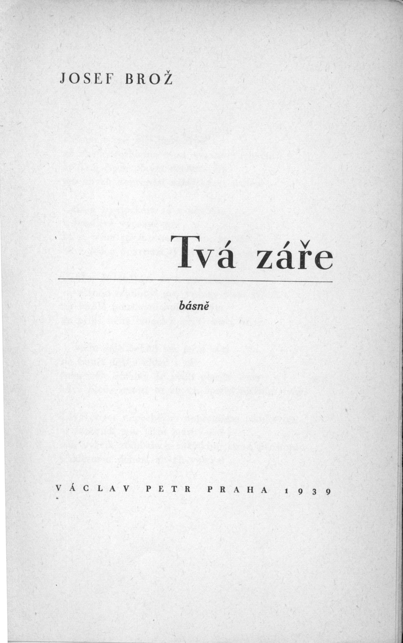 Názvové údaje Tvá záře : básně / Josef Brož ; [v úpravě Jaroslava Švába] Osobní jméno Brož, Josef, 1906-1947 (Autor) Další autoři Šváb, Jaroslav, 1906-1999 (Knižní grafik) Hellmuth-Brauner, Vladimír, 1910-1982 (Dedikant) Hellmuthová, Marta, 1917-1988 (Dedikátor) Korp. Václav Petr (nakladatelství) (Nakladatel, vydavatel) František Obzina (tiskárna, nakladatelství) (Tiskař) Nakladatel Praha : Václav Petr, 1939 Výrobce Knihtiskárna F. Obziny) Rozsah 36 s. ; 22 cm ISBN brož. Země vyd. Česko Jazyk dok. čeština Poznámky Barevná typograficky řešená obálka J. Švába. - Nakladatelský signet. - Patitul. - Titulní list. - Obsah. - Tiráž. - Náklad 500 výtisků.