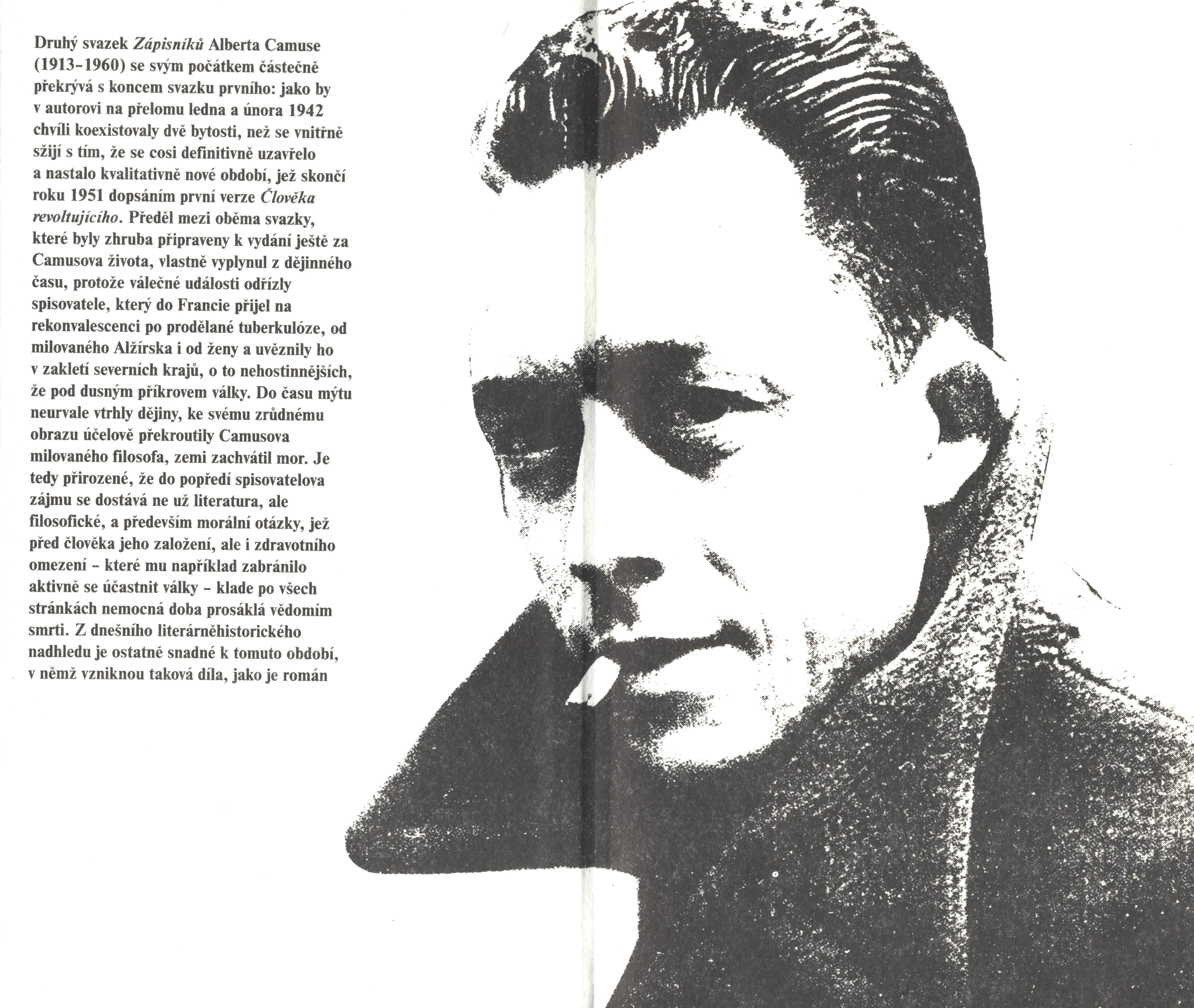 Názvové údaje Zápisníky II=02 : leden 1942 - březen 1951 / Albert Camus ; [z francouzského originálu ...] přeložili Vlasta Dufková a Josef Mlejnek ; [typografie Zdeněk Ziegler] Osobní jméno Camus, Albert, 1913-1960 (Autor) Další autoři Dufková, Vlasta, 1951- (Překladatel) Mlejnek, Josef, 1946- (Překladatel) Ziegler, Zdeněk, 1932-2023 (Typograf) Údaje o vydání 1. vyd. Nakladatel Praha : Mladá fronta, 1999 Rozsah 297 s. - [5] s. ISBN 80-204-0711-1 (váz.) Země vyd. Česko Jazyk dok. čeština Jazyk orig. francouzština Poznámky Průsvitná, černým textem popsaná obálka. - Černošedá zdobená vazba.- Na přídeští a předsádkách černobílý portrét autora, text o něm a o knize. - Rozložený titulní list. - Poznámka editorů. - Bibliografické odkazy. - Životopisné údaje. - Bibliografie. - Přebal.