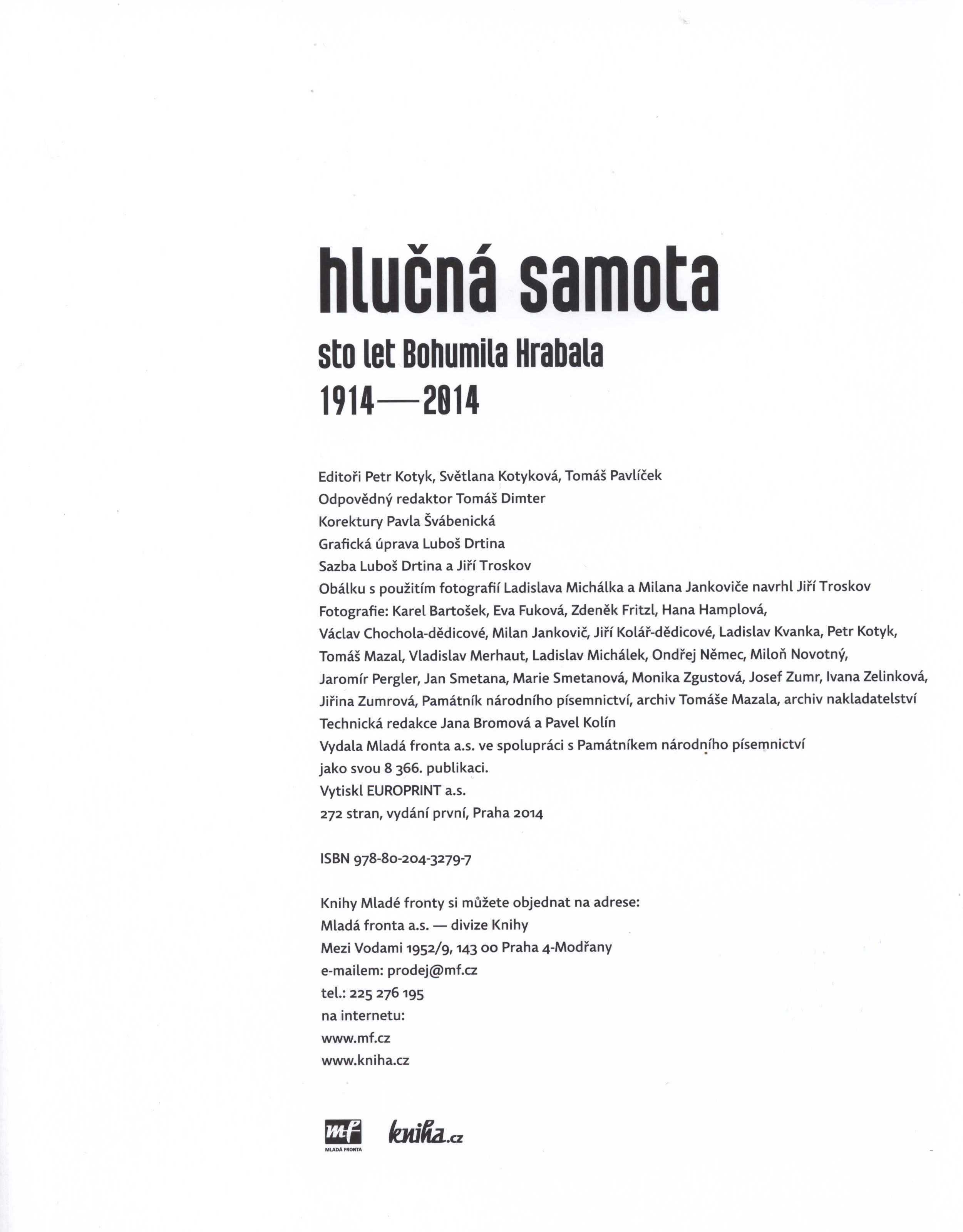 Názvové údaje Hlučná samota : sto let Bohumila Hrabala : 1914-2014 / editoři Petr Kotyk, Světlana Kotyková, Tomáš Pavlíček ; grafická úprava Luboš Drtina ; sazba Luboš Drtina a Jiří Troskov ; obálku s použitím fotografií Ladislava Michálka a Milana Jankoviče navrhl Jiří Troskov ; fotografie: Karel Bartošek, Eva Fuková, Zdeněk Fritzl, Hana Hamplová, Václav Chochola-dědicové, Milan Jankovič, Jiří Kolář-dědicové, Ladislav Kvanka, Petr Kotyk, Tomáš Mazal, Vladislav Merhaut, Ladislav Michálek, Ondřej Němec, Miloň Novotný, Jaromír Pergler, Jan Smetana, Marie Smetanová, Monika Zgustová, Josef Zumr, Ivana Zelinková, Jiřina Zumrová, PNP, archiv Tomáše Mazala, archiv nakladatelství Další autoři Kotyk, Petr, 1963- (Editor) (Fotograf) Kotyková, Světlana, 1963- (Editor) Pavlíček, Tomáš, 1972- (Editor) Drtina, Luboš, 1963- (Knižní grafik) (Sazeč) Troskov, Jiří, 1973- (Sazeč) Michálek, Ladislav, 1937-2014 (Fotograf) Jankovič, Milan, 1929-2019 (Fotograf) Bartošek, Karel, 1930-2004 (Fotograf) Fuková, Eva, 1927-2015 (Fotograf) Fritzl, Zdeněk (Fotograf) Hamplová, Hana, 1951- (Fotograf) Chochola, Václav, 1923-2005 (Fotograf) Kolář, Jiří, 1914-2002 (Fotograf) Kvanka, Ladislav (Fotograf) Mazal, Tomáš, 1956- (Fotograf) Merhaut, Vladislav, 1938-2021 (Fotograf) Němec, Ondřej, 1960- (Fotograf) Novotný, Miloň, 1930-1992 (Fotograf) Pergler, Jaromír (Fotograf) Smetana, Jan, 1918-1998 (Fotograf) Smetanová, Marie (Fotograf) Zgustová, Monika, 1957- (Fotograf) Zelinková, Ivana (Fotograf) Zumr, Josef, 1928-2024 (Fotograf) Zumrová, Jiřina, 1928-2021 (Fotograf) Korp. Mladá fronta (nakladatelství) (Nakladatel, vydavatel) Památník národního písemnictví (muzeum literatury) (Nakladatel, vydavatel) Europrint (tiskárna) (Tiskař) Další var.názvy Sto let Bohumila Hrabala Údaje o vydání Vydání 1. Nakladatel V Praze : Mladá fronta, 2014 Výrobce Praha : EUROPRINT a.s. Rozsah 269 stran : ilustrace (některé barevné), portréty, faksimile ; 29 cm ISBN 978-80-204-3279-7 (Mladá fronta : vázáno) Země vyd. Česko Jazyk dok. čeština Poznámky Vazba s tónovanou reprodukovanou fotografií a s dvoubarevným textem, černý hřbet s dvoubarevným textem a s nakladatelskou značkou. - Žluté předsádky. - Patitul. - Rozložený titulní list s tónovanou fotografií. - Věnování. - Úvod. - Barevné, tónované a černobílé fotografie a faksimile s popiskami. - Ediční poznámka. - Poznámka. - Poděkování. - Na zadní straně vazby biografická poznámka o B. Hrabalovi s tónovanou fotografií. - Přes knihu nakladatelská páska s anoncí knihy.