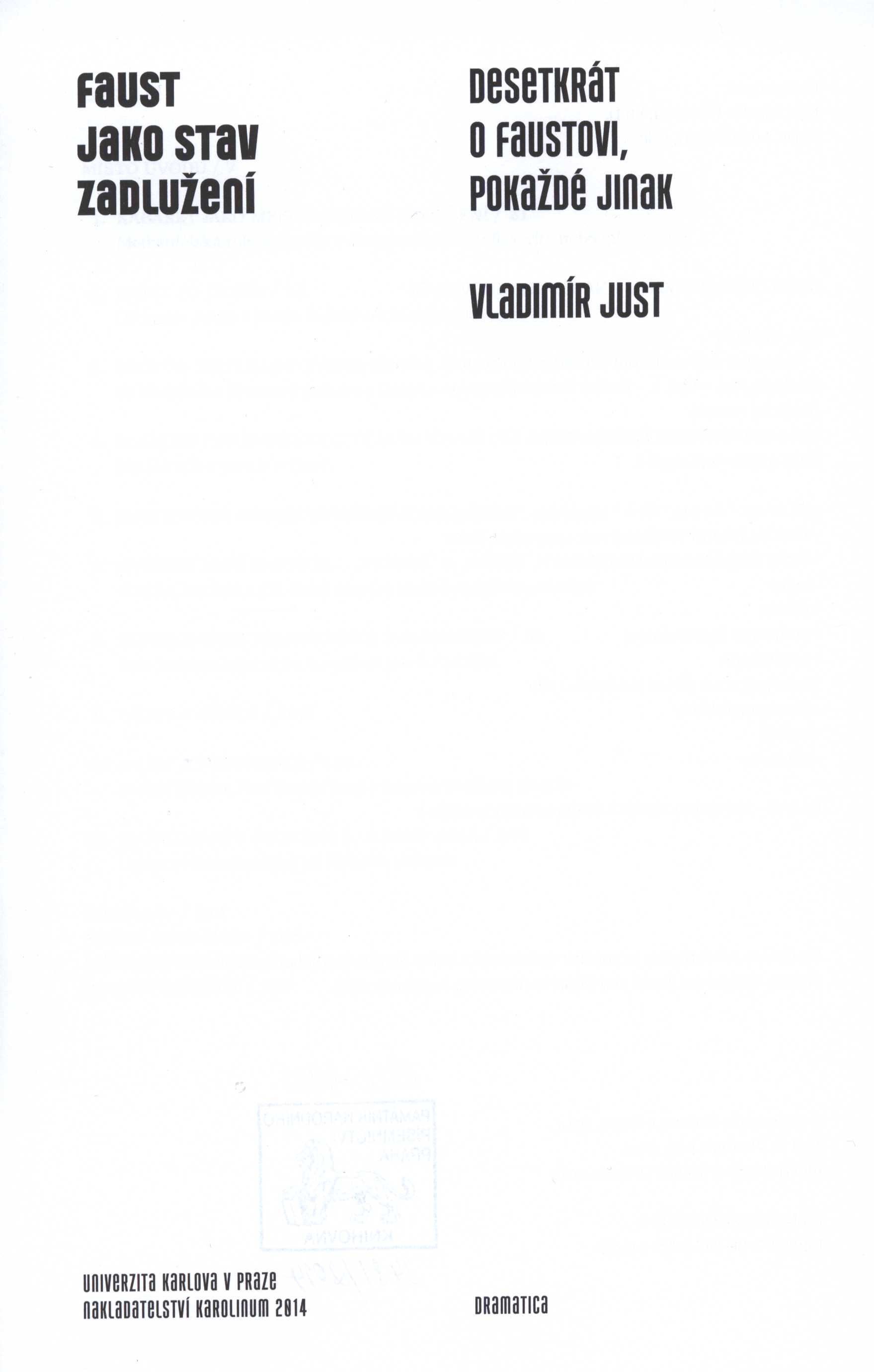 Názvové údaje Faust jako stav zadlužení : desetkrát o Faustovi, pokaždé jinak / Vladimír Just ; [grafická úprava Jan Šerých] Osobní jméno Just, Vladimír, 1946- (Autor) Další autoři Šerých, Jan, 1972- (Knižní grafik) Korp. Karolinum (nakladatelství, tiskárna) (Nakladatel, vydavatel) Tiskárna nakladatelství Karolinum (Tiskař) Další var.názvy Desetkrát o Faustovi, pokaždé jinak Údaje o vydání Vyd. 1. Nakladatel Praha : Karolinum, 2014 Výrobce (Tiskárna Nakladatelství Karolinum) Rozsah 177 s. : il. ISBN 978-80-246-2398-6 (brož.) Edice Dramatica