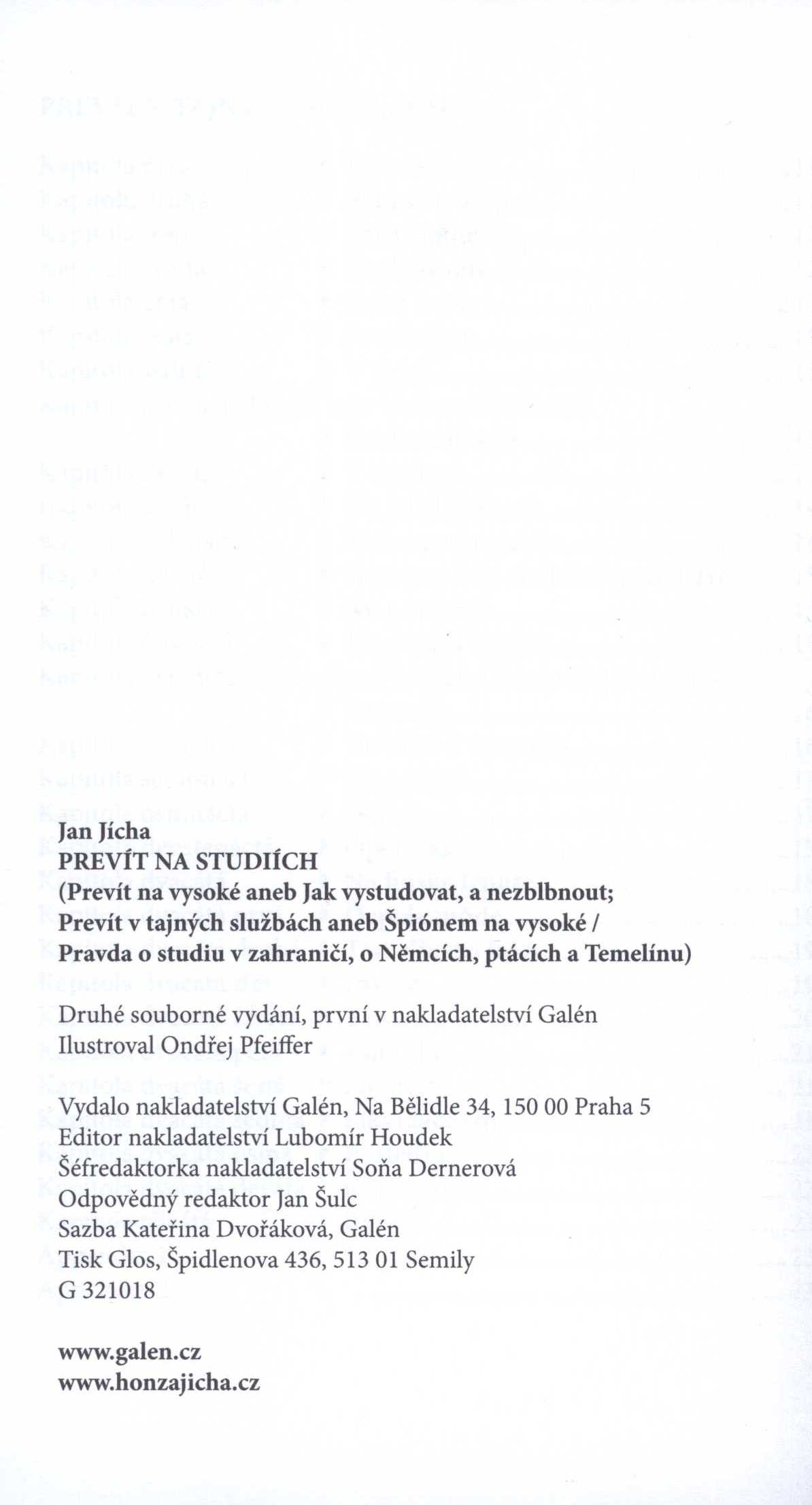 Názvové údaje Prevít na studiích / Jan Jícha ; [ilustroval Ondřej Pfeiffer] Osobní jméno Jícha, Jan, 1980- (Autor) Další autoři Pfeiffer, Ondřej, 1978- (Ilustrátor) Korp. Galén (nakladatelství) (Nakladatel, vydavatel) Glos (tiskárna) (Tiskař) Údaje o vydání 2. souborné vyd., 1. v nakl. Galén Nakladatel Praha : Galén, c2014 Výrobce Glos) Rozsah 233 s. : il. ISBN 978-80-7492-061-5 (brož.) Země vyd. Česko Jazyk dok. čeština Poznámky Zdobená barevná obálka. - Na záložce obálky bio-bibliografická poznámka o autorovi. - Nakladatelská značka. - Obsahuje bibliografii. - Obsah. - Na zadní straně obálky poznámka o knize.