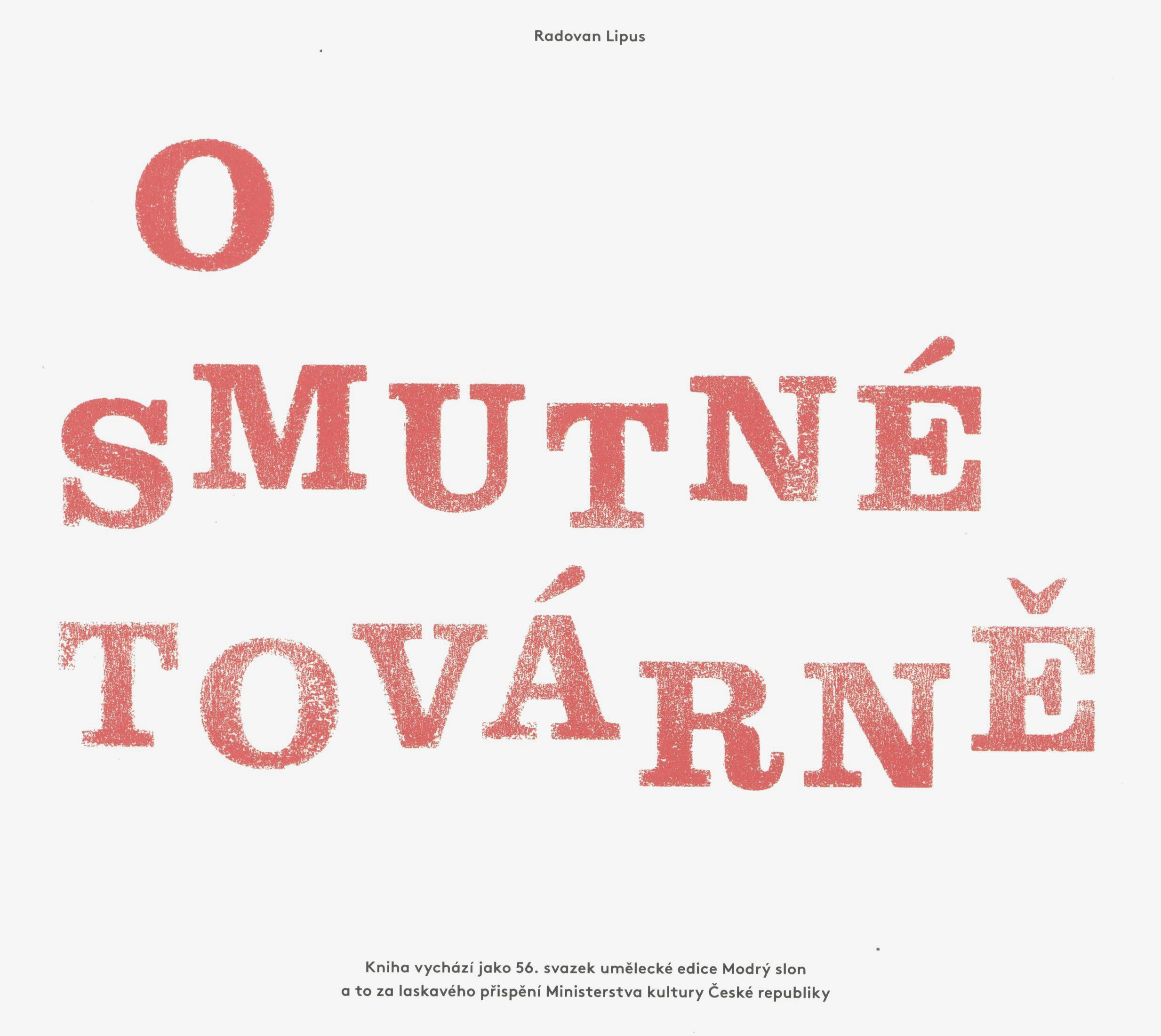 1. Názvové údajeO smutné továrně / Radovan Lipus ; [ilustrace Veronika Podzimková a David Vávra ; fotografie Zdeněk Helfert ; doslov Benjamin Fragner ; k vydání připravila Ivana Pecháčková ; grafický koncept a sazba ... Zuzana Lednická, Studio Najbrt]