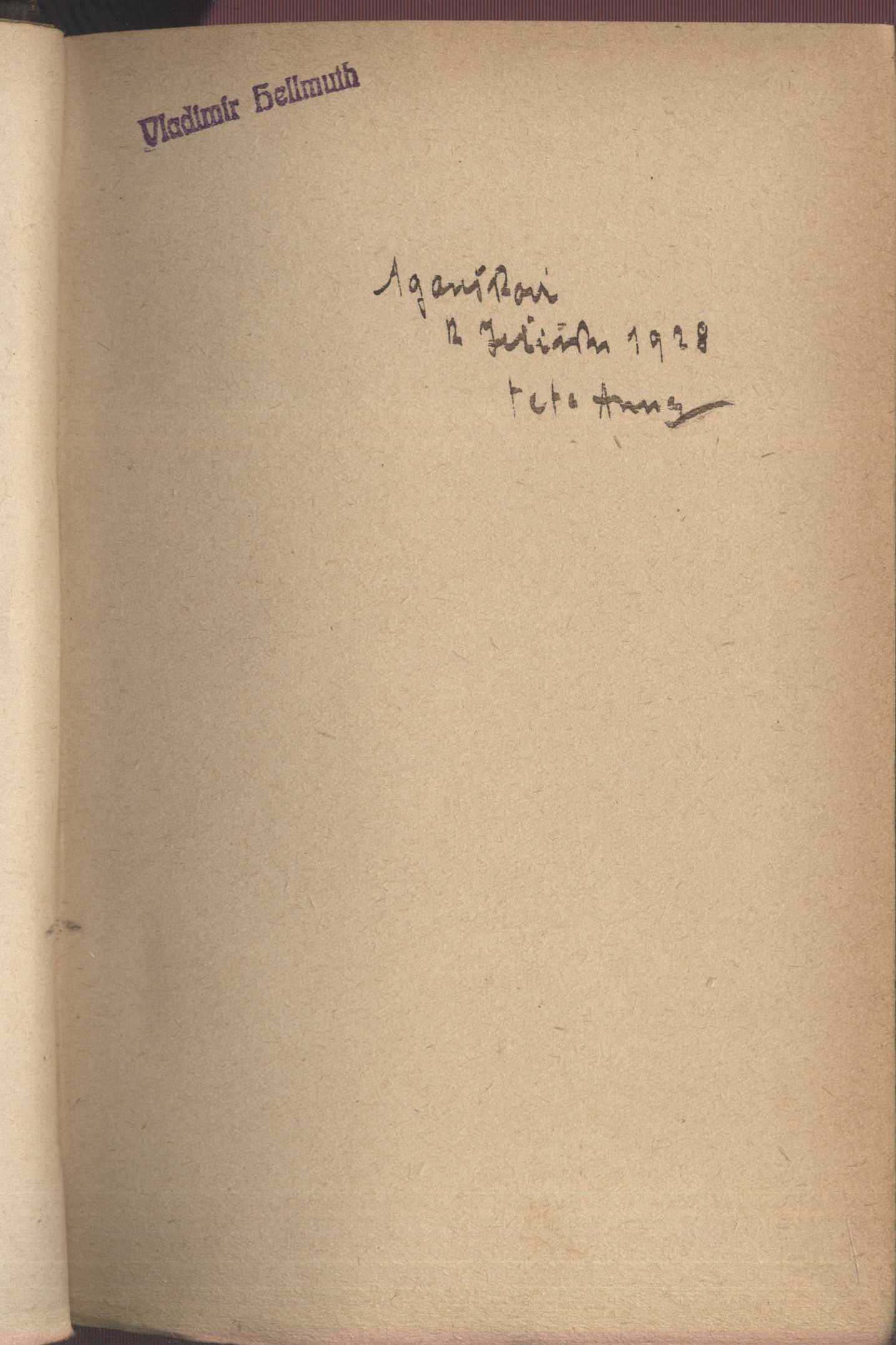 Signatura VHB 2012: Razítko Vladimíra Hellmutha. - Rukopisná dedikace Anny Bourgesové-Braunerové Vladimíru Hellmuthovi-Braunerovi: "Agouškovi k Ježíšku 1928 teta Anna".