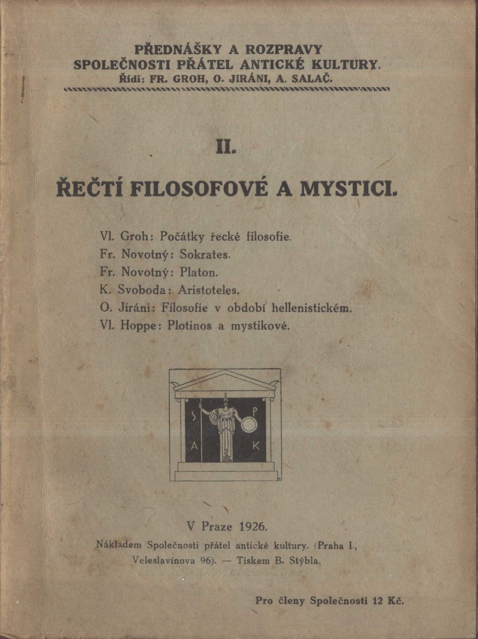 Přednášky a rozpravy Společnosti přátel antické kultury (Společnost přátel antické kultury)Země vyd. Česko Jazyk dok. čeština Poznámky Přední strana obálky i titulní list zdobeny nakladatelským signetem. - Poznámky pod čarou. - Bibliografické údaje.