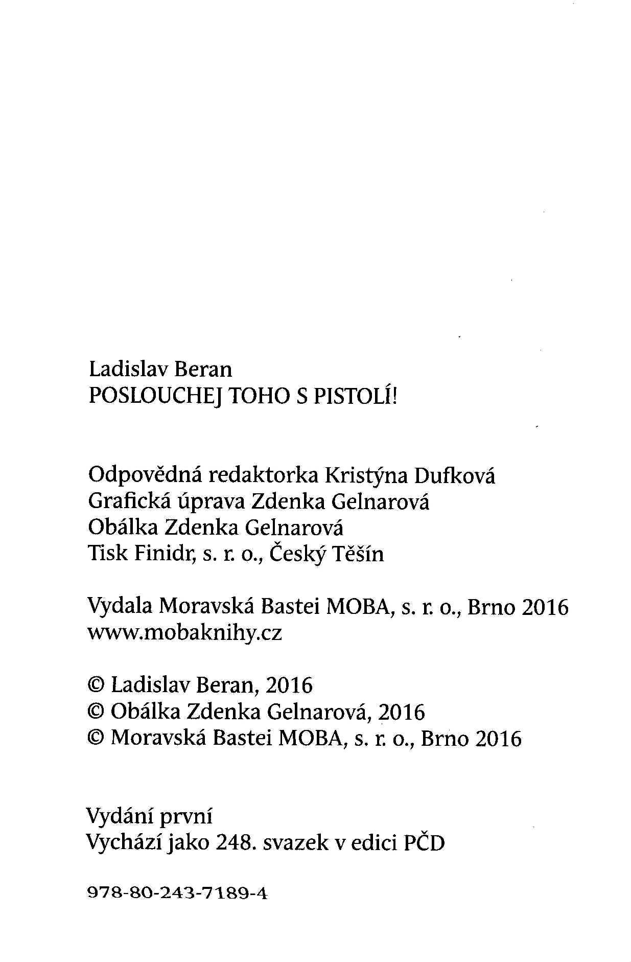 1. Názvové údajePoslouchej toho s pistolí! / Ladislav Beran ; grafická úprava Zdenka Gelnarová ; obálka Zdenka Gelnarová
