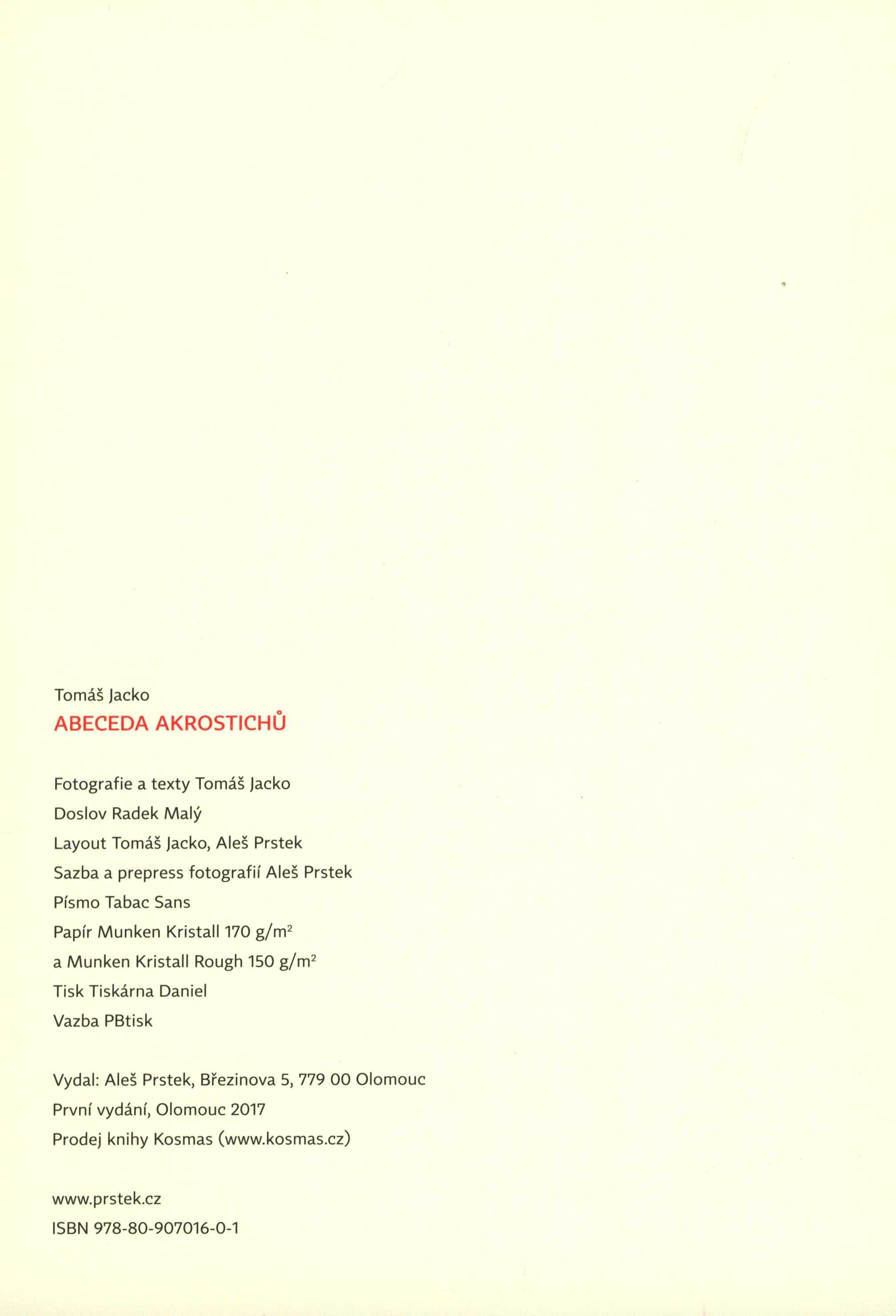 Názvové údaje Abeceda akrostichů / Tomáš Jacko ; fotografie a texty Tomáš Jacko ; doslov Radek Malý Osobní jméno Jacko, Tomáš, 1978- (Autor) (Fotograf) Další autoři Malý, Radek, 1977- (Autor doslovu, tiráže atd.) Korp. Nakladatelství Aleš Prstek (Nakladatel, vydavatel) Tiskárna Daniel (Tiskař) Údaje o vydání První vydání Nakladatel Olomouc : Aleš Prstek, 2017 Výrobce Tiskárna Daniel Rozsah 67 stran : ilustrace ; 2017 ISBN 978-80-907016-0-1 (vázáno) Země vyd. Česko Jazyk dok. čeština Poznámky Černý a červený tisk. - Černobílé fotografie.