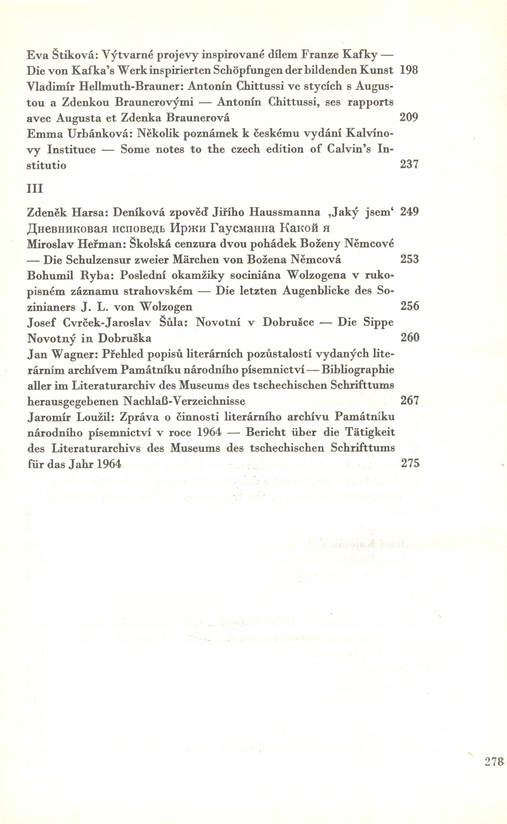 - Názvové údaje - Literární archív : sborník Památníku národního písemnictví = Sbornik Muzeja češskoj pis'mennosti = Jahrbuch des Museums des tschechischen Schrifttums = Annuel of the Museum of the Czech Literature = Mémoires du Musée de la Littérature Tchèque / odpovědný redaktor Jaromír Loužil ; obálku navrhl Zbyněk Sekal - Další autoři - Loužil, Jaromír, 1926-2013 (Editor) - Sekal, Zbyněk, 1923-1998 (Autor obálky) - Korp. - Památník národního písemnictví (muzeum literatury) (Nakladatel, vydavatel) - Orbis (nakladatelství a vydavatelství) (Nakladatel, vydavatel) - Mír, novinářské závody (tiskárna) (Tiskař) - Roč., číslo - 1, 1966 - Údaje o vydání - 1. vydání - Nakladatel - Praha : Orbis, 1966 - Výrobce - Mír, nov. záv., n. p., závod 1 - Rozsah - 278 stran, 16 nečíslovaných stran obrazových příloh : faksimile, ilustrace ; 24 cm - ISBN - (Brožováno) - Země vyd. - Česko - Jazyk dok. - čeština - Poznámky - Zdob. obálka. - Čb. faksimile a ilustrace v obrazové příloze. - Resumé anglicky, německy, francouzsky a rusky. - Zpráva o činnosti Literárního archívu Památníku národního písemnictví v roce 1964 na str. 275-278. - 1200 výtisků