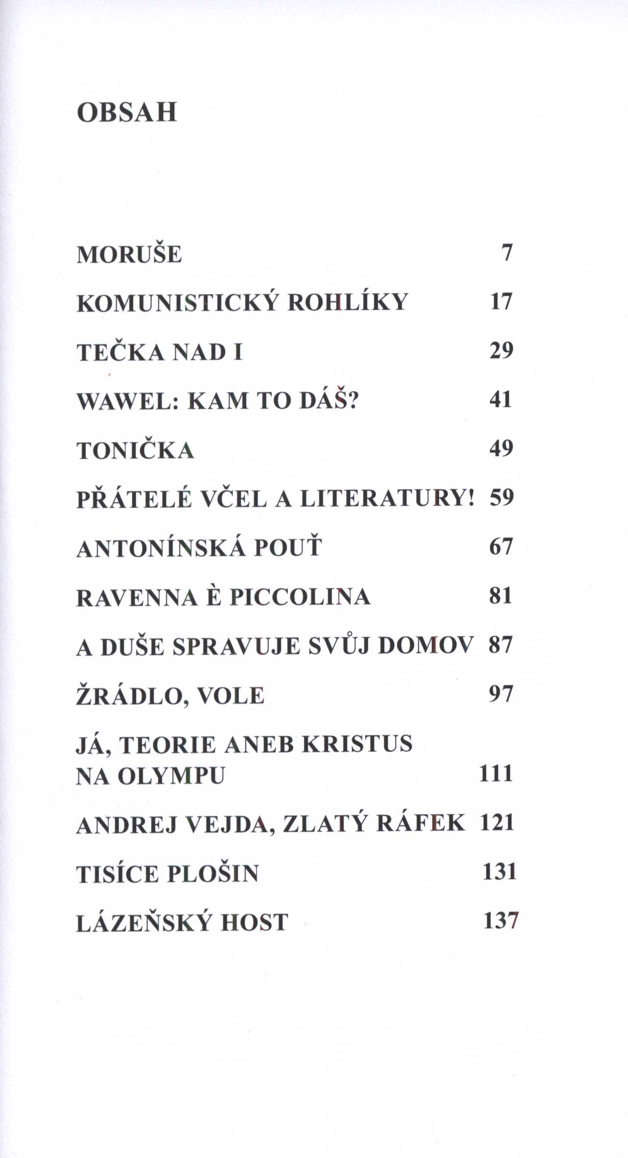 Čtrnáct, poměrně stručných povídek, se vrací převážně do doby komunismu. Texty nezapřou jistou autobiografičnost. Už úvodní povídka Moruše překypuje ambivalencí: evokuje šťastné dětství orámované nejprve dvorkem na hraní, důlkem na kuličky a nádhernou moruší, aby posléze strom ustoupil plynovodu, dvůr se napůl rozbořil a do Československa vpadla vojska Varšavské smlouvy.
