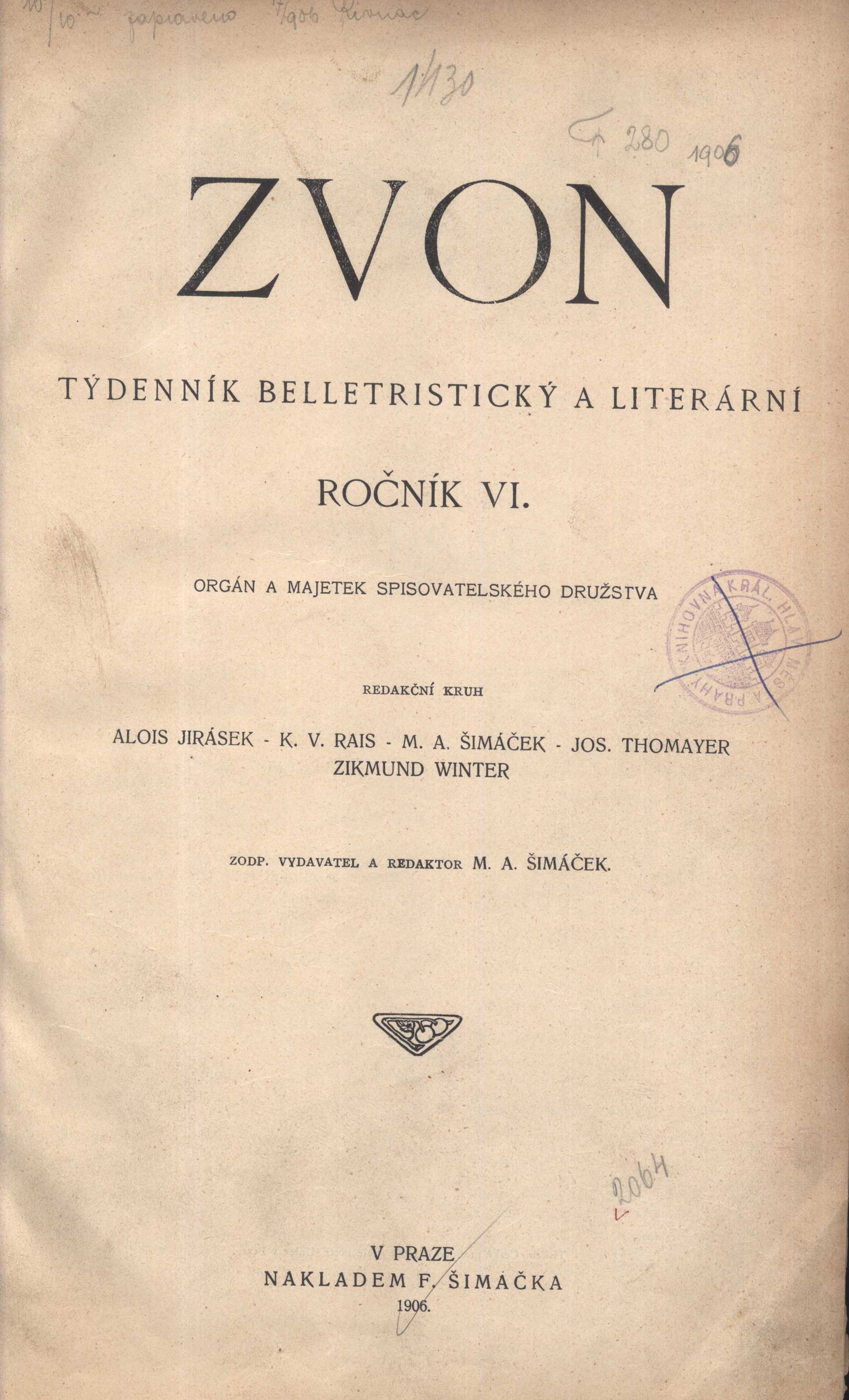Názvové údaje Zvon : týdenník belletristický a literární Další autoři Šimáček, Matěj Anastasia, 1860-1913 (Nakladatel, vydavatel) (Redaktor, výkonný redaktor) Korp. Česká grafická akciová společnost Unie (v Praze) (Tiskař) Roč., číslo Ročník 6, číslo 1-52, 1905/1906 Nakladatel V Praze : nákladem F. Šimáčka, 1905-1906 Výrobce Tiskem České grafické akciové společnosti "Unie" Rozsah 796 stran ; 29 cm Země vyd. Česko Jazyk dok. čeština Poznámky Zdobené záhlaví každého čísla