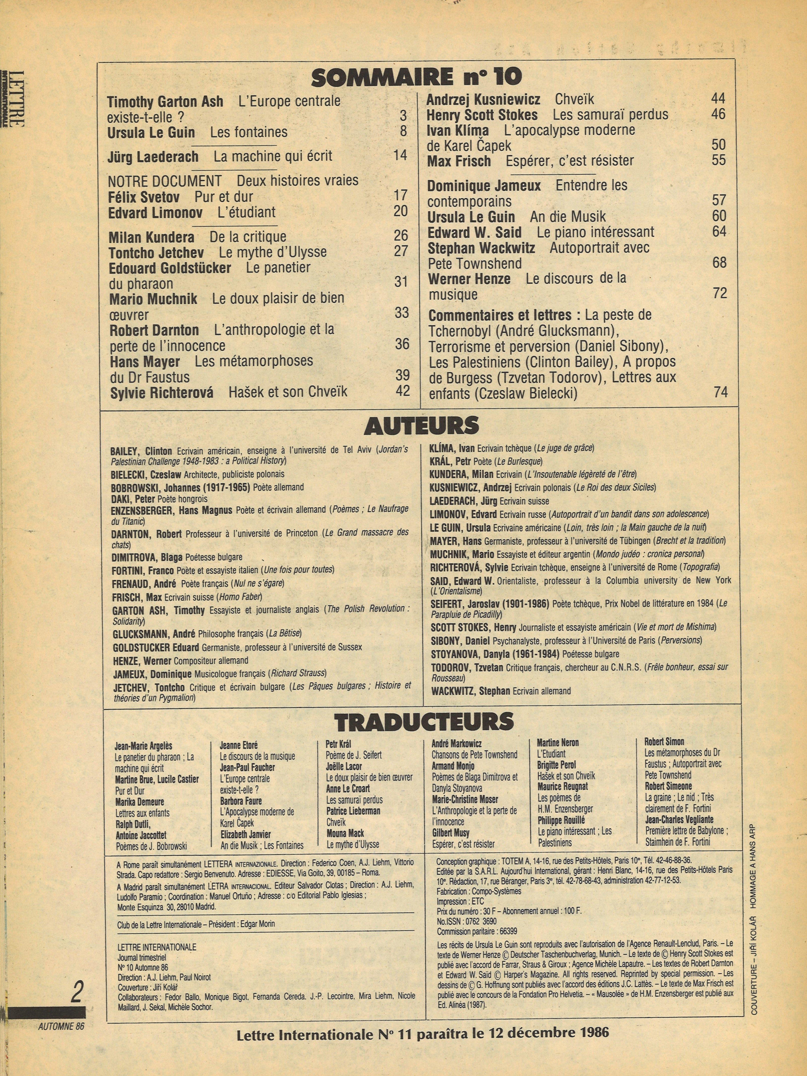Názvové údaje Lettre internationale Další autoři Liehm, A. J. (Antonín Jaroslav), 1924-2020 (Šéfredaktor, odpovědný redaktor) Noirot, Paul, 1923-2010 (Šéfredaktor, odpovědný redaktor) Kolář, Jiří, 1914-2002 (Autor obálky) Roč., číslo 10, 1986 Nakladatel Paris : Aujourd'hui international, 1986 Rozsah ilustrace ; 37 cm ISSN 0762-3690 Země vyd. Francie Jazyk dok. francouzština Poznámky Barevné obálky. - Čb. ilustrace.