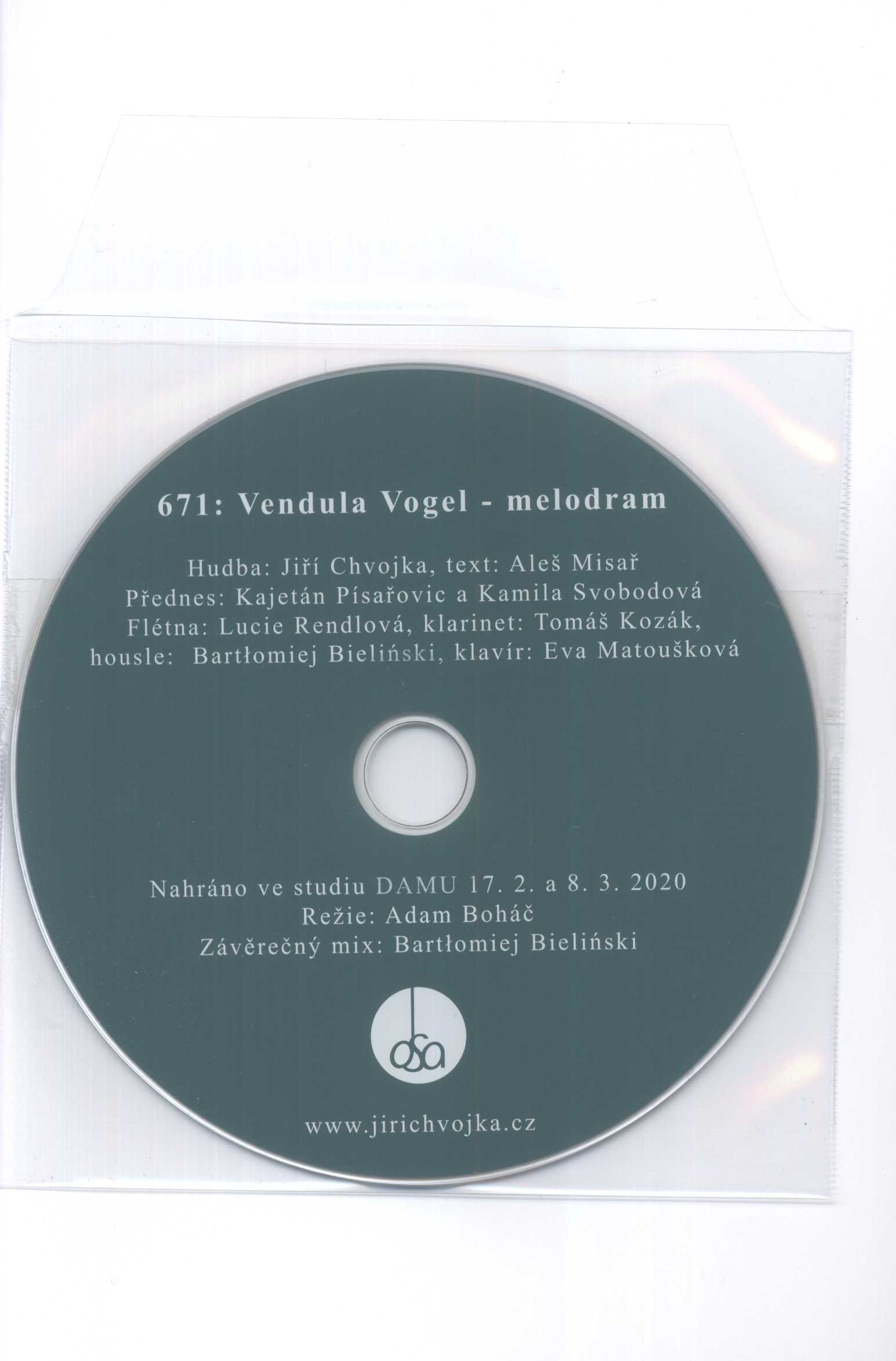 Vendula Vogel a jiné básně / Aleš Misař ; ilustrace Eliška Měrková ; obálka s použitím kresby Elišky Měrkové a grafická úprava Kateřina Marinová. -- Vydání 1. -- Praha : KAMPE, 2020. -- Horoměřice : powerprint s.r.o. -- 109 stran : barevné ilustrace ; 21 cm + CD-ROM. -- Obálka s barevnou ilustrací, bílý text. - Obsah. - Celostránkové barevné ilustrace. - Doslov K. Prince. - Na rubu zadní strany obálky vlepeno průsvitné pouzdro s CD. -- Obsahuje též: Součástí této básnické sbírky je CD obsahující melodram „671: Vendula Vogel“. Hudba: Jiří Chvojka, text: Aleš Misař, přednes: Kajetán Písařovic a Kamila Svobodová, klavír: Eva Matoušková, flétna: Lucie Rendlová, klarinet: Tomáš Kozák; housle: Bartłomiej Bieliński. -- Resumé: Kniha Vendula Vogel a jiné básně zahrnuje desítku delších básní vzniklých příznačně v rozmezí let 2010-2020. -- ISBN : 978-80-7606-019-7 (brožováno).