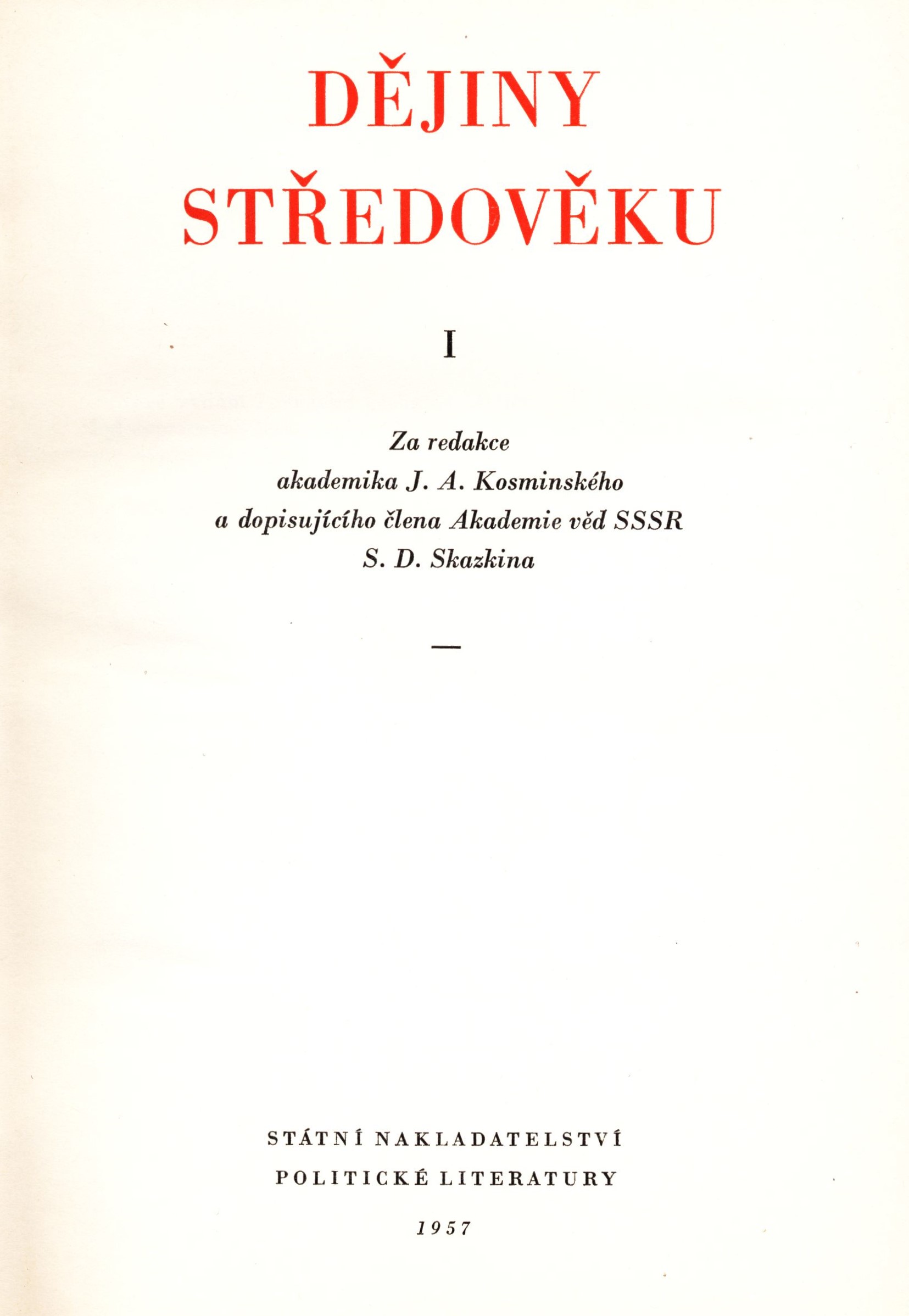 $a Dějiny středověku. $n I / $c za redakce J. A. Kosminského a S. D. Skazkina ; přeložili Václav Kubín a Milica Steinová ; verše přeložil B. Franěk ; obálku navrhl Milan Hegar ; graficky upravil Oldřich Nindl