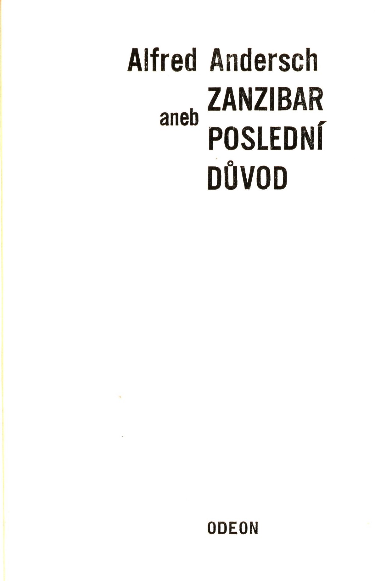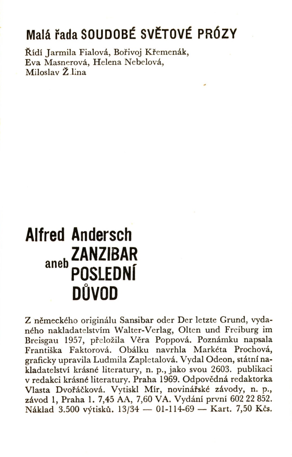 Názvové údaje Zanzibar aneb Poslední důvod / Alfred Andersch ; z německého originálu Sansibar oder Der letzte Grund ... přeložila Věra Poppová ; poznámku napsala Františka Faktorová ; obálku navrhla Markéta Prochová ; graficky upravila Ludmila Zapletalová Osobní jméno Andersch, Alfred, 1914-1980 (Autor) Další autoři Poppová, Věra, 1926-1989 (Překladatel) Faktorová, Františka, 1926-1997 (Autor doslovu, tiráže atd.) Prochová, Markéta (Autor obálky) Zapletalová, Ludmila (Knižní grafik) Korp. Odeon (nakladatelství) (Nakladatel, vydavatel) Mír, novinářské závody (tiskárna) (Tiskař) Údaje o vydání vydání první Nakladatel Praha : Odeon, [1969] Výrobce Mír, novinářské závody, n.p. Copyright ©1957 Rozsah 174 stran ; 17 cm ISBN (brožováno) Edice Soudobá světová próza. Malá řada